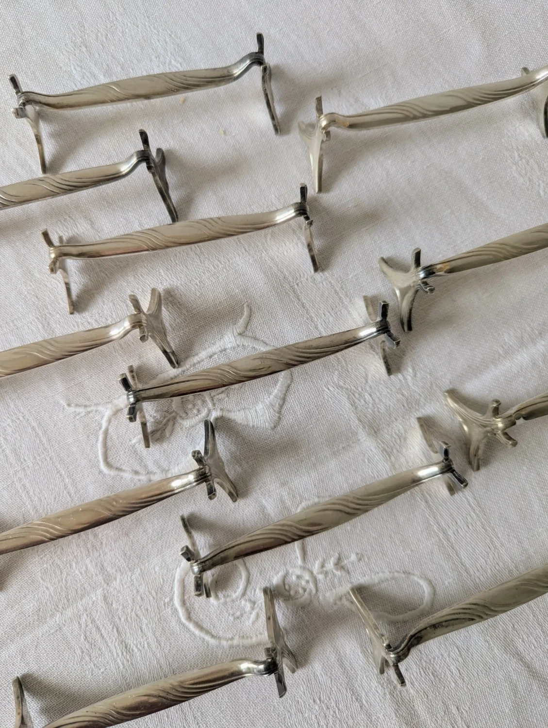 Chaque pièce mesure environ 8,5 cm de long pour 2 cm de haut. L’argenture, nettoyée et lustrée avec soin, présente un éclat homogène et brillant. Le dessin finement ciselé révèle un décor de lignes torsadées, typique du style sobre et raffiné de la période 1900-1915.