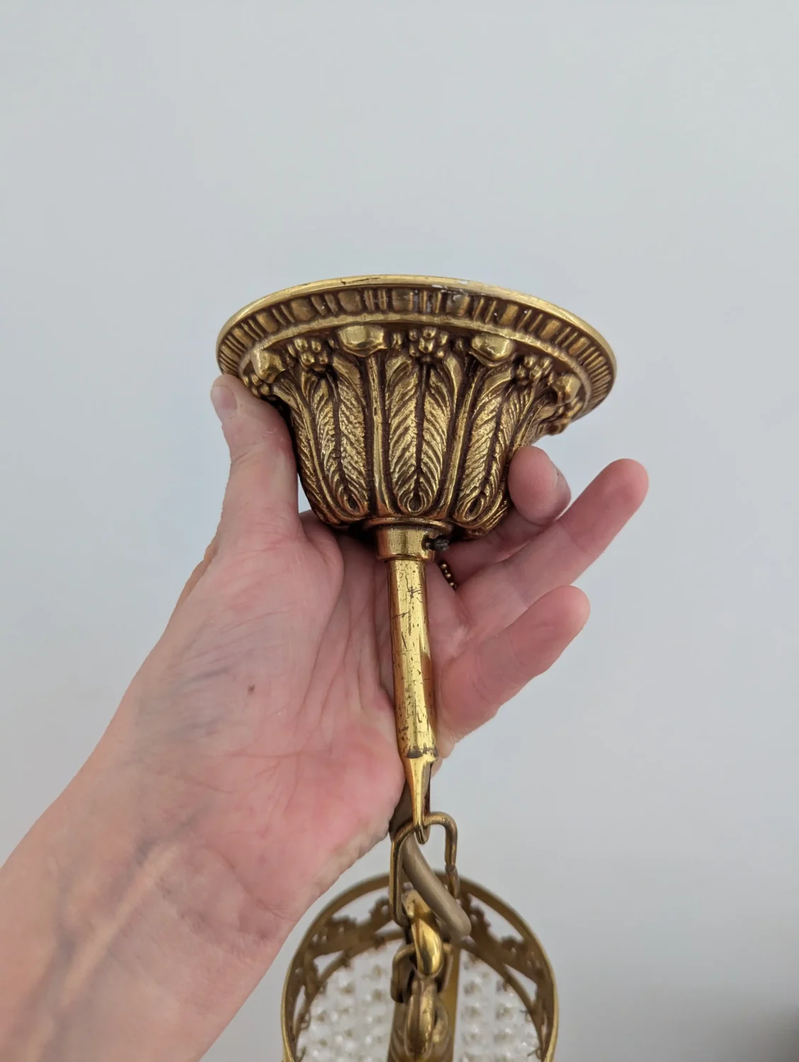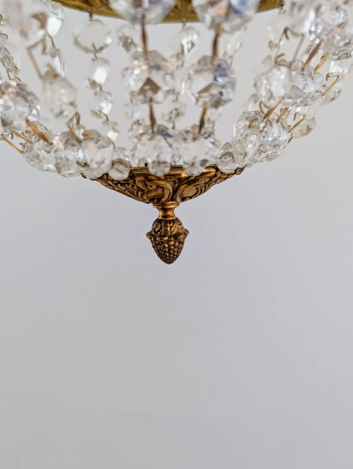 Chez Villa Brieg, nous croyons que chaque pièce chinée a une histoire à raconter. Ce lustre, nettoyé avec soin, en est d’ailleurs un parfait exemple. Son armature en métal doré, légèrement patinée par le temps, contraste merveilleusement avec les rangées de pampilles qui forment un globe élégant, comme une montgolfière prête à s’envoler.