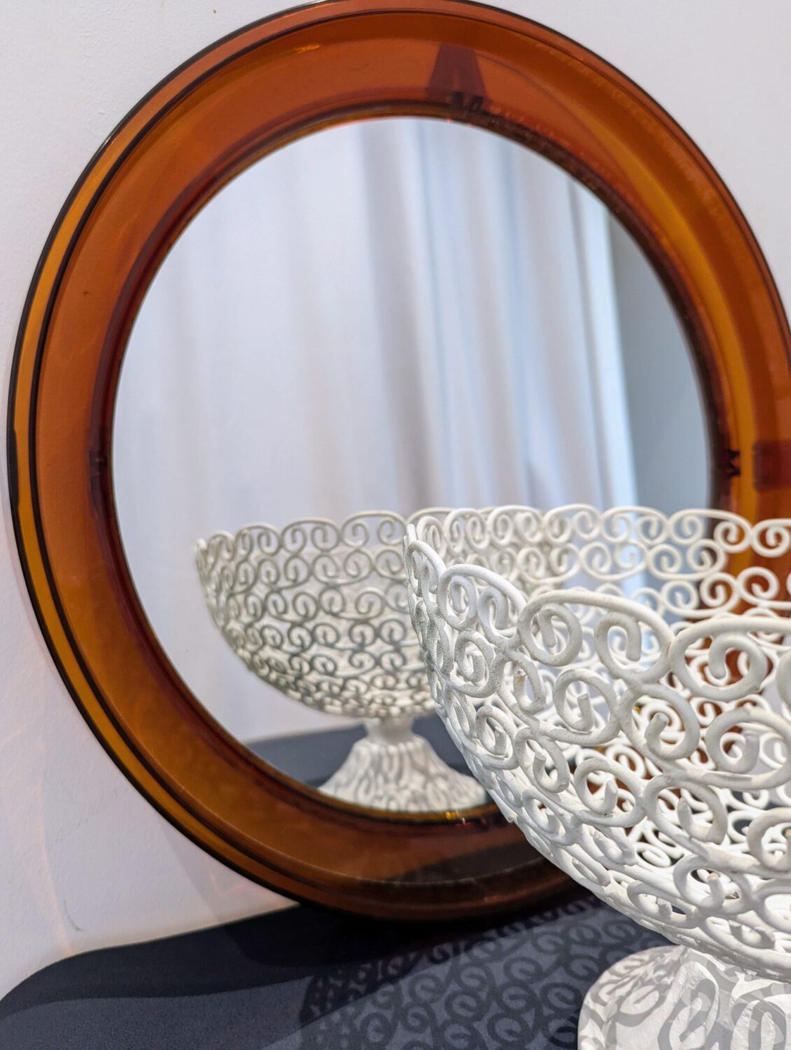 Ce miroir rond vintage en plexiglas orange transparent incarne parfaitement l’esprit audacieux des années 1980. Son design graphique attire immédiatement l’œil. Son cadre teinté orange laisse aussi passer la lumière, créant un halo chaleureux sur les murs qui l’entourent. La transparence du matériau amplifie cet effet lumineux et lui donne un look résolument unique.