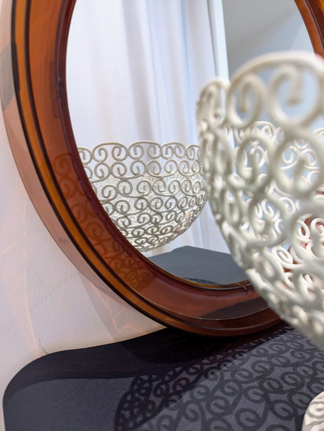 Le miroir mesure 50 cm de diamètre total, avec une surface réfléchissante de 40 cm. Ses proportions généreuses en font d’abord un véritable objet décoratif à part entière. Que ce soit dans une entrée, un salon ou une chambre, il attire la lumière et donne du relief aux murs. Ce n’est pas simplement un miroir. C’est une pièce de caractère, capable de transformer l’ambiance d’une pièce par sa simple présence.