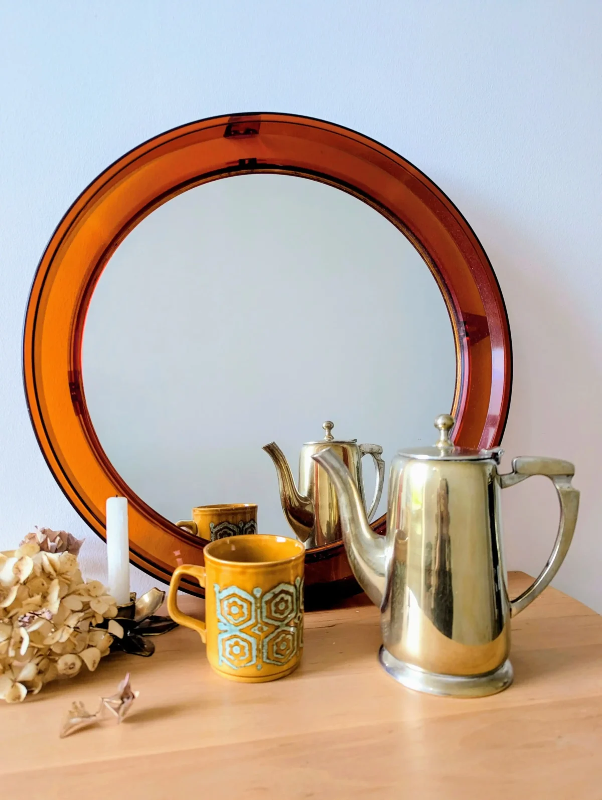 Miroir rond en plexiglas orange transparent, pièce rétro chic au caractère assumé.