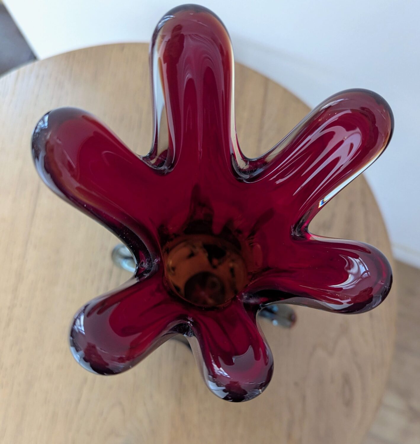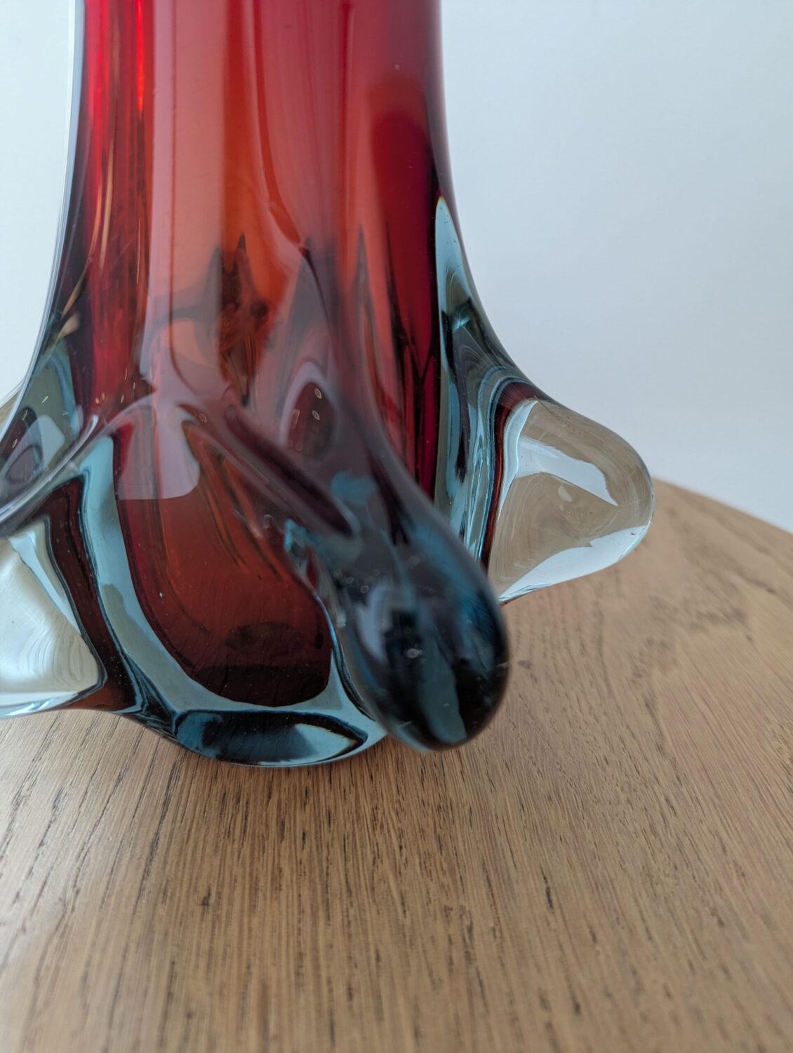 A beautiful harmony of intense red and azure blue emanates from this highly decorative piece.