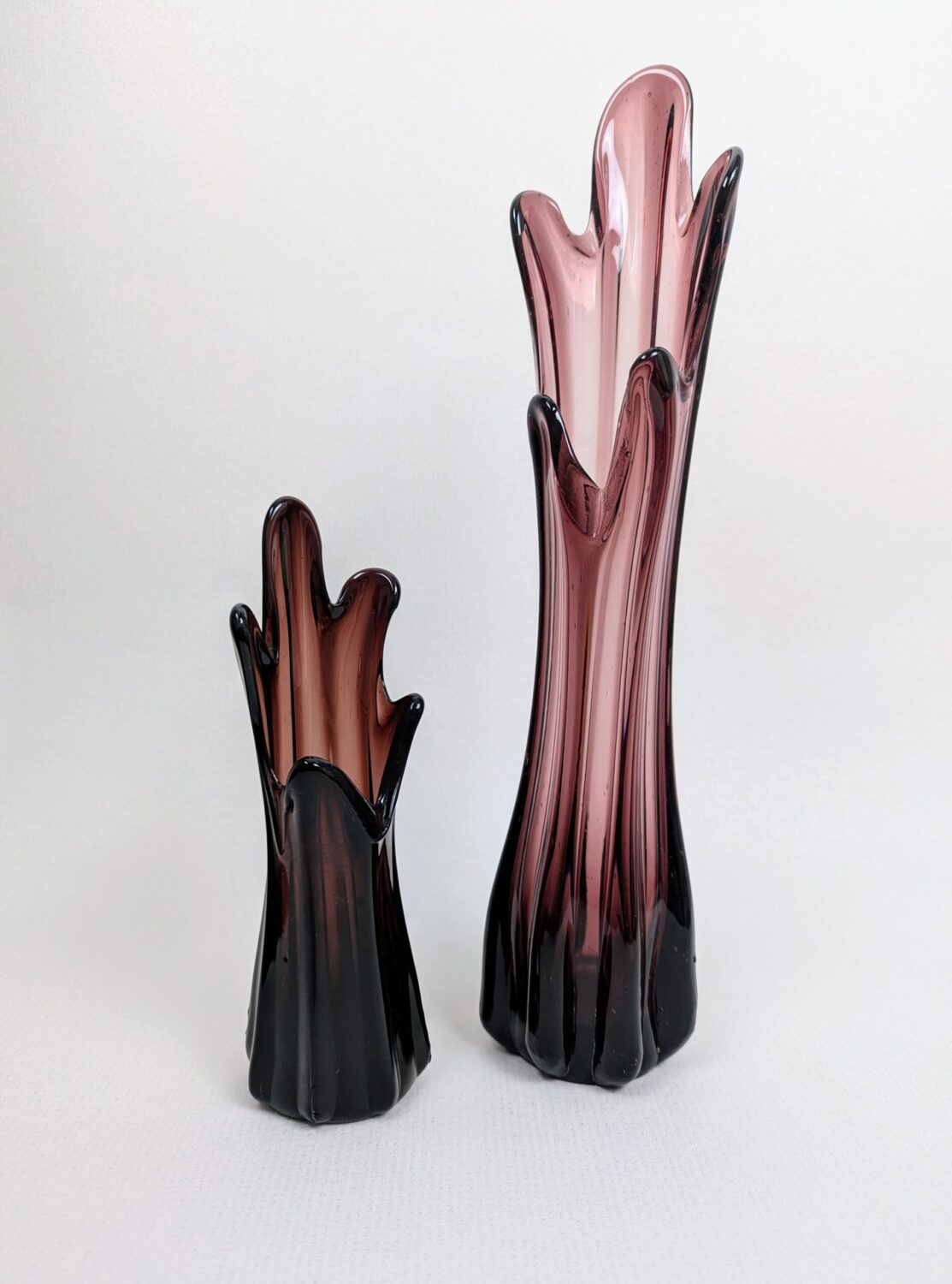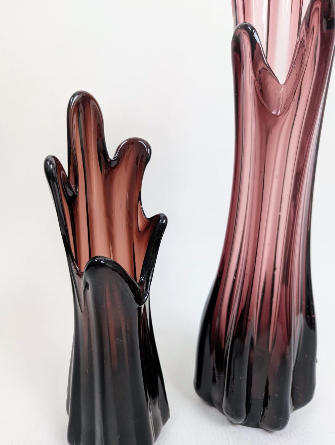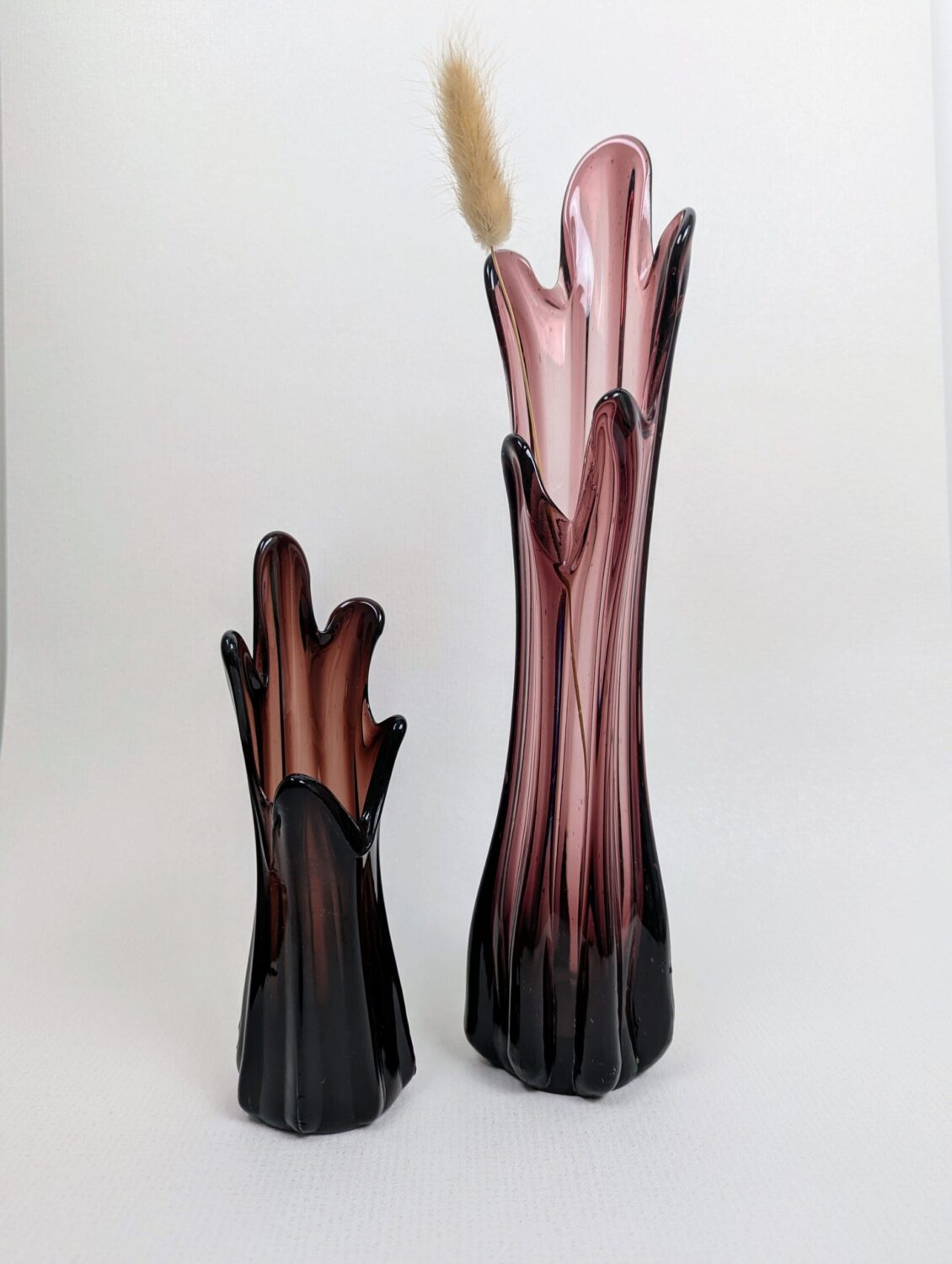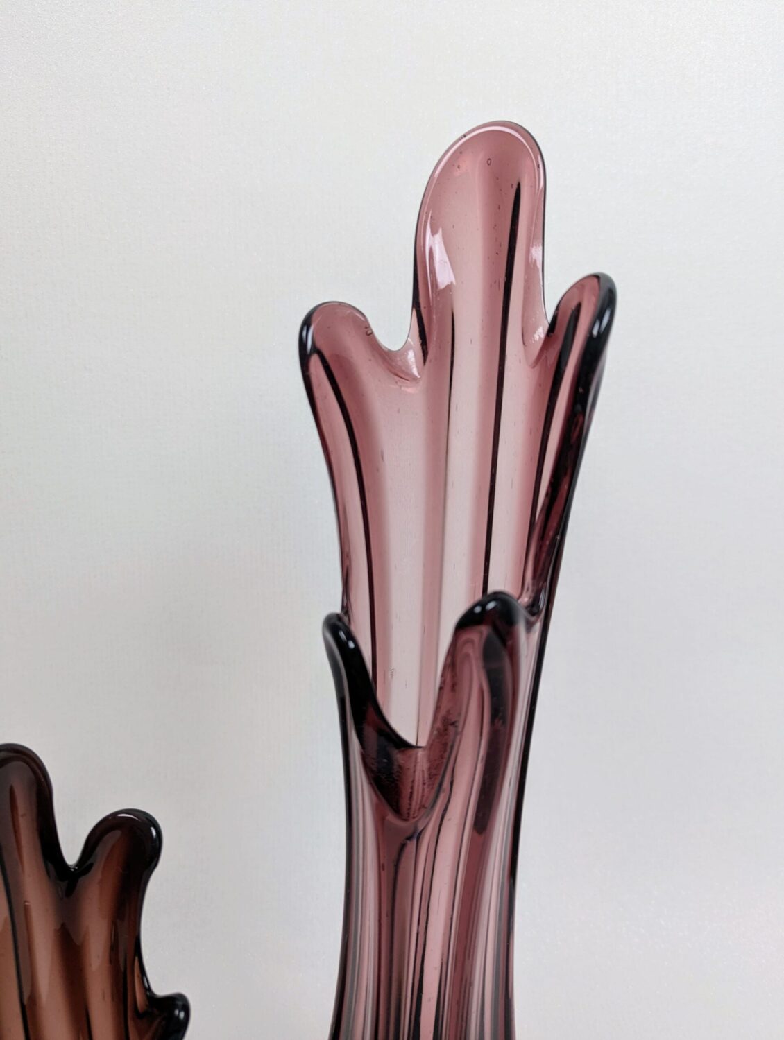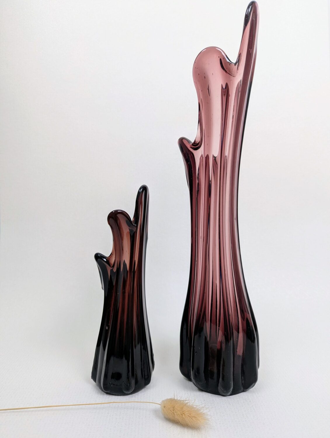 Paire de Vases à Cinq Doigts : verrerie soufflée parme au style vintage élégant