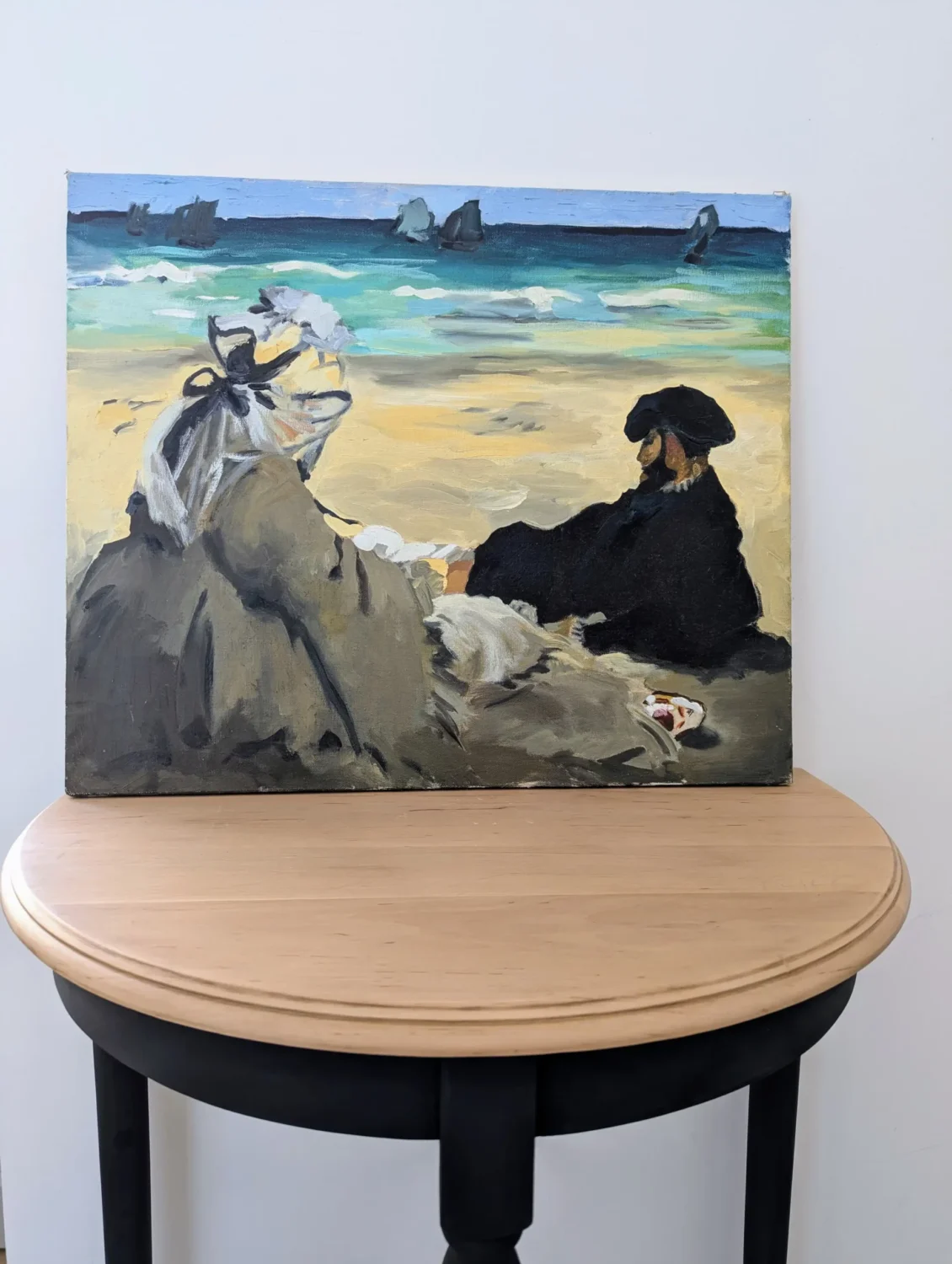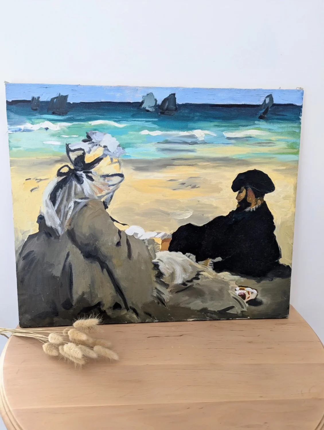 Très belle Peinture sur toile de reproduction de Manet Edouard de l’oeuvre « Sur la plage » (1873). Un tableau plein de poésie pour une déco raffinée.