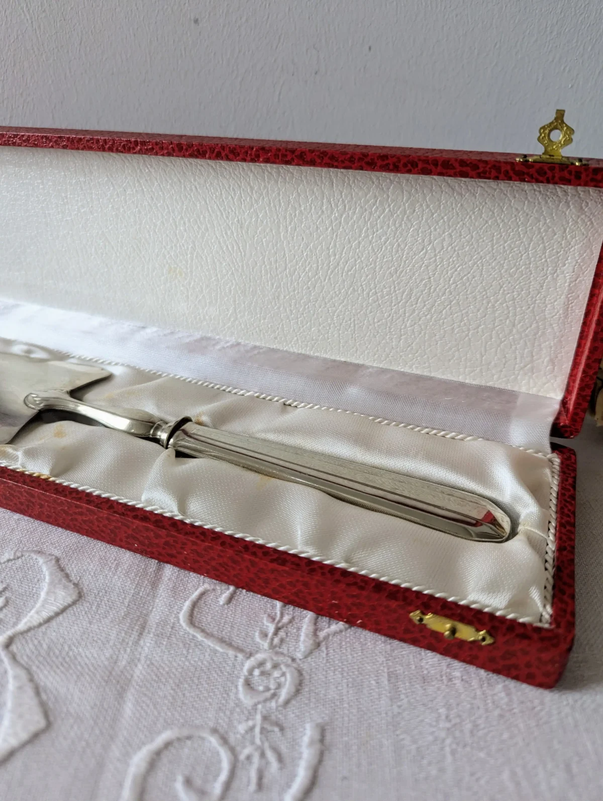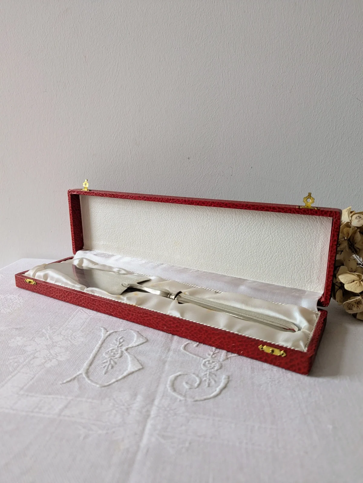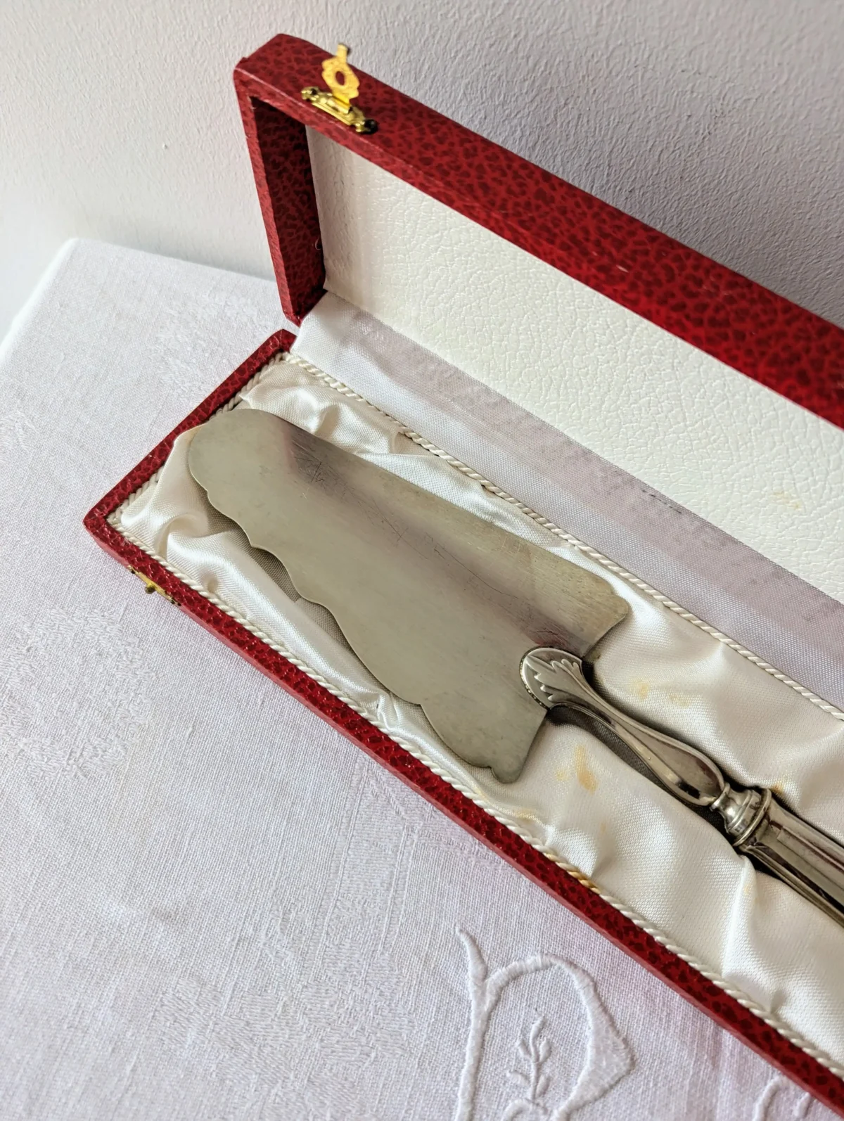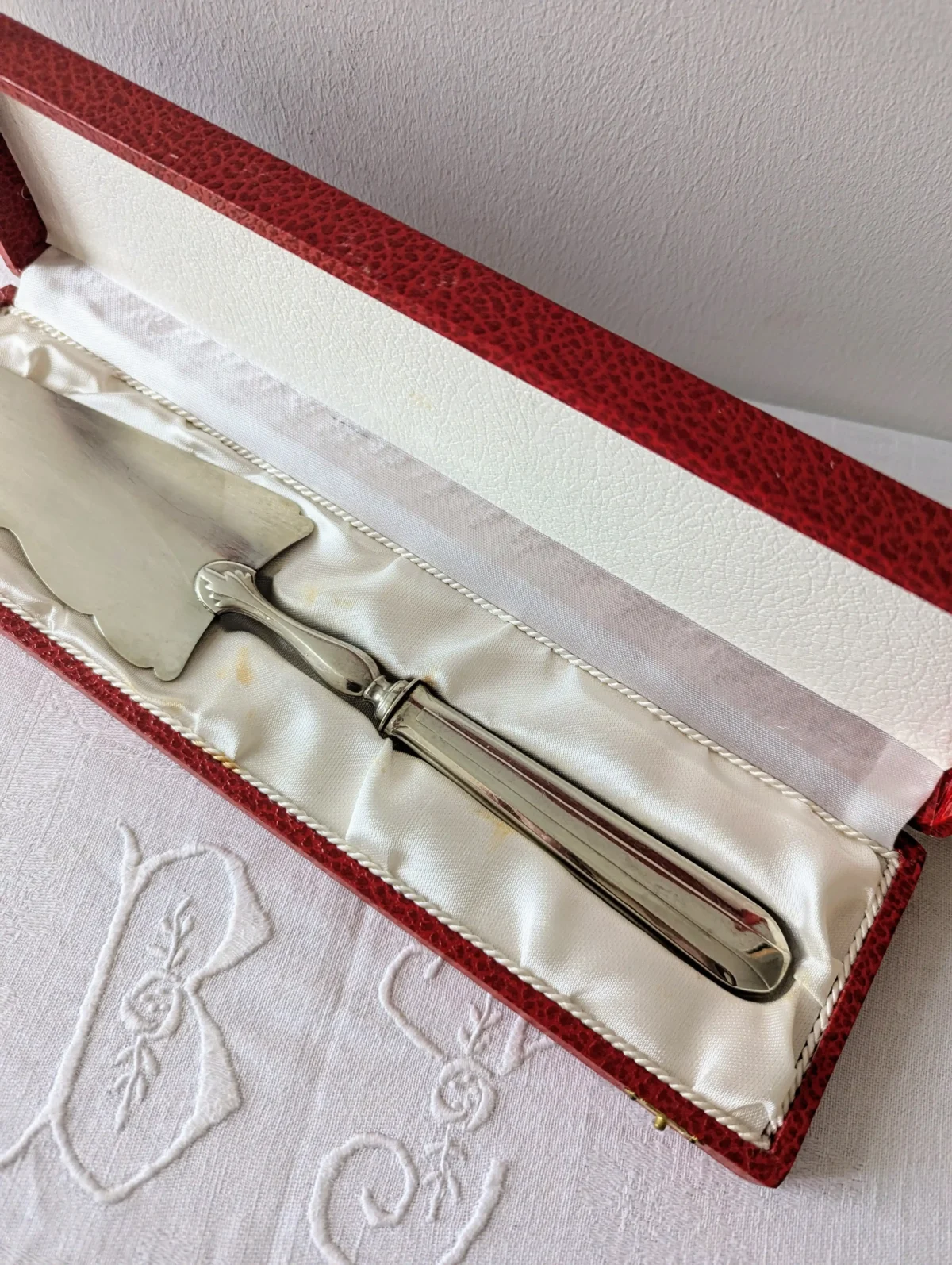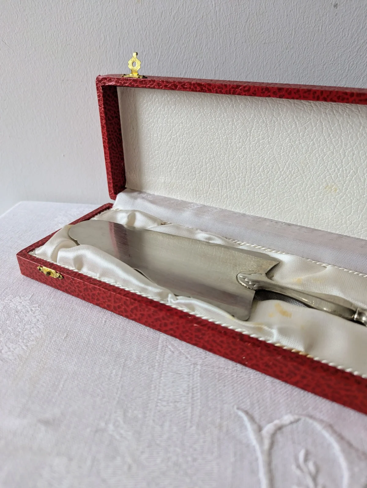 L’ustensile repose dans son écrin d’origine, recouvert d’un revêtement rouge à l’aspect cuir. L’intérieur en satin blanc met la pelle en valeur et offre un bel écrin de rangement. Ce coffret protège la pièce entre deux utilisations et permet aussi de la présenter comme un cadeau raffiné. Quelques marques d’usage discrètes apparaissent sur le métal et sur le satin. Elles restent légères et renforcent le charme du vintage sans nuire à la qualité d’ensemble.