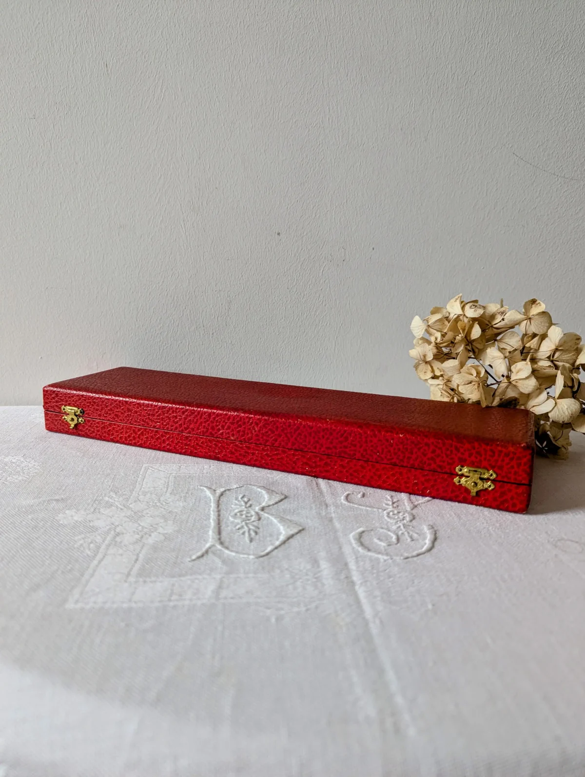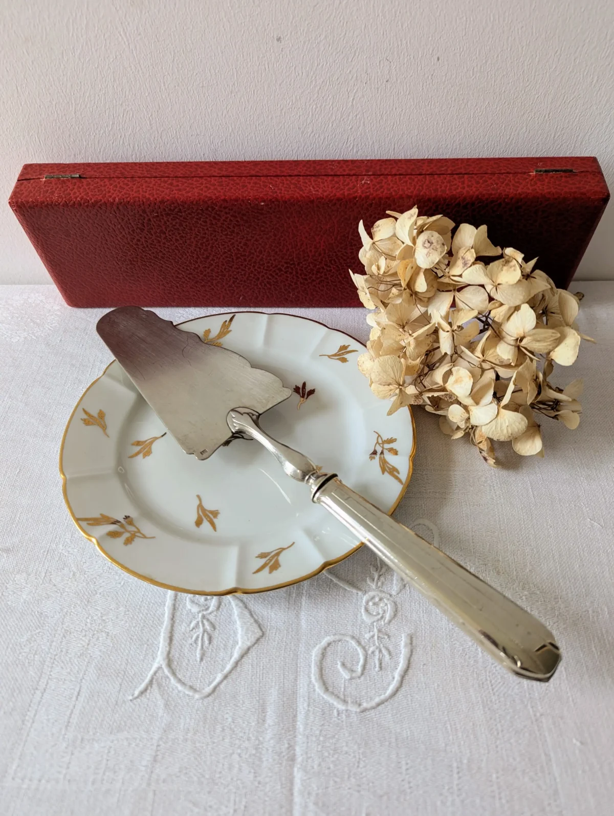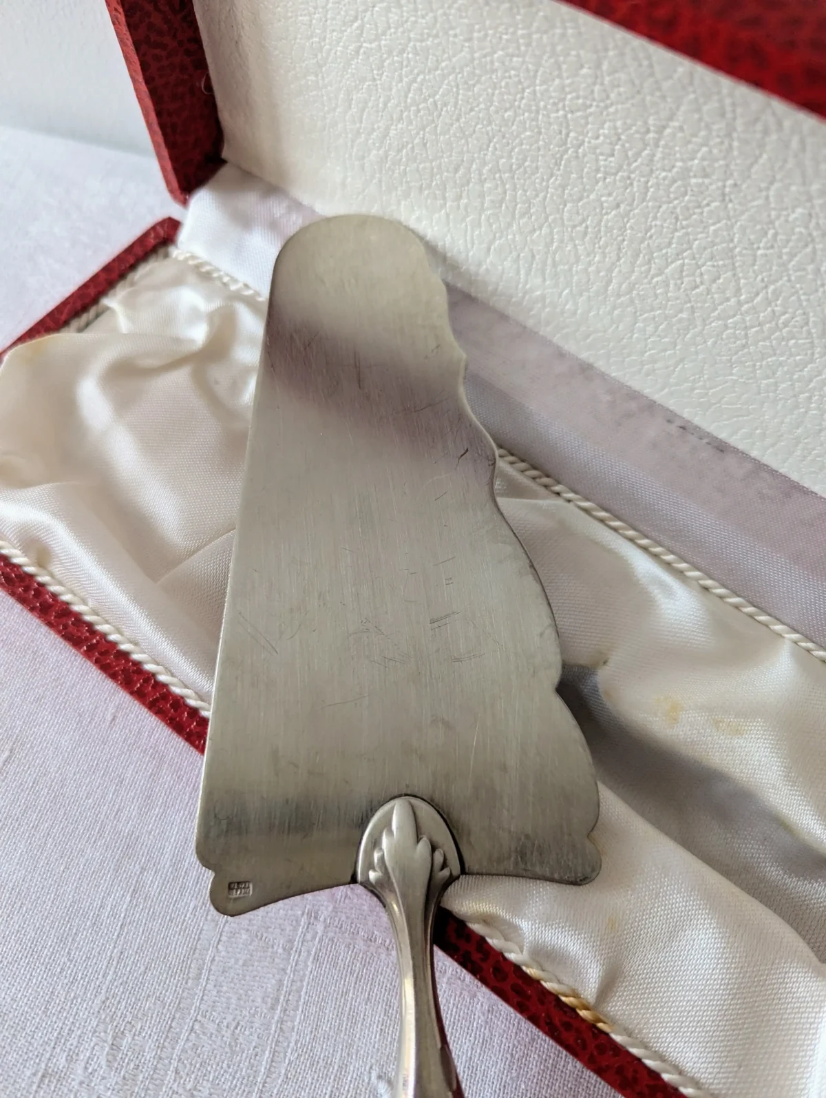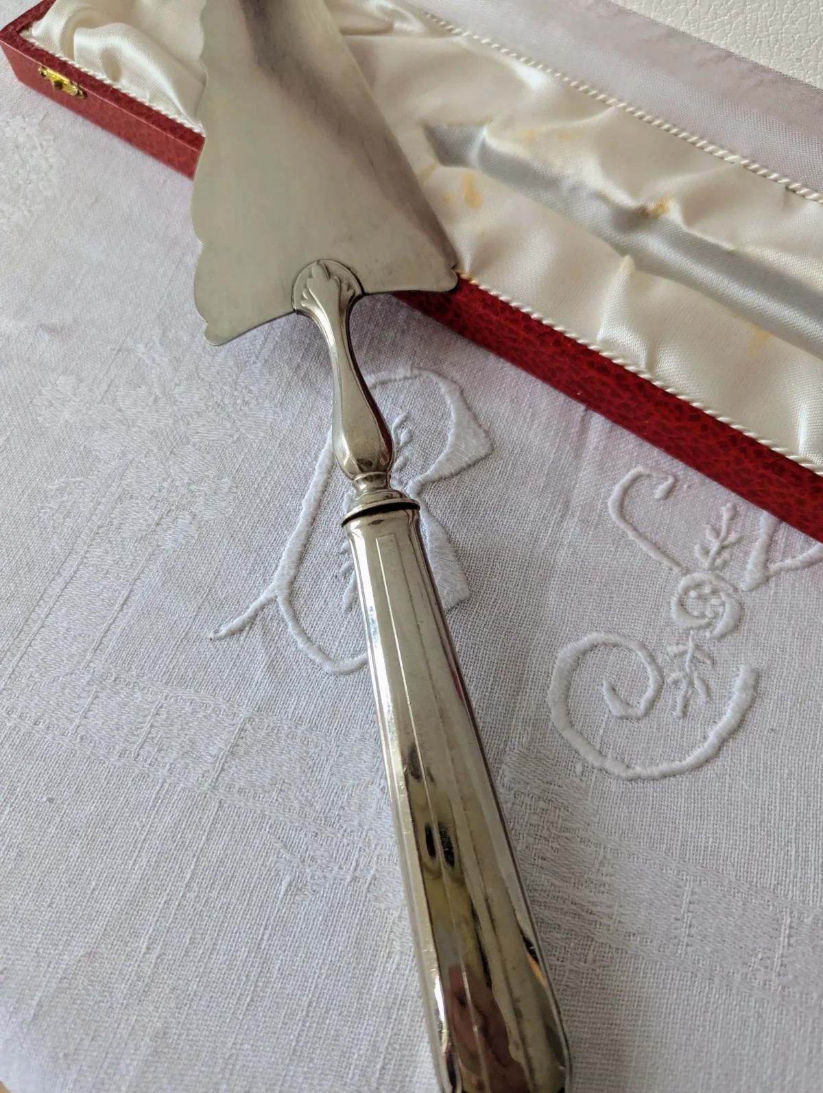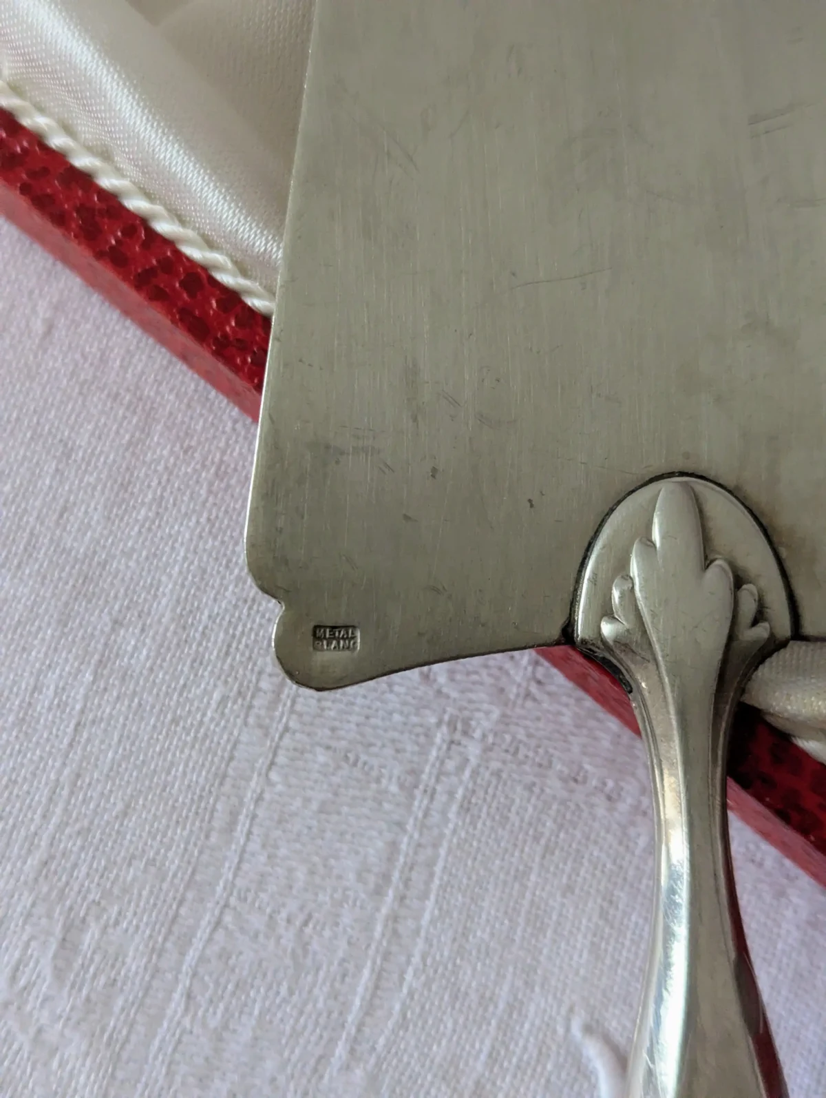 L’ustensile repose dans son écrin d’origine, recouvert d’un revêtement rouge à l’aspect cuir. L’intérieur en satin blanc met la pelle en valeur et offre un bel écrin de rangement. Ce coffret protège la pièce entre deux utilisations et permet aussi de la présenter comme un cadeau raffiné. Quelques marques d’usage discrètes apparaissent sur le métal et sur le satin. Elles restent légères et renforcent le charme du vintage sans nuire à la qualité d’ensemble.