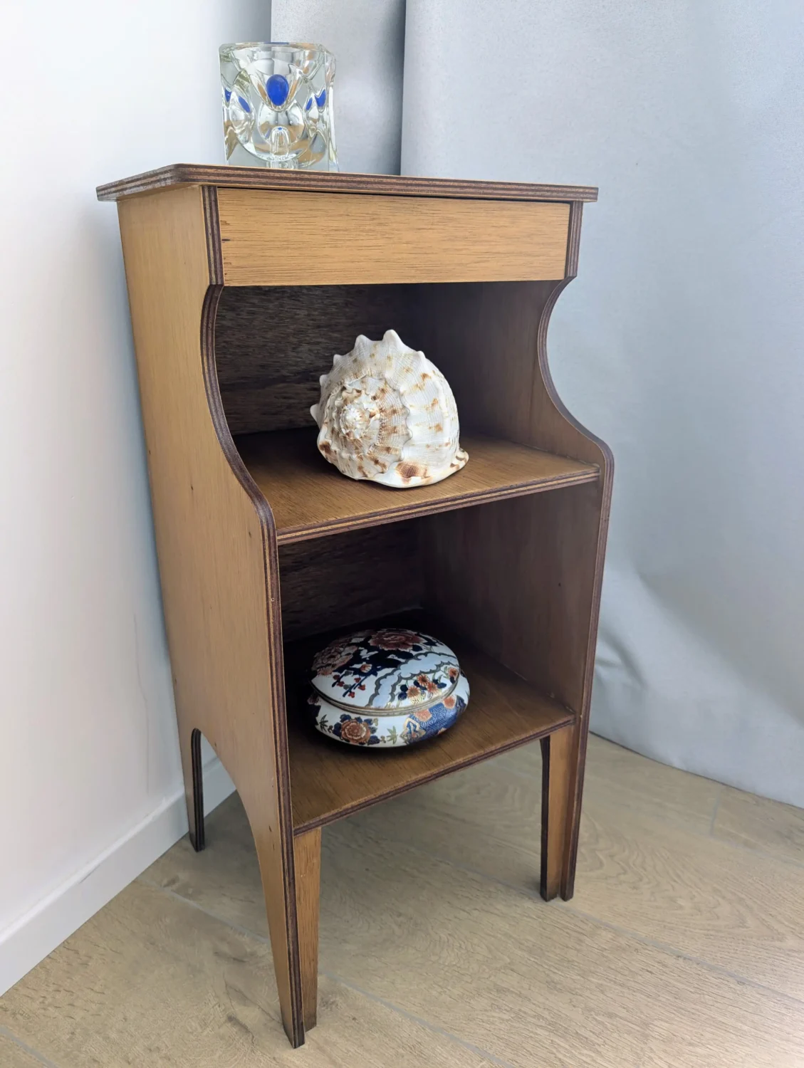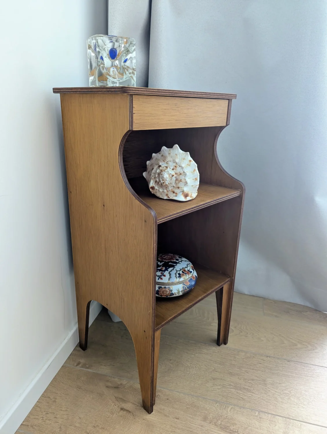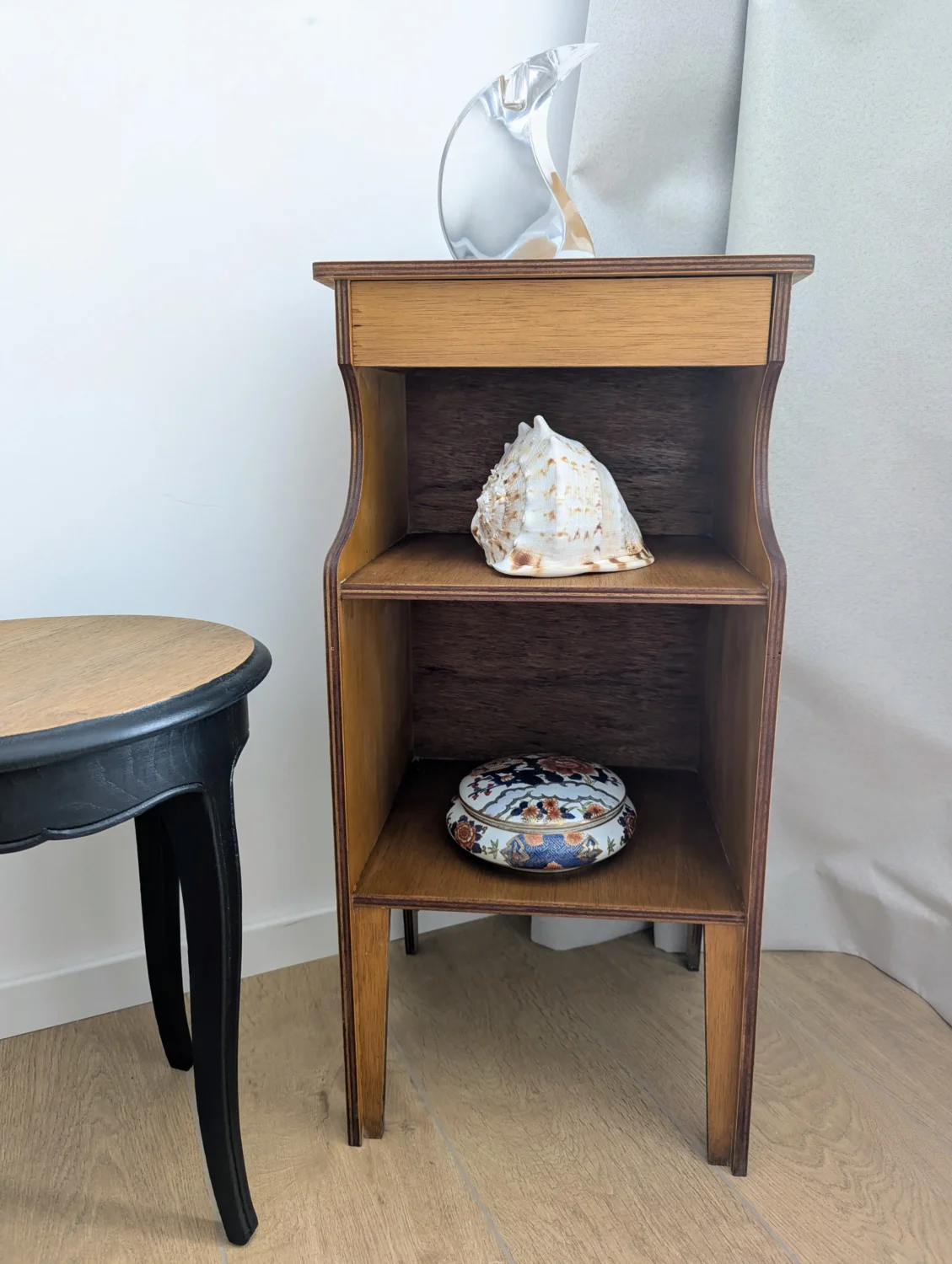 Dès le premier regard, ce petit meuble en bois vintage capte l’attention grâce à sa ligne épurée et son format compact. En effet, il associe avec équilibre fonctionnalité et esthétisme, notamment grâce à son tiroir discret et ses deux niches ouvertes. De plus, son design sobre, souligné par des courbes douces sur les côtés, s’adapte sans difficulté à tous les styles d’intérieur, qu’ils soient contemporains, rétro ou bohèmes.
