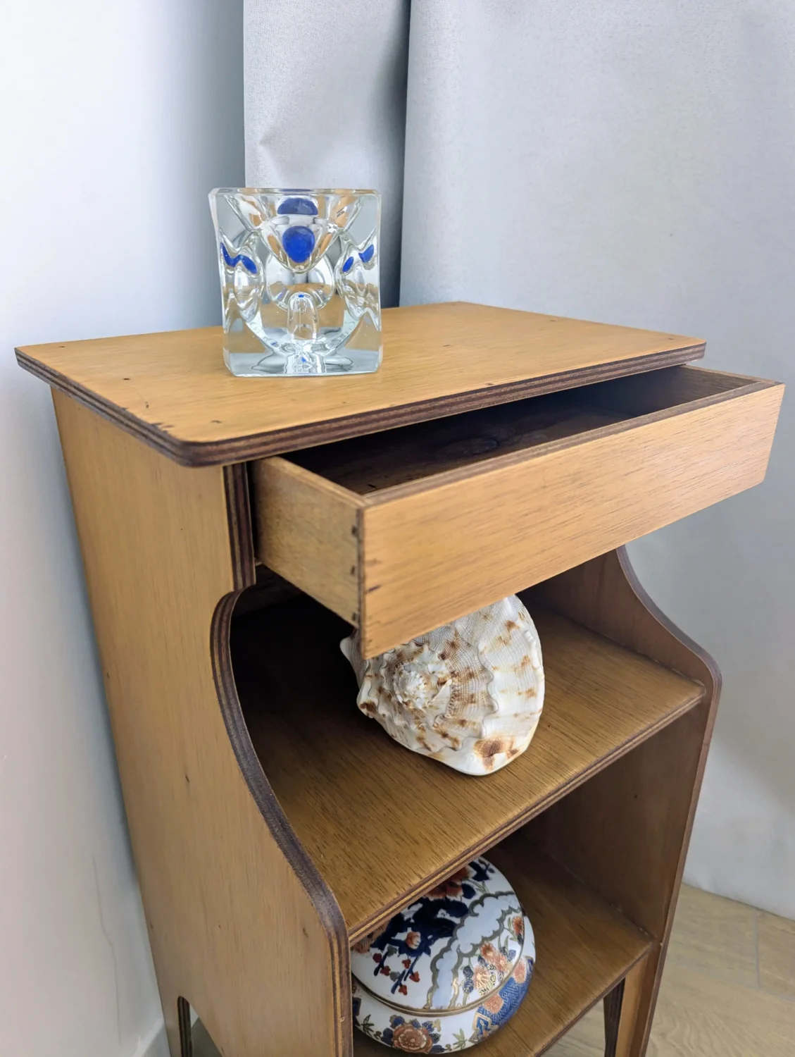 Grâce à ses dimensions réduites, ce meuble trouve sa place aussi bien en table de chevet qu’en bout de canapé ou en rangement d’appoint dans une entrée. Par ailleurs, ses deux niches accueillent facilement des livres, des objets déco ou une petite lampe, ce qui augmente sa polyvalence. De son côté, le tiroir glisse avec fluidité et dissimule avec élégance les accessoires du quotidien. Ainsi, chaque élément reste accessible tout en préservant l’harmonie visuelle de l’espace.
