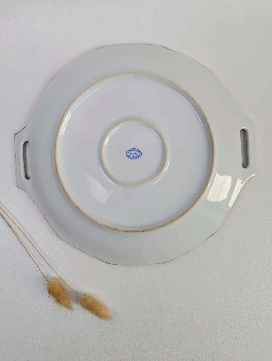 Ce plat à dessert en porcelaine ancienne de Limoges présente quelques légères pertes de dorure, notamment sur les anses. Cela n’enlève rien à sa beauté ni à son intégrité. Ces petites marques du temps participent à son authenticité. Elles rappellent que chaque objet vintage a une histoire, ce qui en fait une pièce unique.