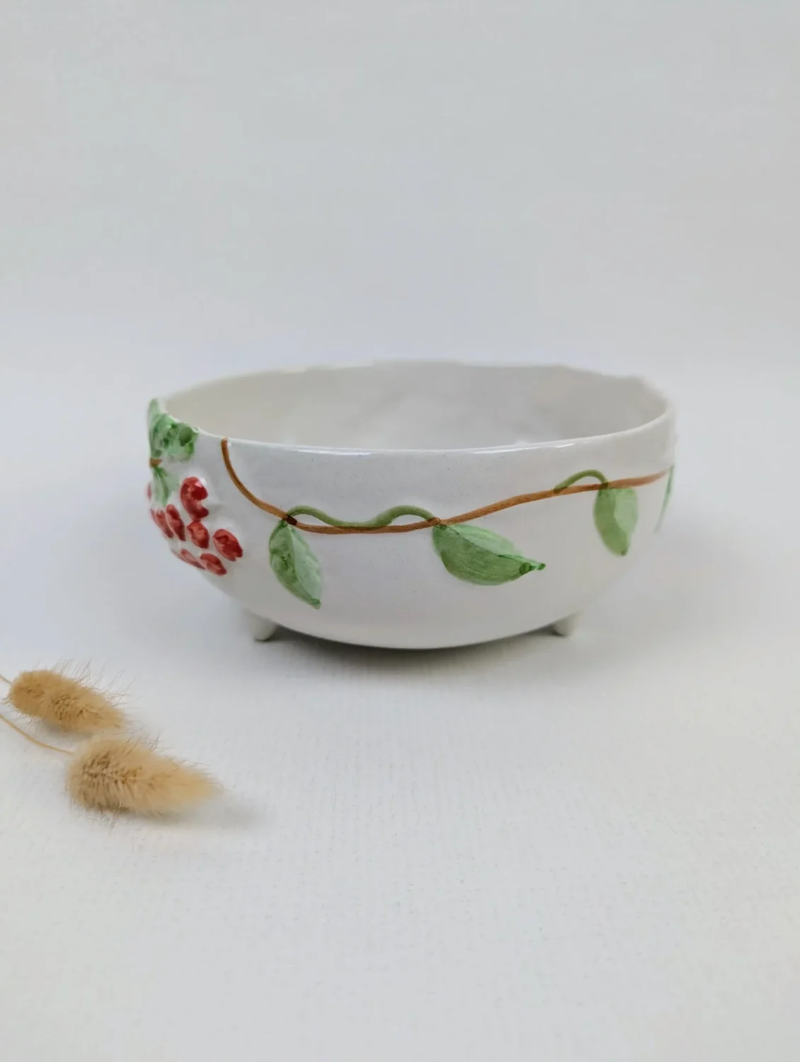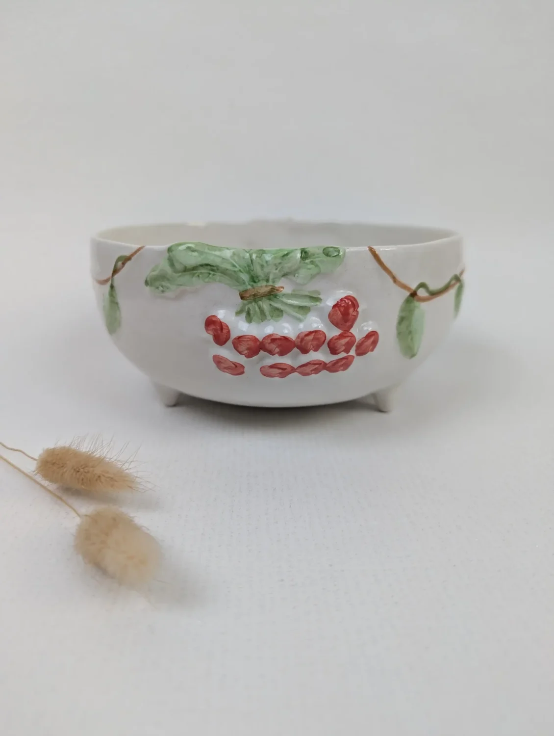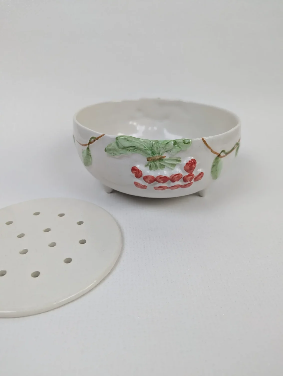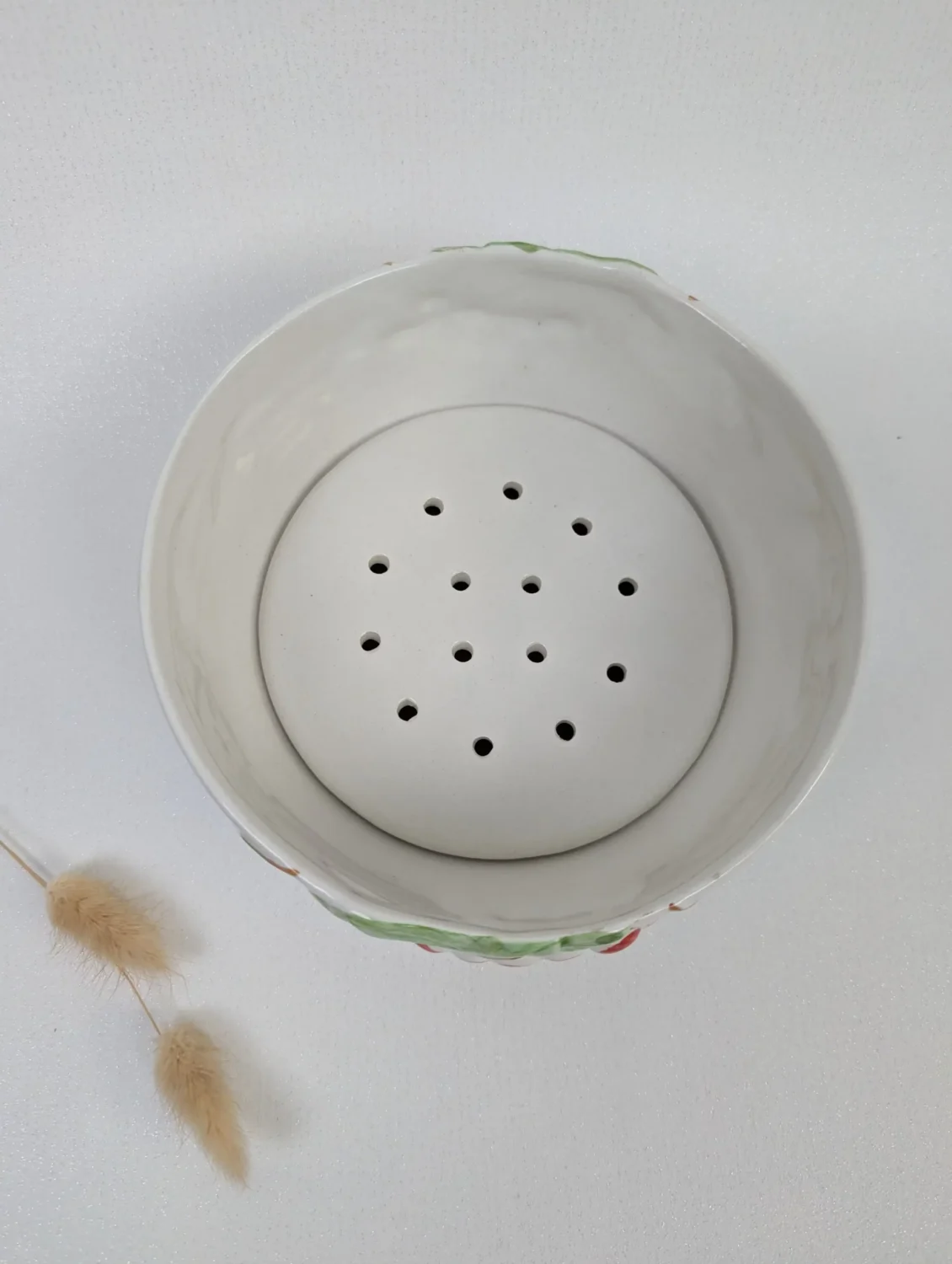 Ce plat égouttoir à radis en céramique barbotine est une pièce pleine de caractère. Véritable hommage aux arts de la table anciens, il combine une fonction utilitaire bien pensée avec un travail décoratif minutieux. Ses décors en relief de radis et de feuillages, typiques de la barbotine, évoquent immédiatement la tradition artisanale française.