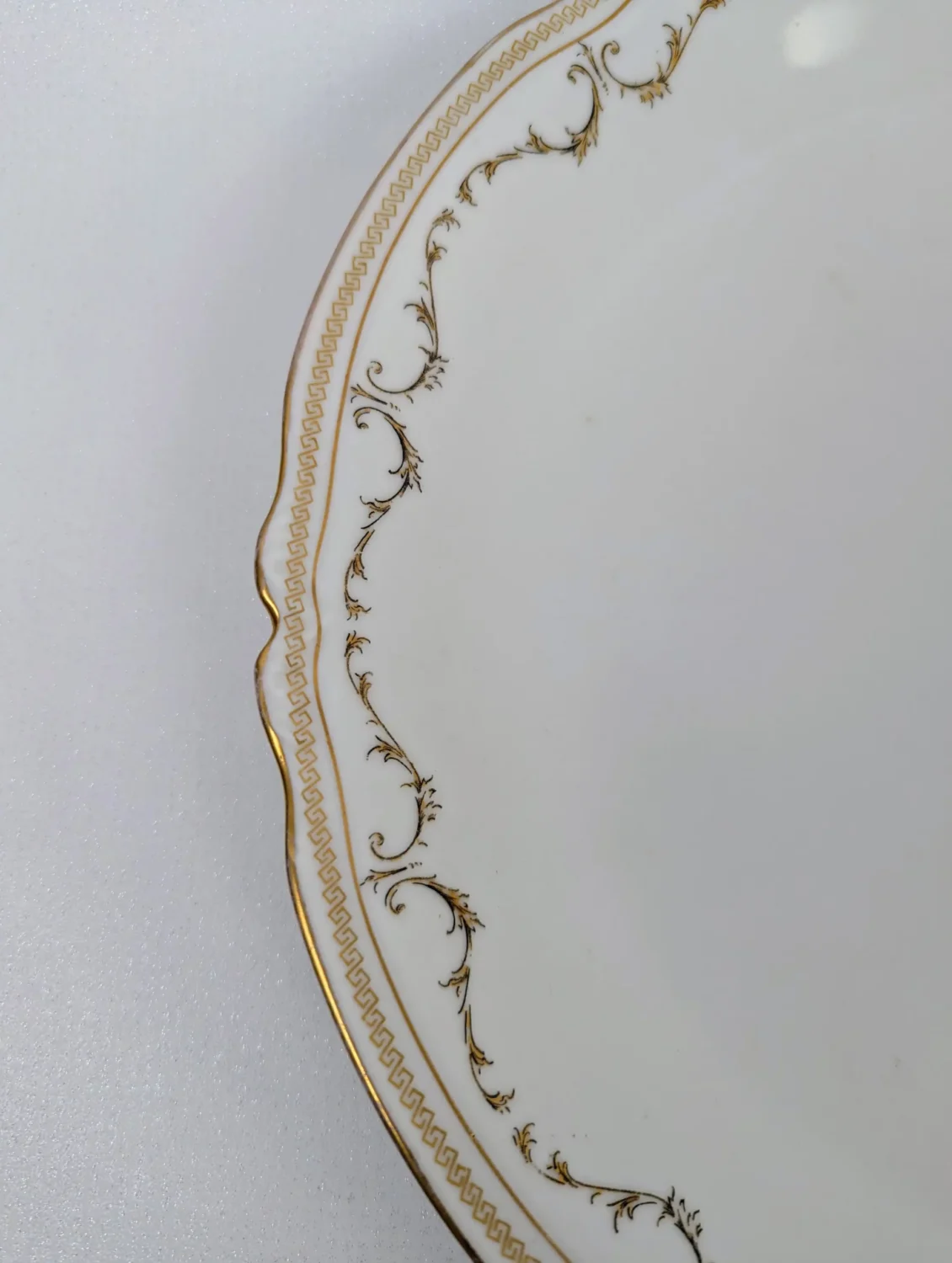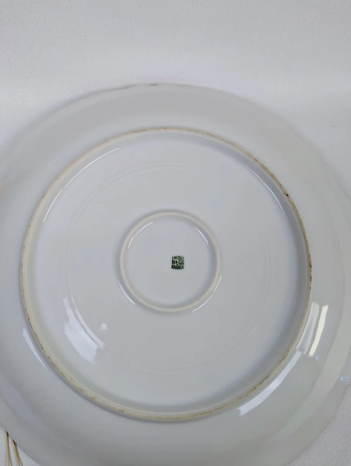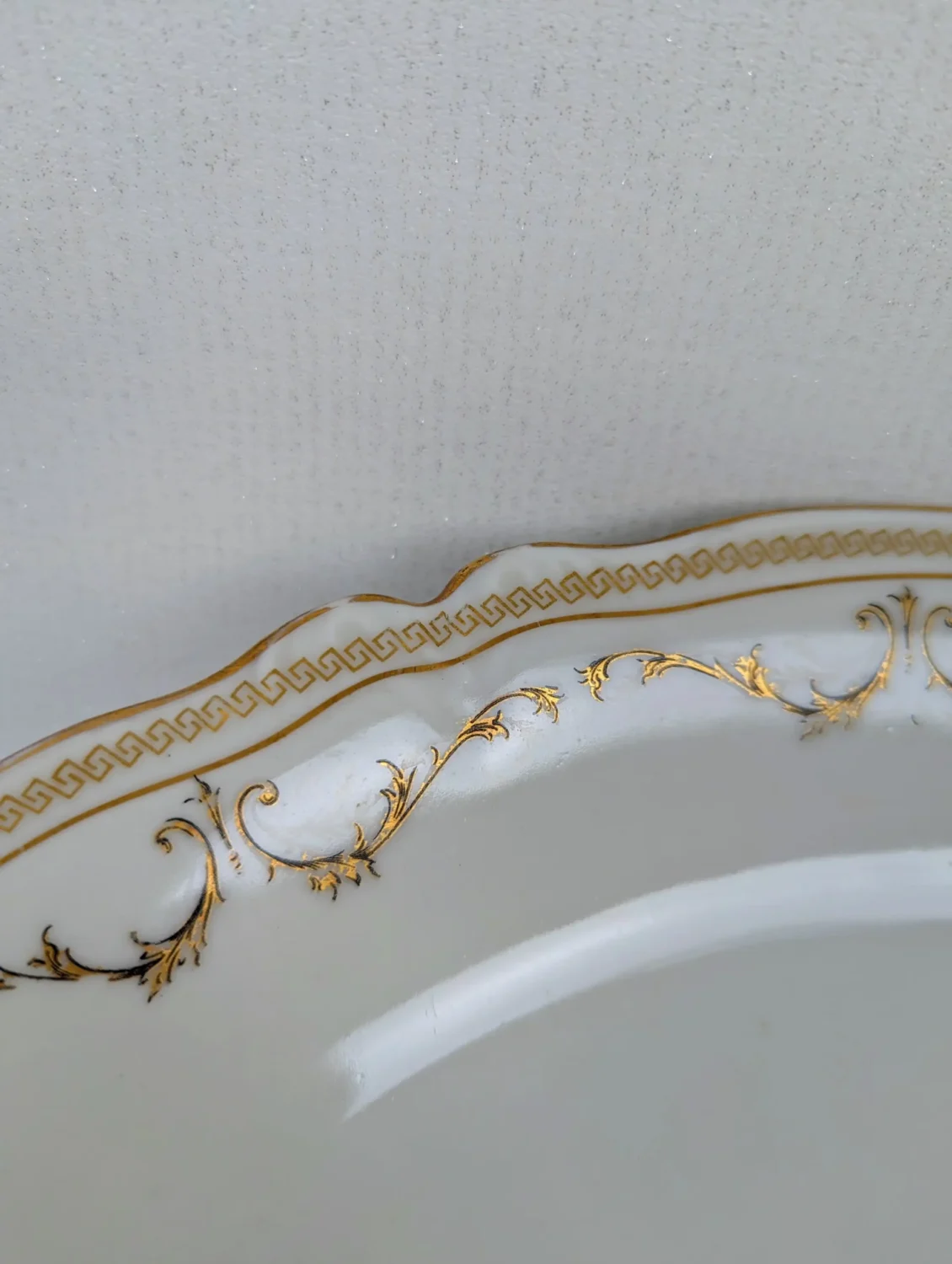 Ce plat en porcelaine de Limoges doré est en bel état d’usage, sans fêlure ni éclat. On note simplement quelques manques de dorure sur les bords, discrets et caractéristiques du passage du temps, qui renforcent même l’authenticité de cette belle pièce ancienne.