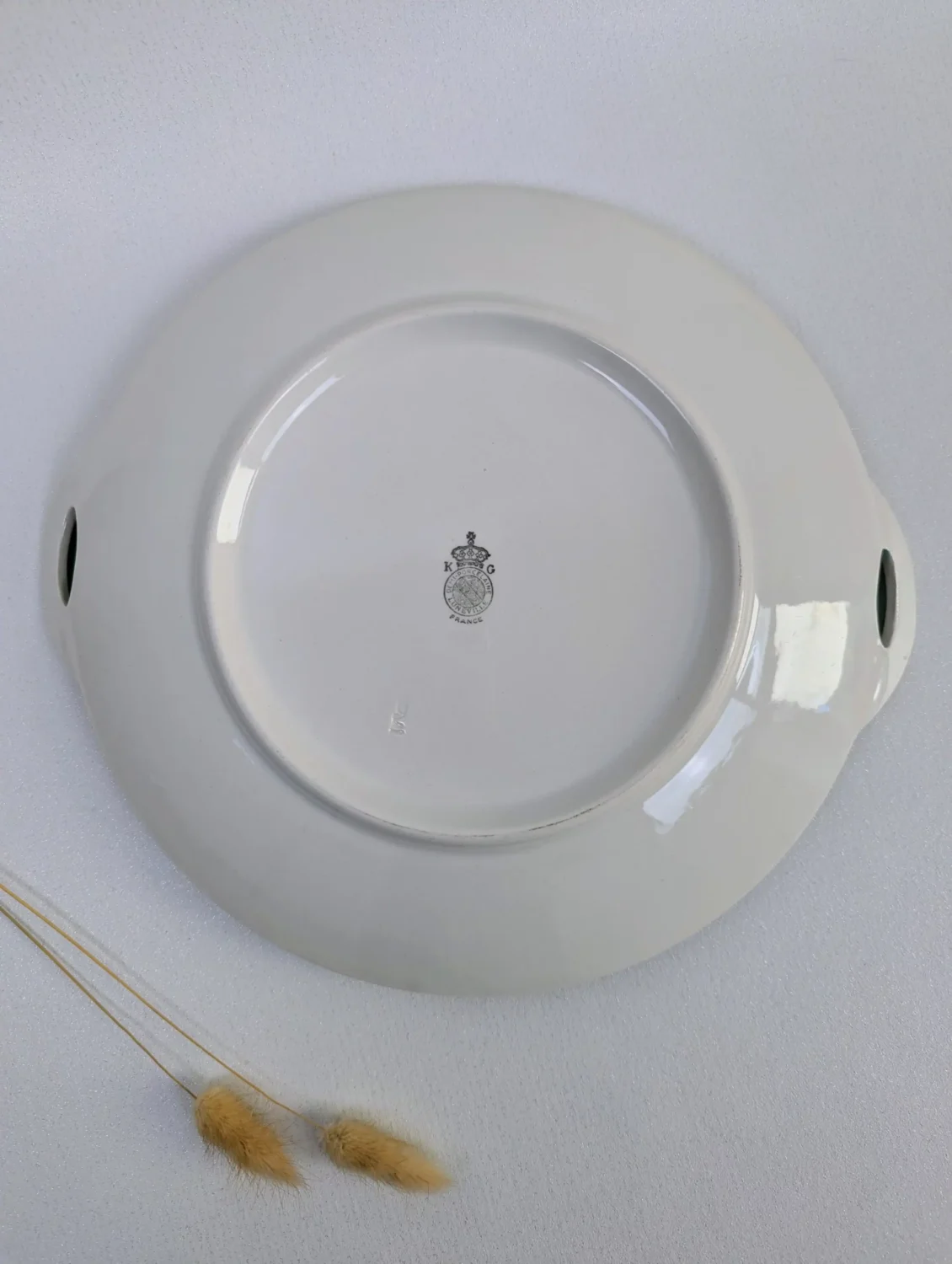 Bien que d’époque, ce plat en demi-porcelaine reste dans un excellent état d’usage. Il ne présente pas d’éclats, ni de fêles visibles. Son vernis est bien conservé et les anses parfaitement fonctionnelles. Il incarne à merveille la robustesse des pièces anciennes, pensées pour durer et traverser le temps avec élégance.