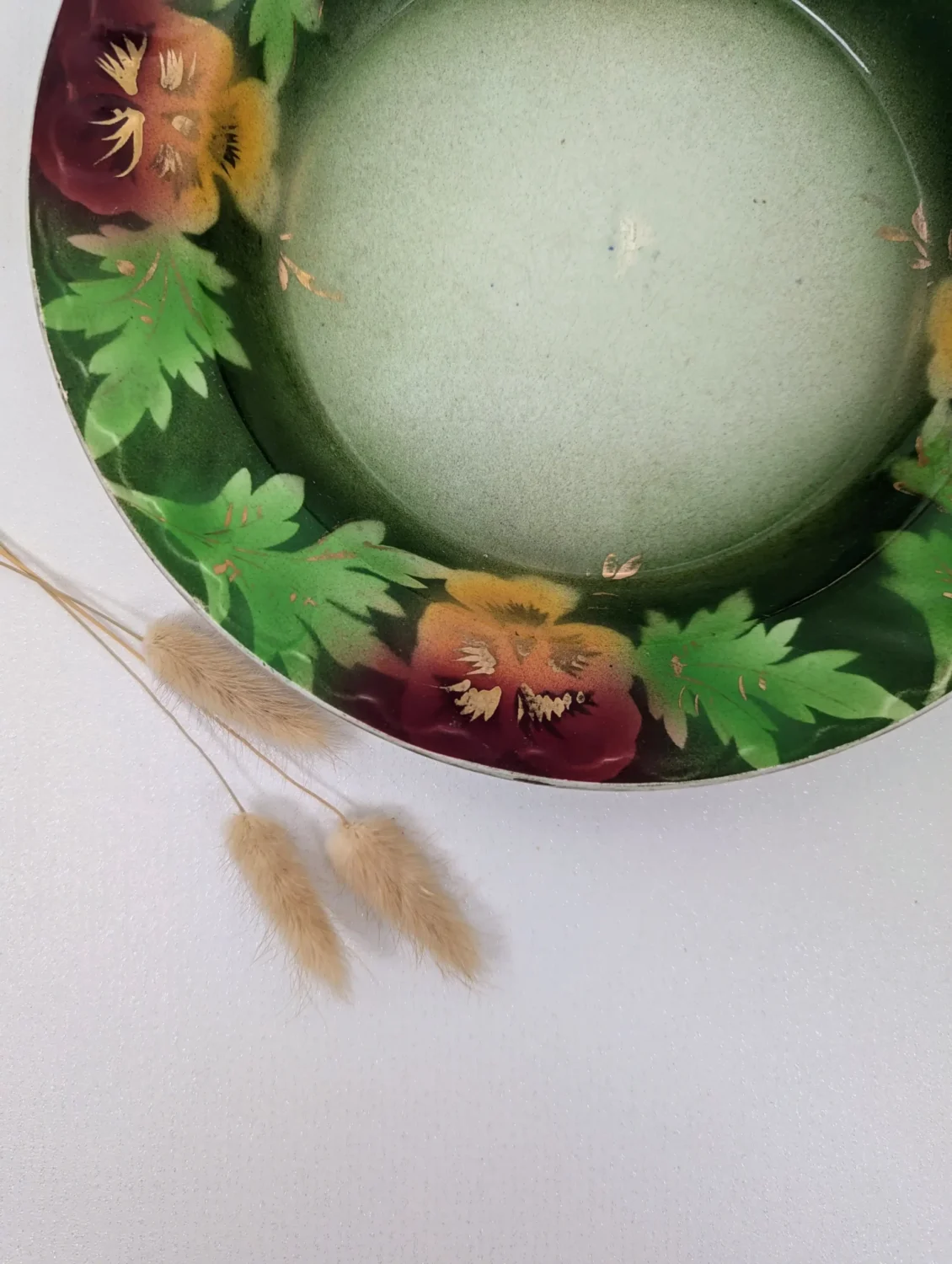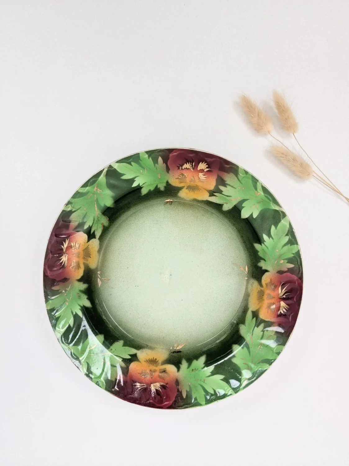 Des touches de dorure ornent le contour du plat, apportant une touche précieuse et vintage. Certaines dorures sont légèrement estompées par le temps, ce qui renforce le charme authentique de la pièce.