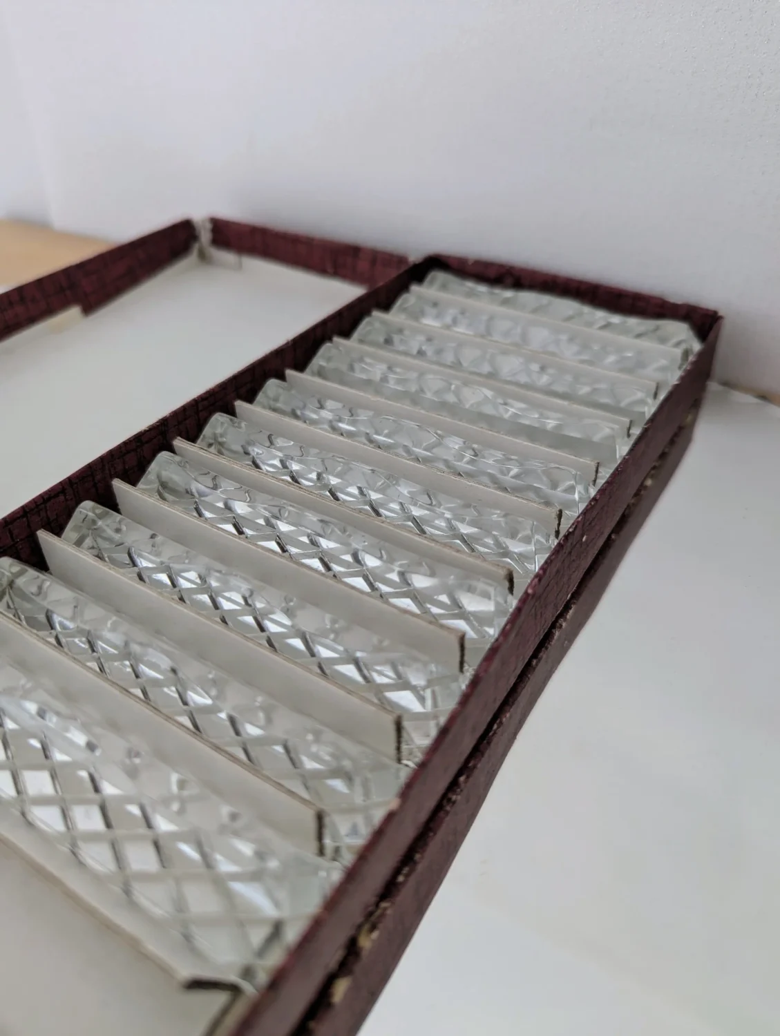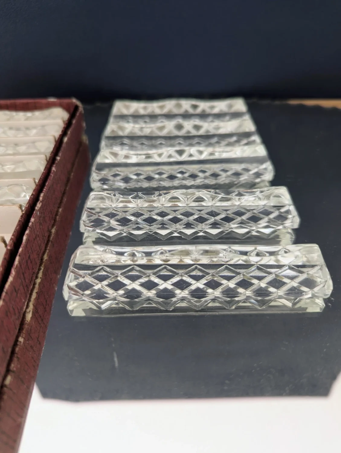 Ce lot comprend 10 porte-couteaux en cristal ciselé à la finition damier sur le dessous. Chaque pièce révèle un travail minutieux, témoignant du savoir-faire artisanal de l’époque. Le cristal clair, délicatement ciselé, capte la lumière et décore la table tout en discrétion.