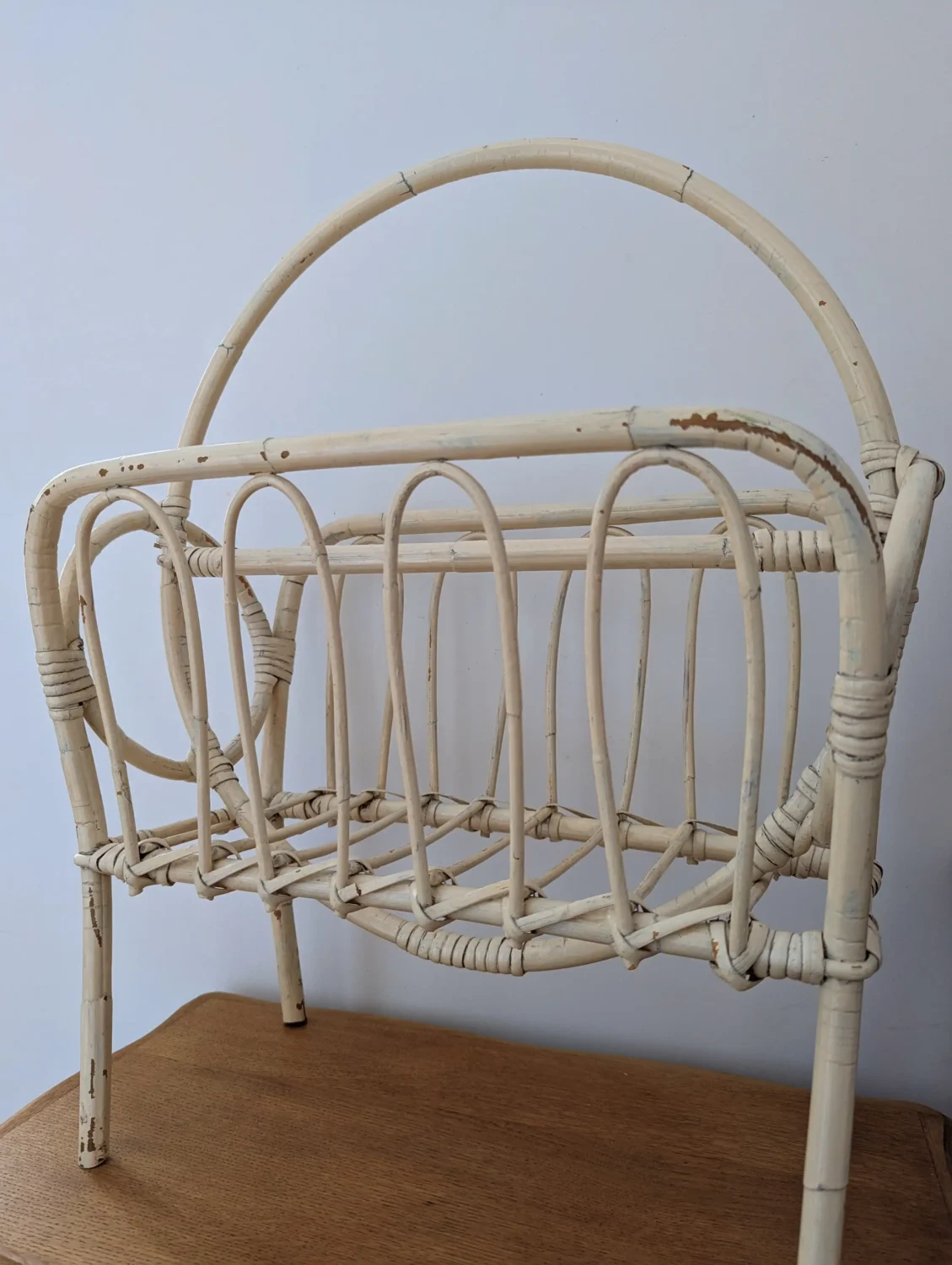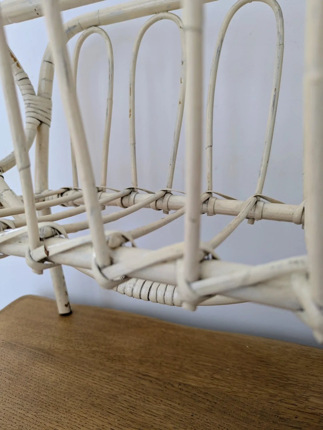 Ce porte-revue des années 60-70 en rotin tressé apporte une touche rétro et chaleureuse, parfait pour une décoration bohème chic et durable.