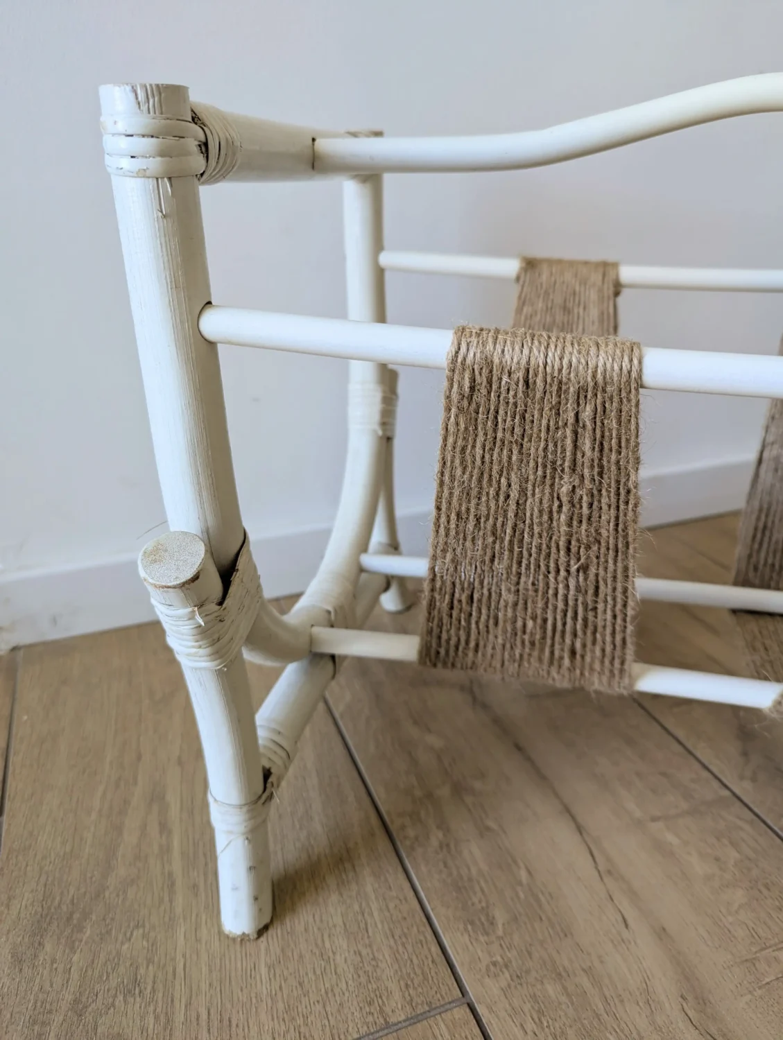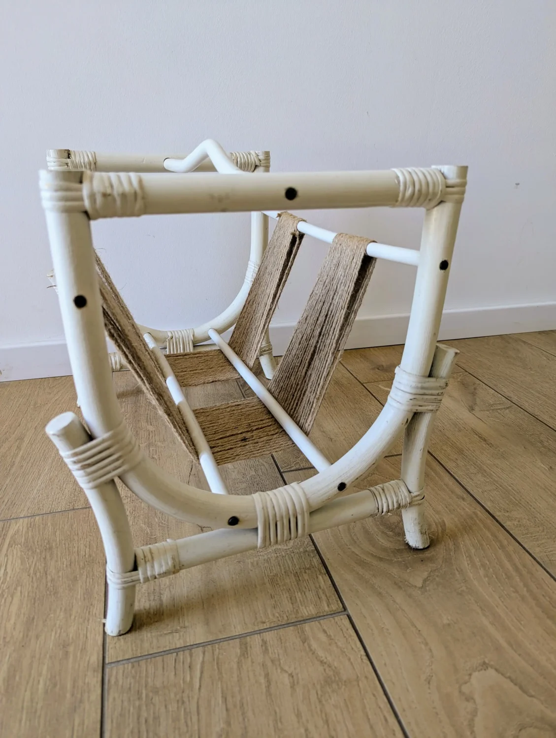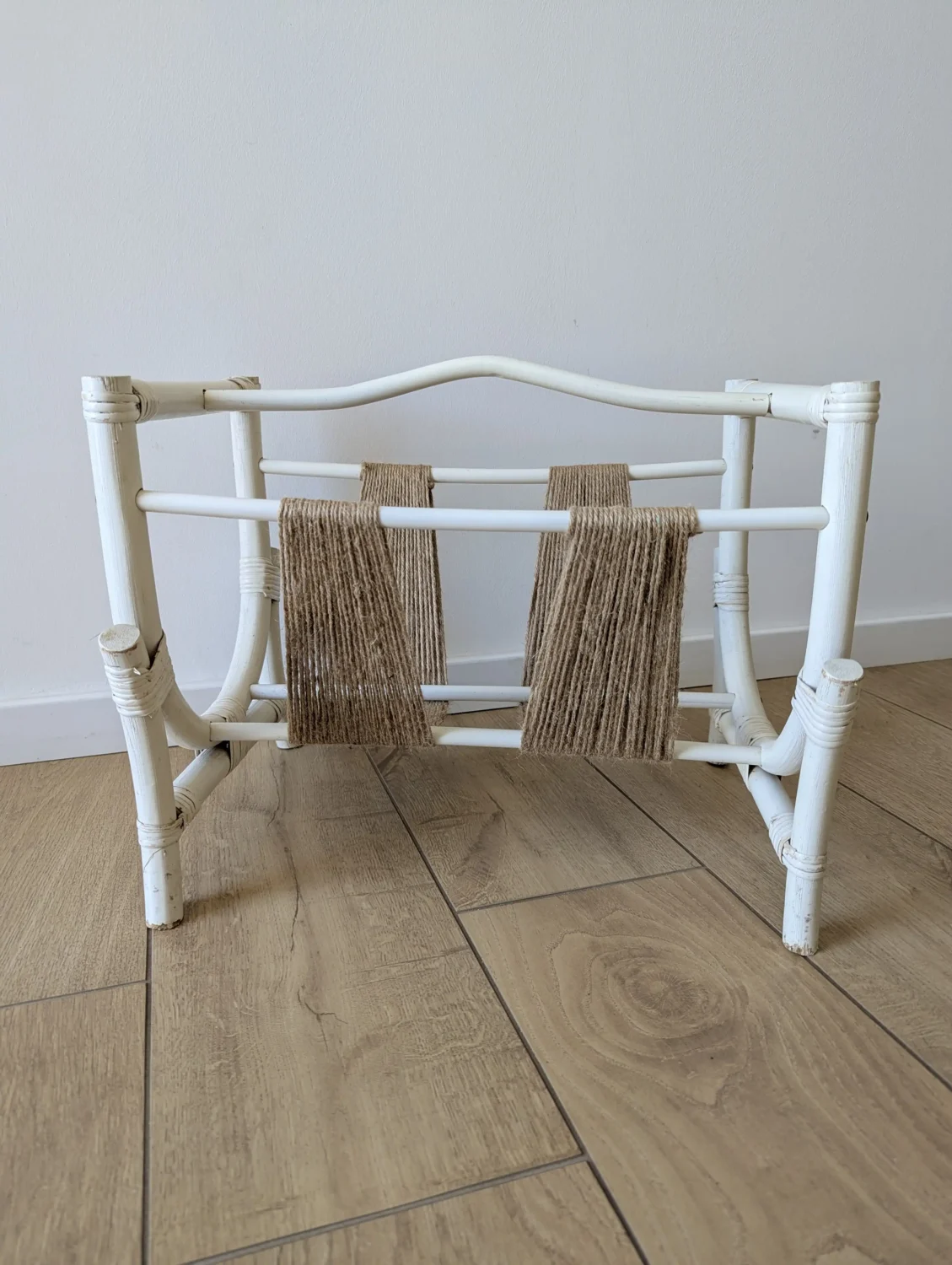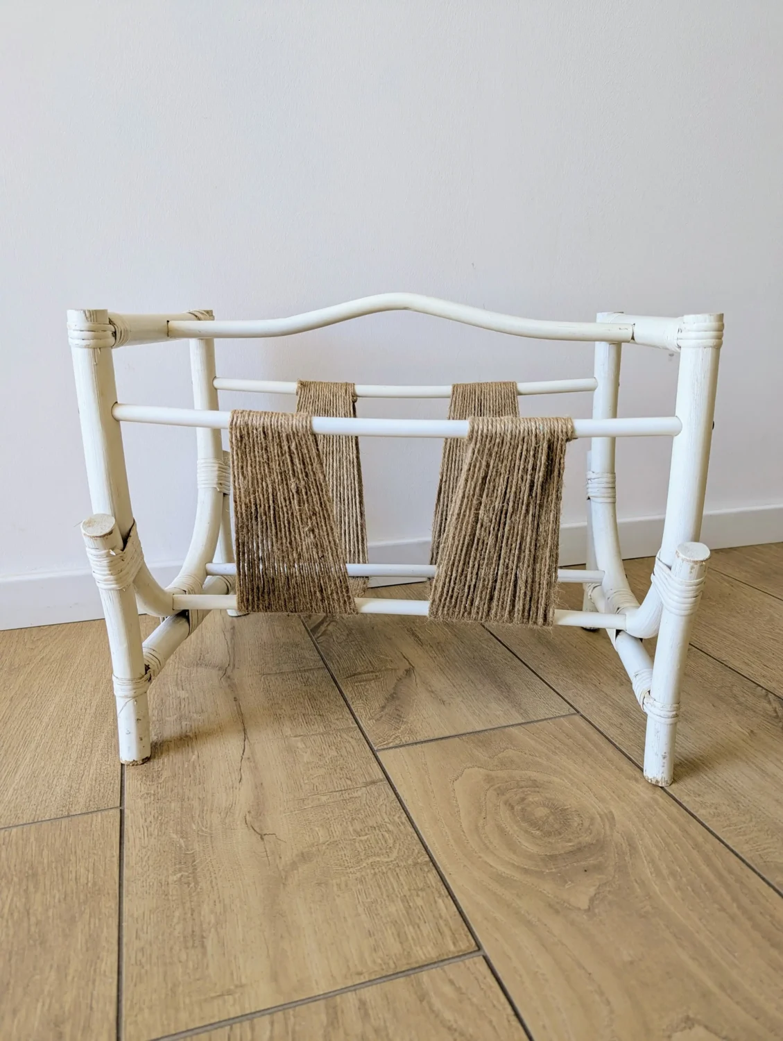Dès le premier regard, ce porte-revues en rotin peint en blanc évoque une ambiance bohème empreinte de douceur. En effet, une intervention artisanale transforme son aspect grâce à l’ajout de ficelle de jute naturelle sur les bandes centrales. Ainsi, ce mélange subtil entre les fibres brutes et la structure blanche crée un contraste harmonieux et poétique.