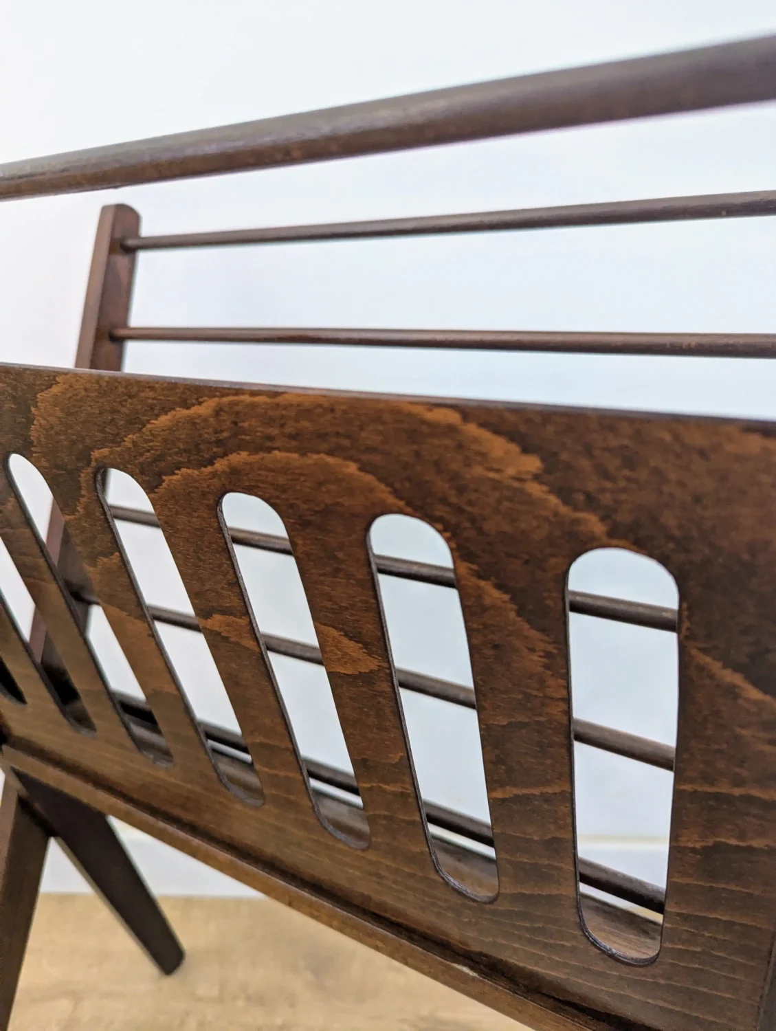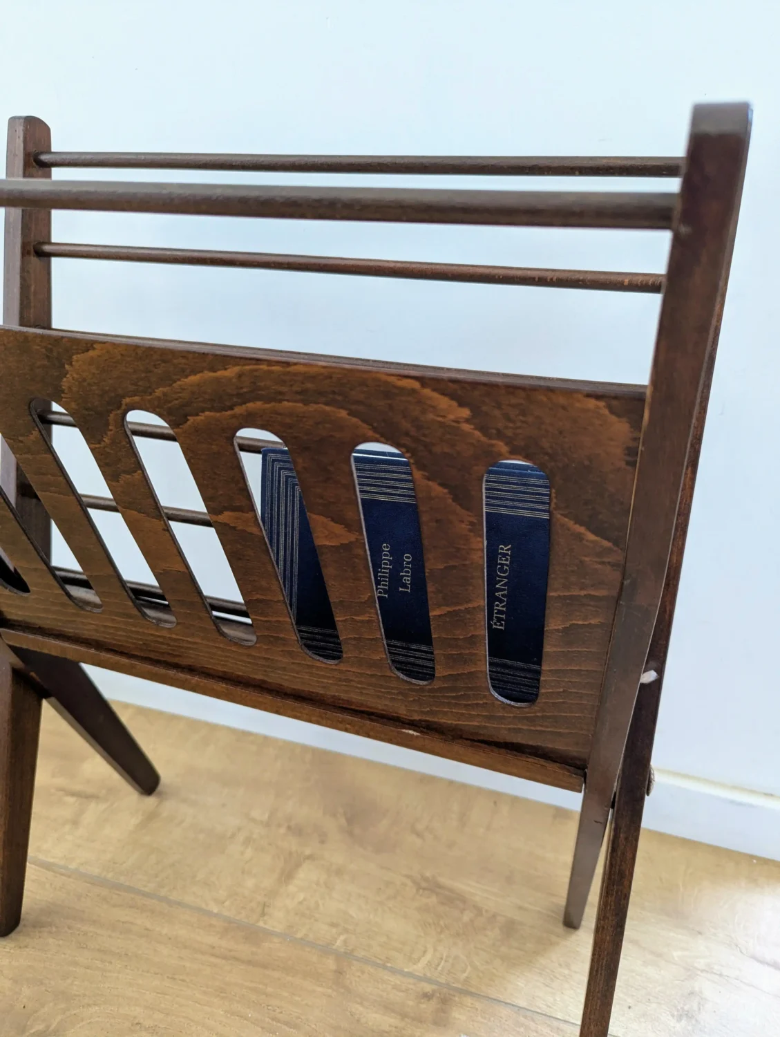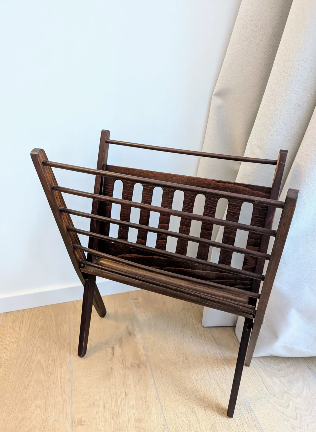 Fabriqué en bois massif teinté foncé, ce porte-revues présente une belle patine d’origine et une finition soignée. Sa structure ajourée permet de ranger facilement magazines, livres ou vinyles, tout en conservant une allure légère et graphique.
