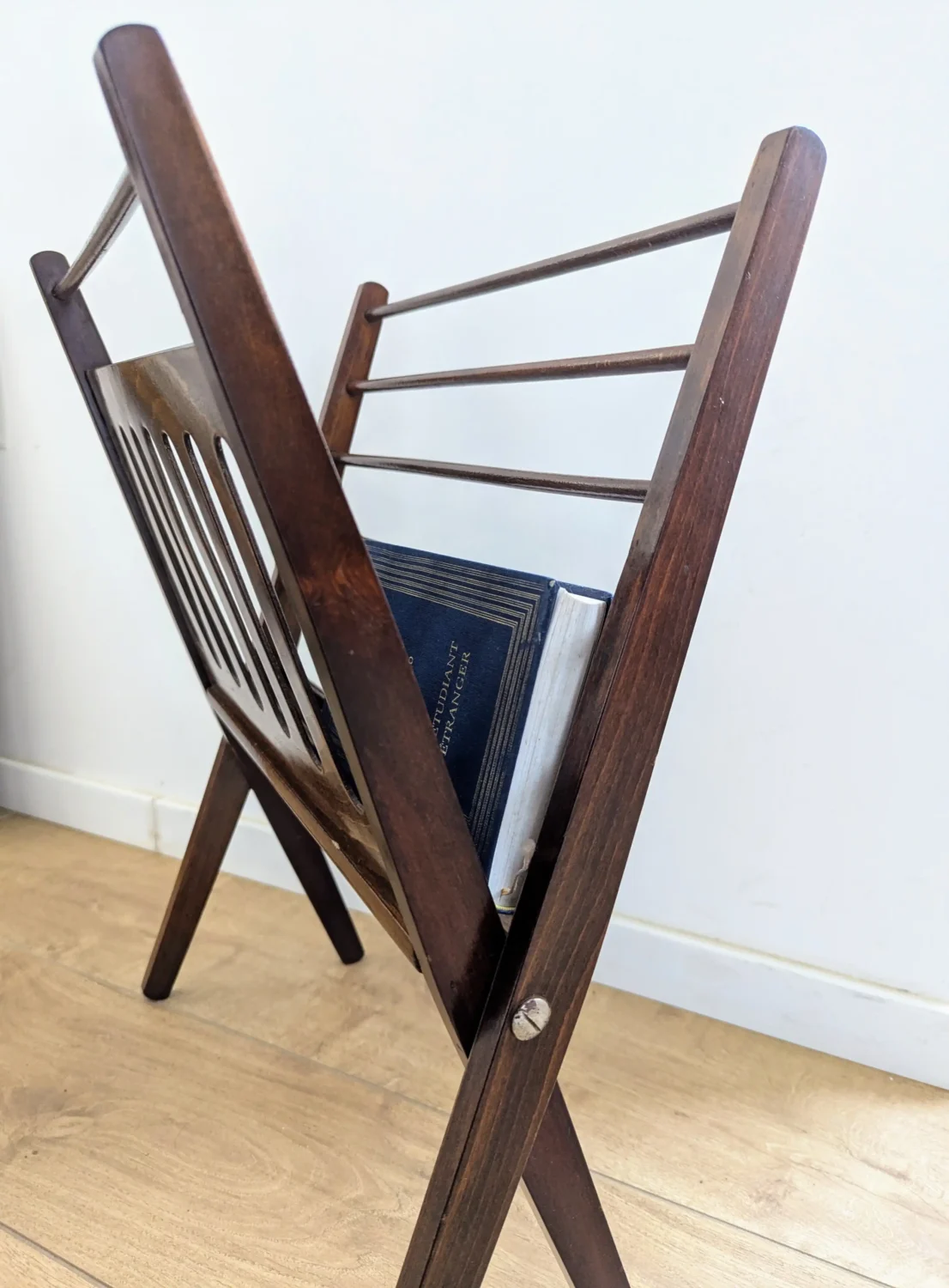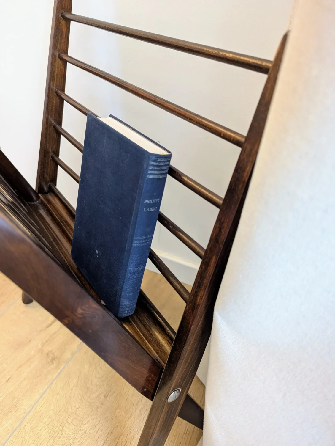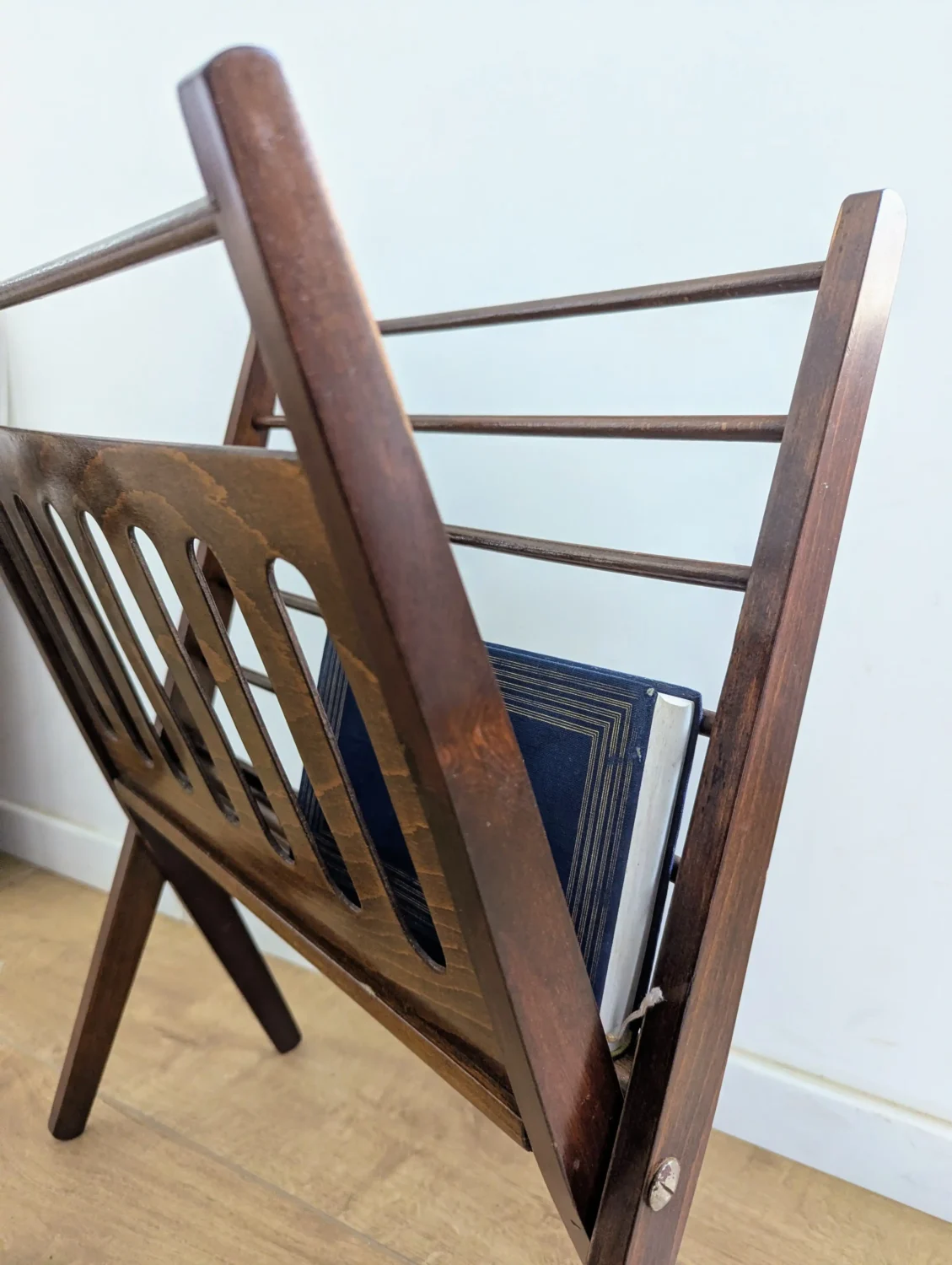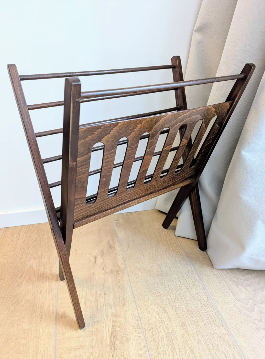 Fabriqué en bois massif teinté foncé, ce porte-revues présente une belle patine d’origine et une finition soignée. Sa structure ajourée permet de ranger facilement magazines, livres ou vinyles, tout en conservant une allure légère et graphique.