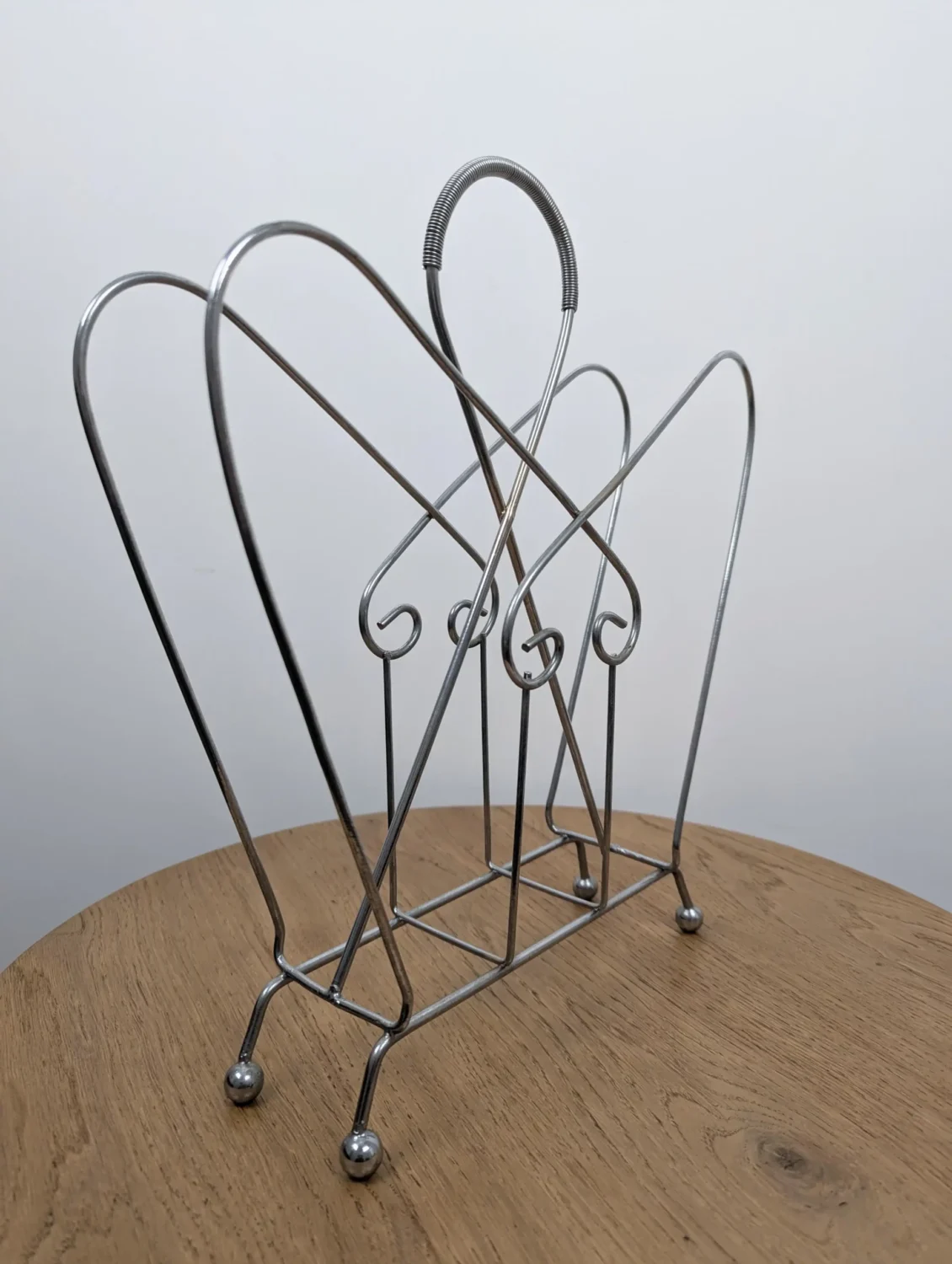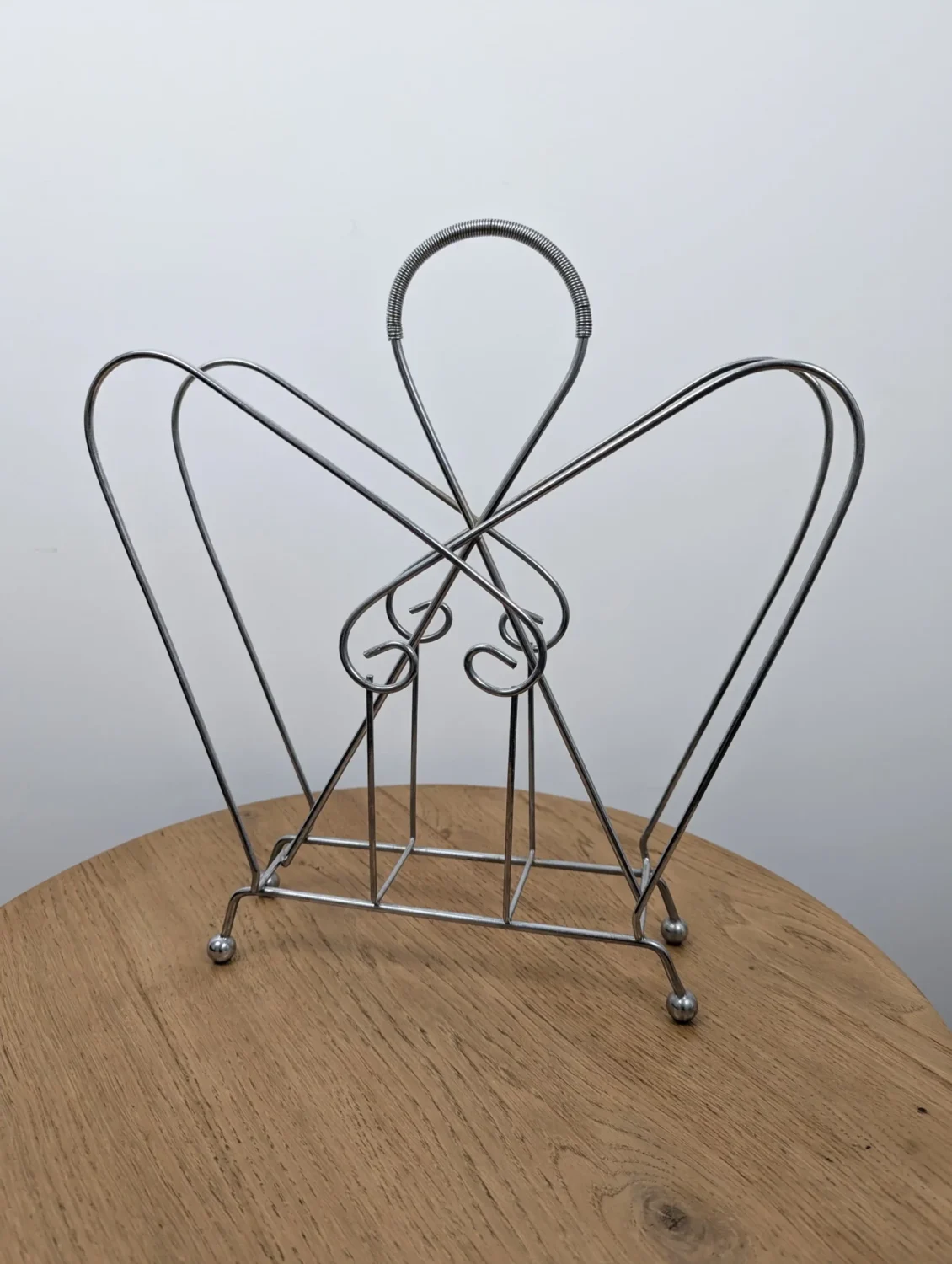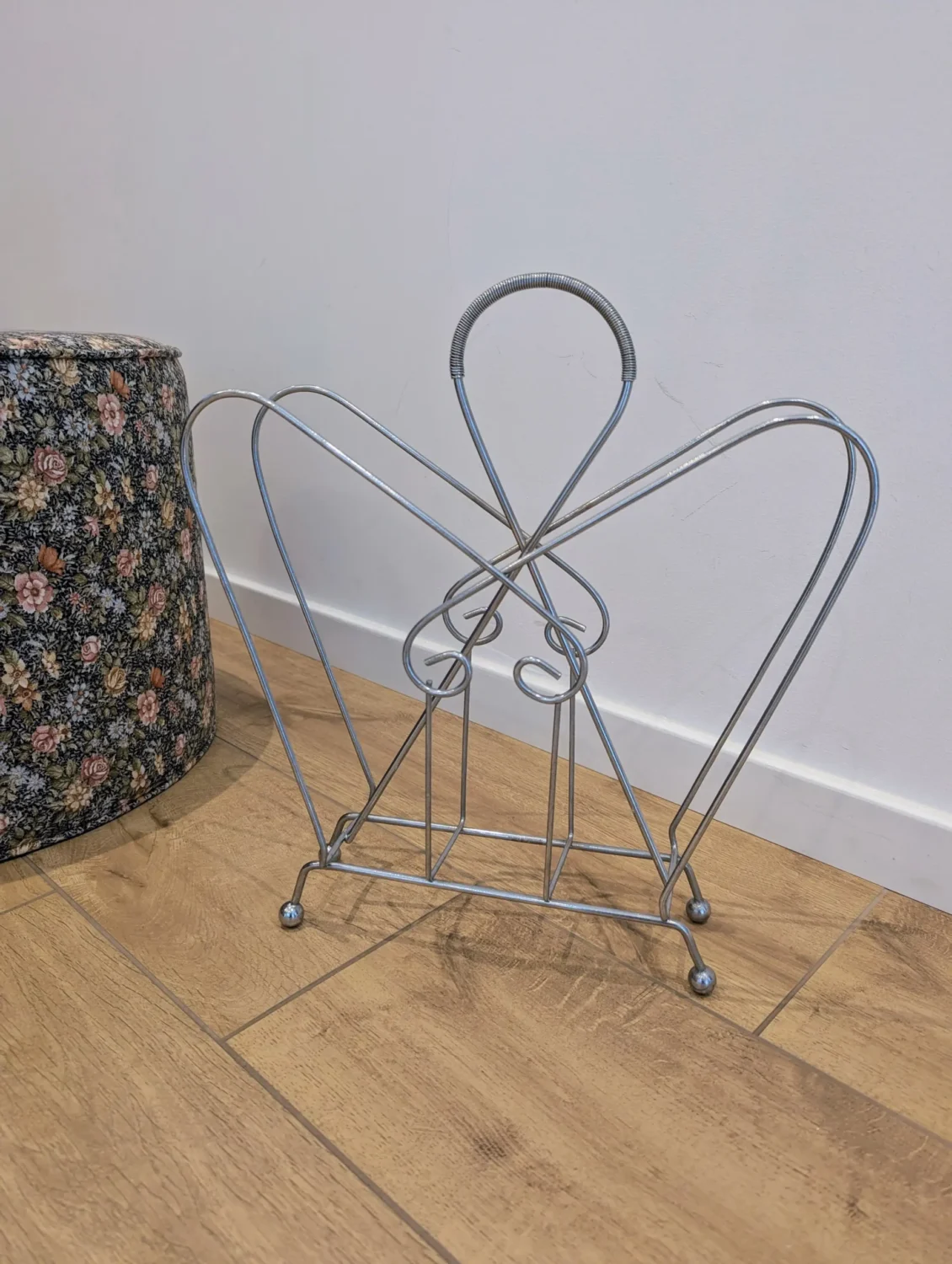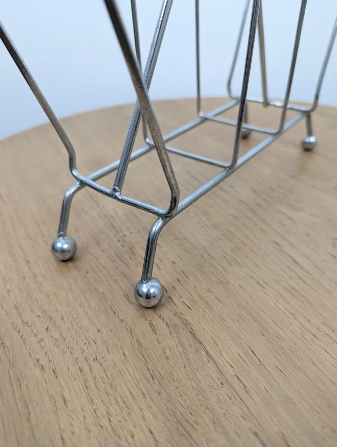 Ajoutez une touche rétro chic à votre intérieur avec ce porte-revues vinyles en métal chromé, typique du design des années 60. Avec sa structure fine et élégante, il allie à merveille fonctionnalité et style. Ce bel objet déco trouve naturellement sa place dans un salon, un bureau ou même un coin lecture.