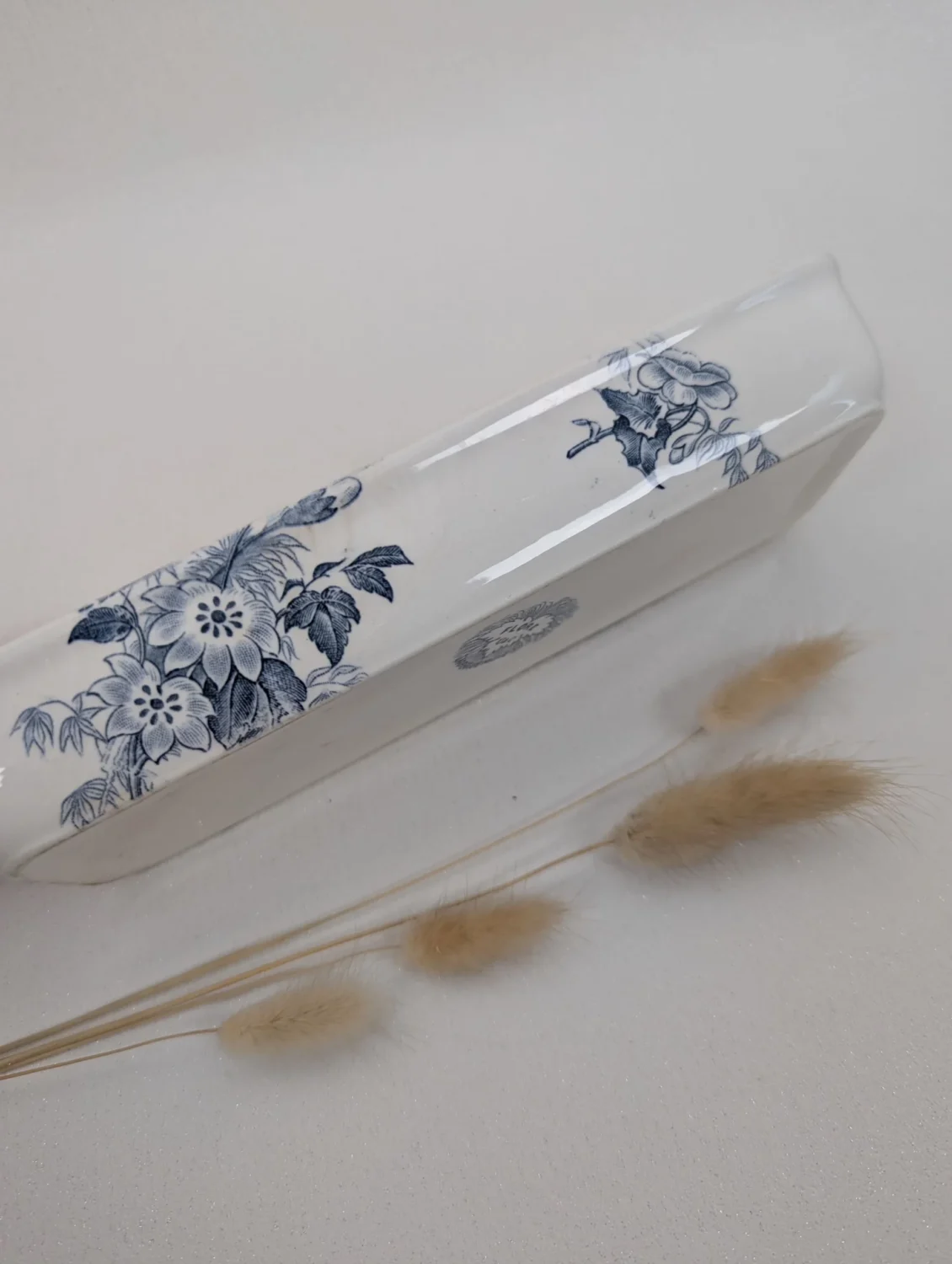 Ce porte-savon ancien en faïence signé Sarreguemines U&C, modèle FLORE, incarne le raffinement de la céramique française du XIXe siècle. Produit entre 1875 et 1920, il allie finesse artisanale et charme intemporel. Sa forme ovale classique, ses bords délicatement galbés et son motif floral bleu sur fond crème en font un objet à la fois décoratif et fonctionnel.