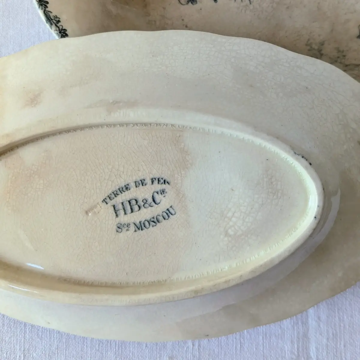 La manufacture HB & Cie, située à Saint-Amand-les-Eaux, est une référence incontournable de la céramique française de la fin du XIXe siècle. Sous la direction d’Hippolyte Boulenger, l’usine a su perfectionner la terre de fer, une faïence fine particulièrement résistante, enrichie de feldspath et de kaolin. Le décor « Moscou », réalisé par transfert imprimé, se distingue par la finesse de ses traits. Les motifs végétaux, d’un vert profond, évoquent une nature domestiquée, très en vogue à la période Art Nouveau. Cette pièce unique est le reflet d’un savoir-faire industriel qui flirtait avec l’artisanat d’art, où chaque bain d’émail et chaque cuisson apportaient des nuances uniques à la pièce finale. Cet objet authentique porte en lui l’ADN de la gastronomie française de la Belle Époque.