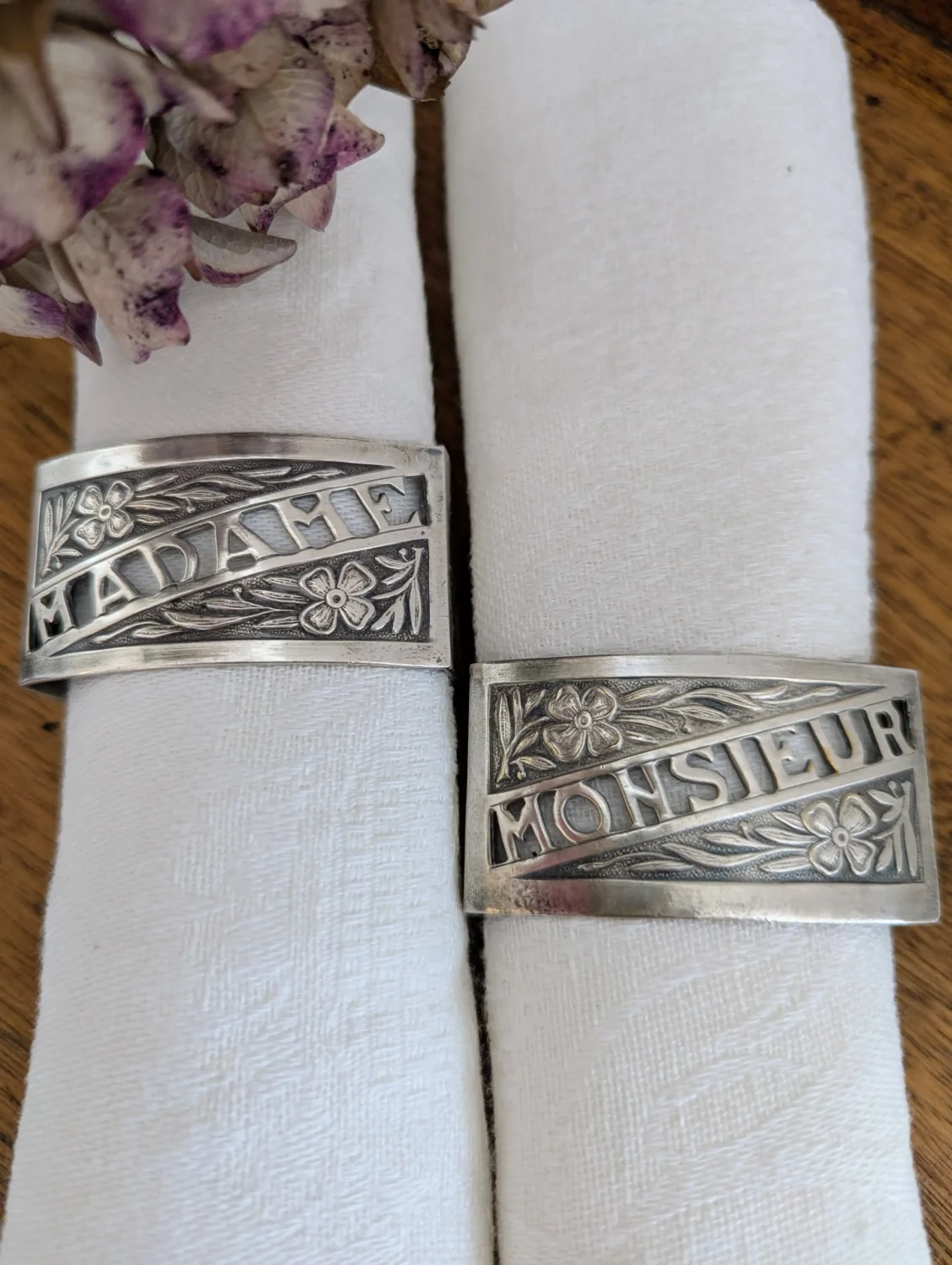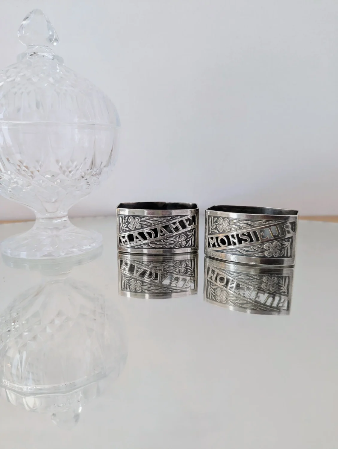 Ronds de serviette en métal argenté gravés « Madame » & « Monsieur », années 30.