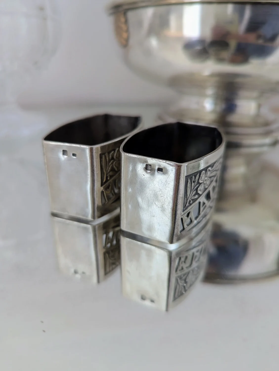 Quelle est l’origine exacte de ces ronds de serviette ? Ils datent des années 1930 et sont en métal argenté poinçonné, ce qui confirme leur authenticité et leur provenance probable d’un atelier français spécialisé dans l’art de la table.