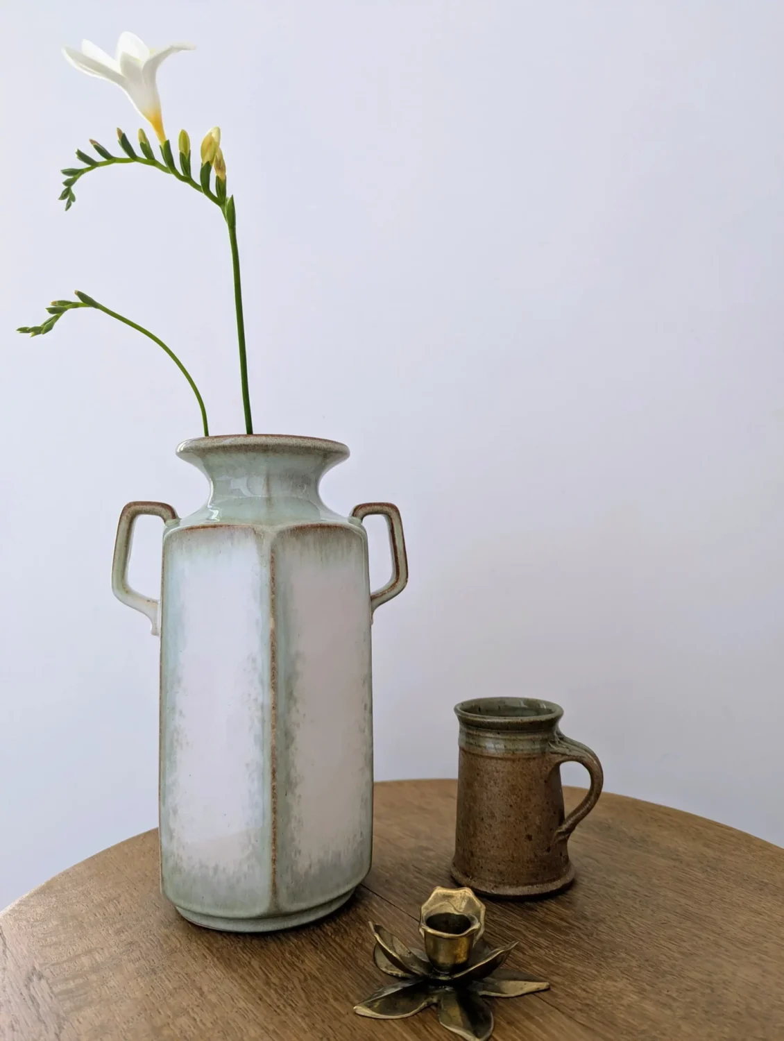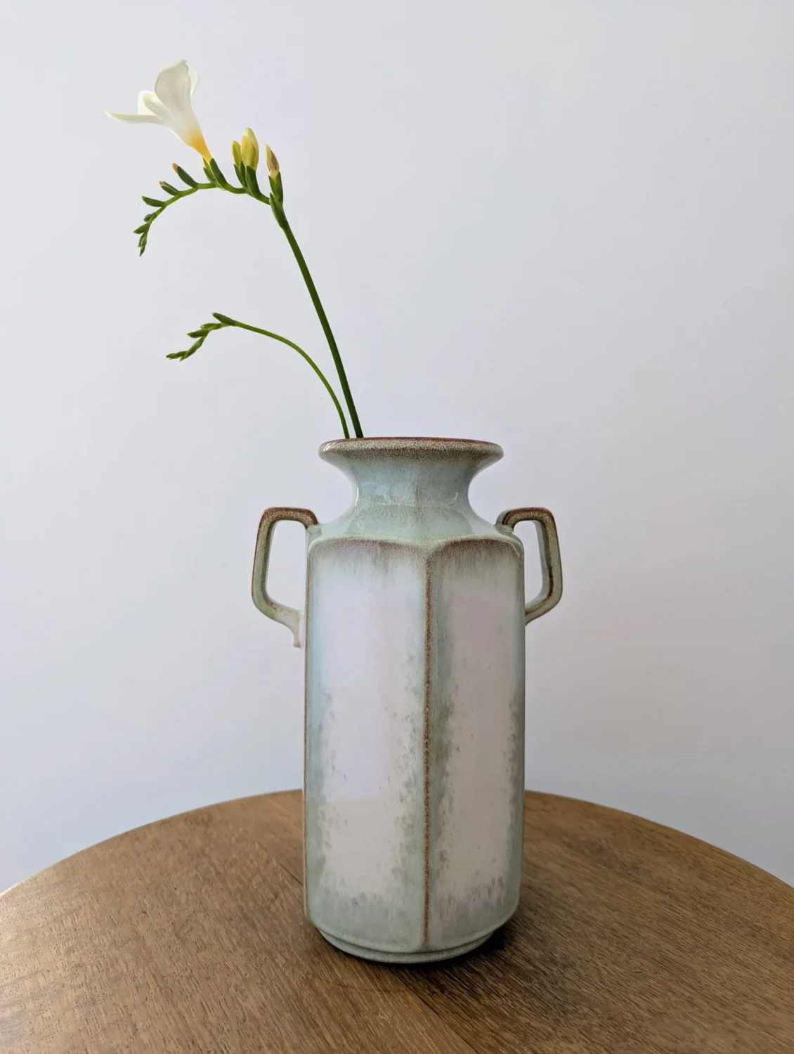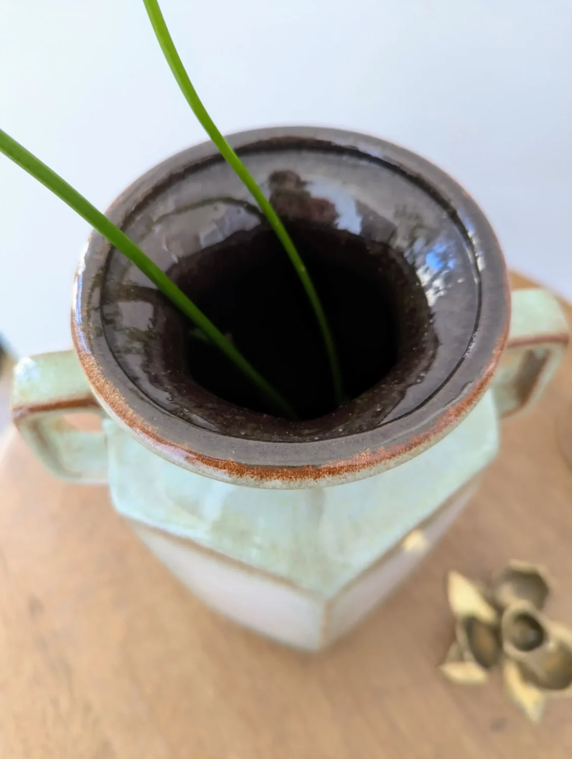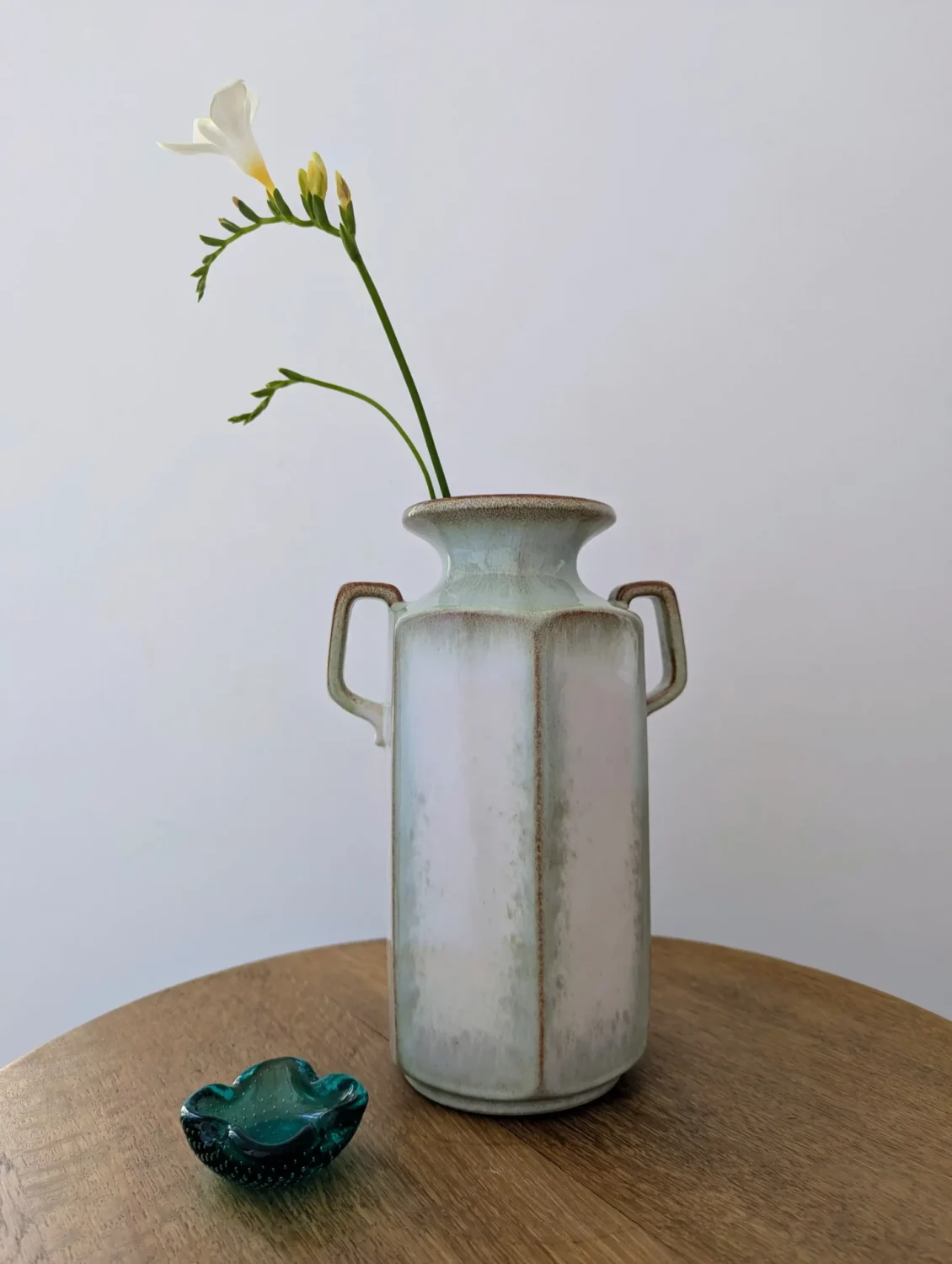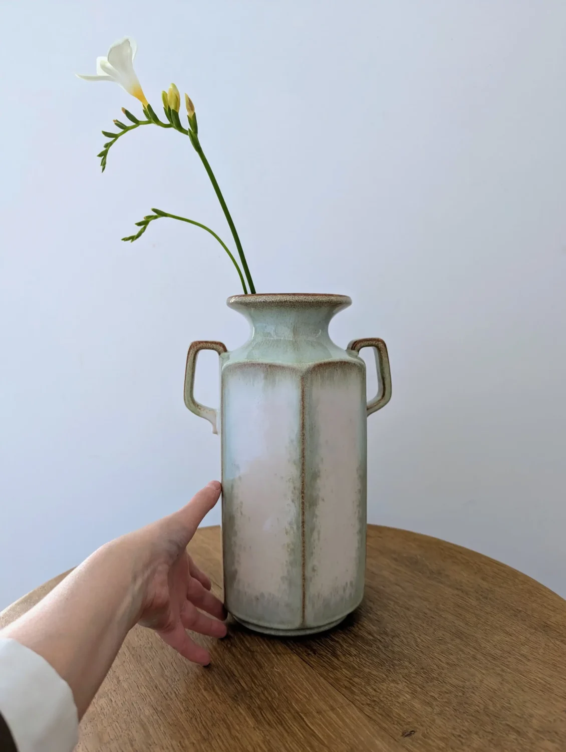 A very beautiful model with two handles (rare), we love its geometric amphora shape, the soft combination of its pastel water-green and brown colors, and its generous size, which can accommodate beautiful bouquets of flowers with large stems.