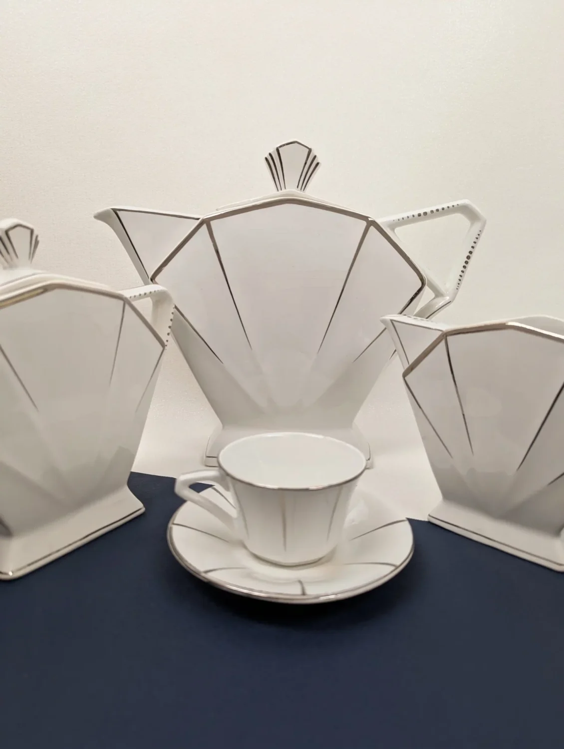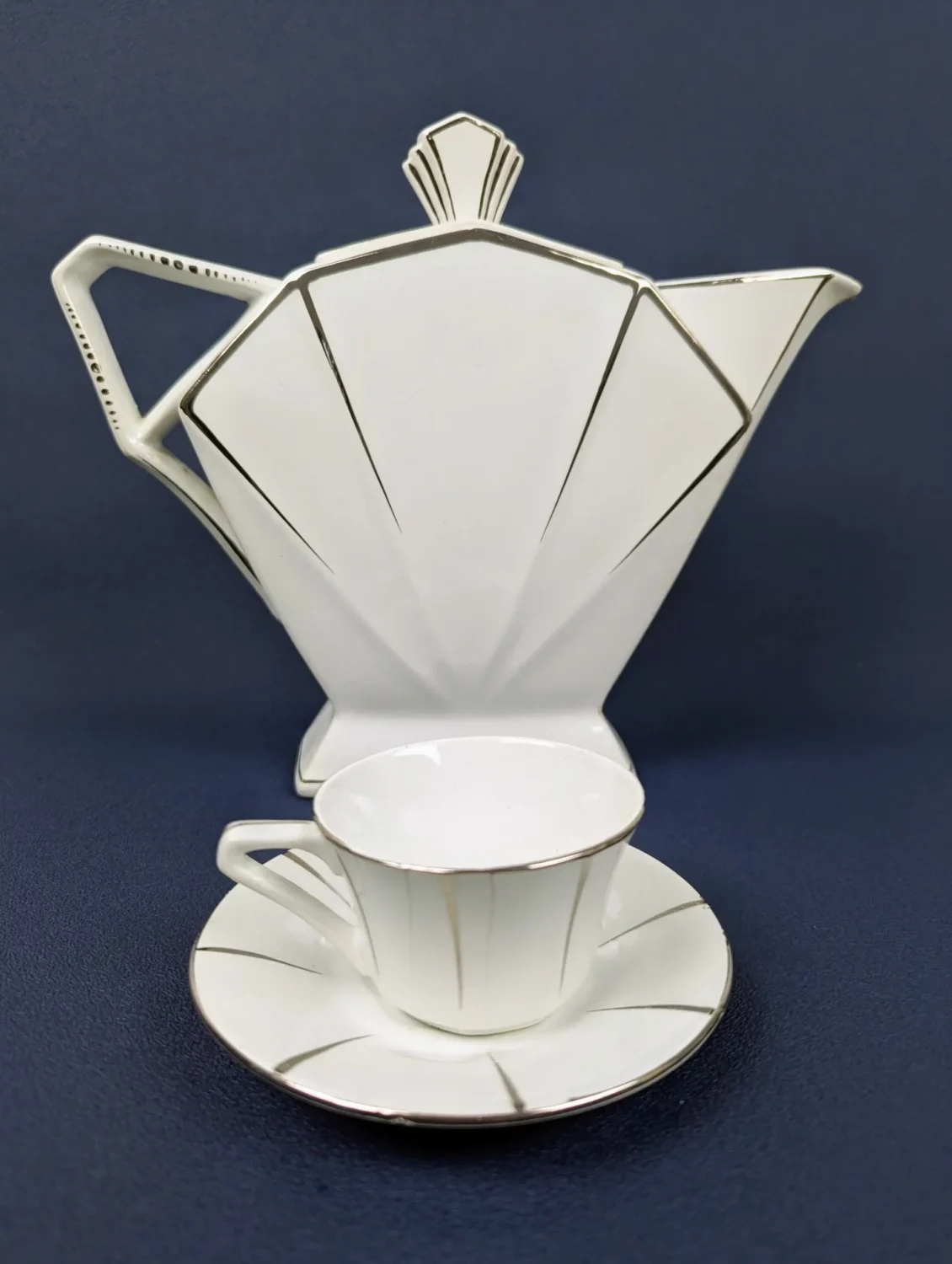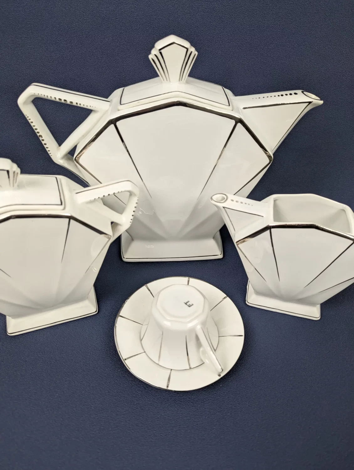 Magnifique service à café en porcelaine des années 30 Art déco, composé de la cafetière, du sucrier, du pot à lait ainsi que de 12 tasses et 12 soucoupes.
