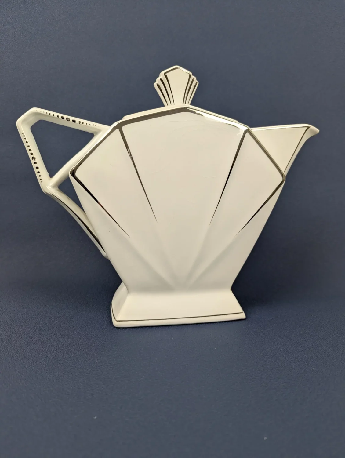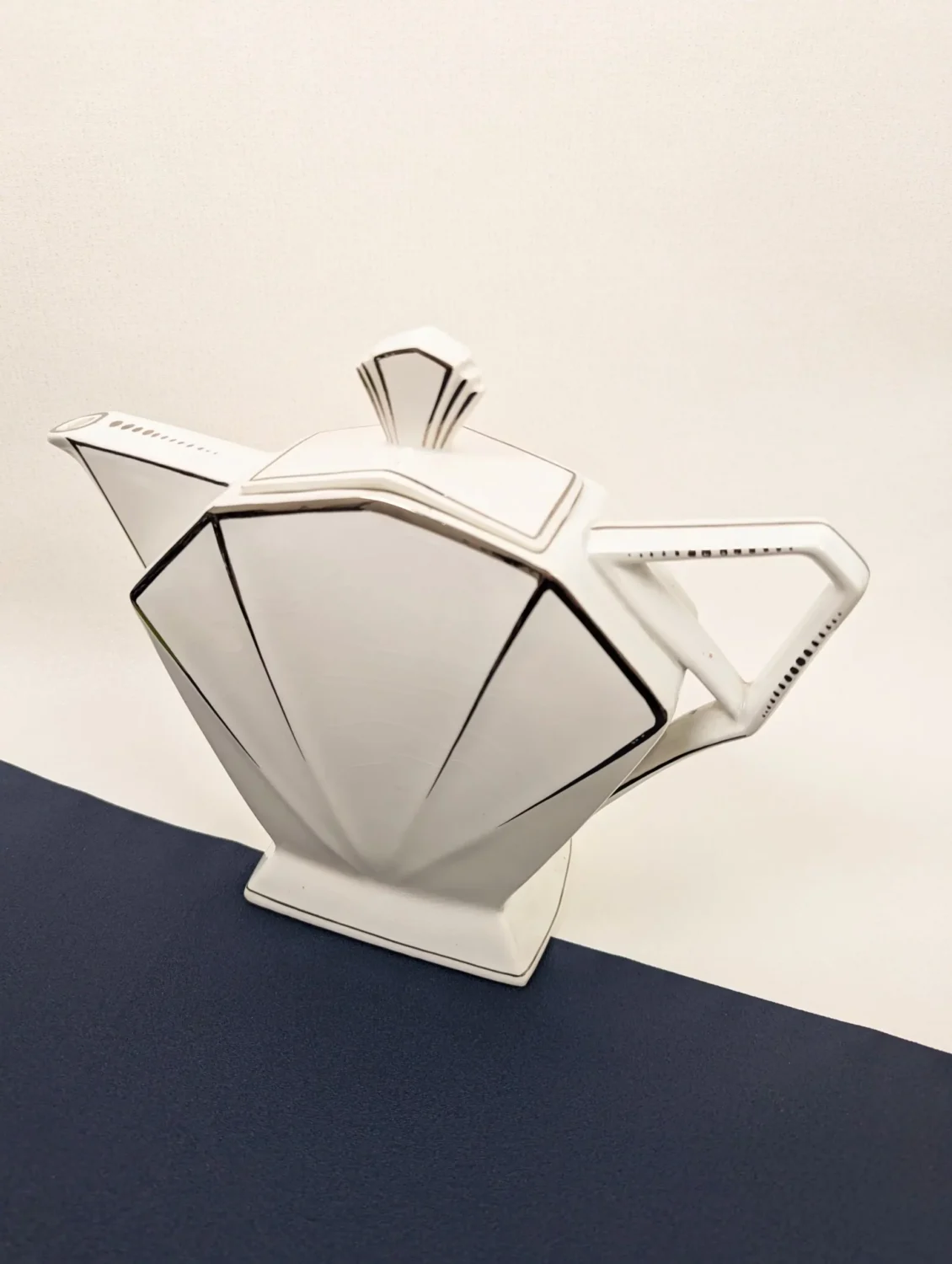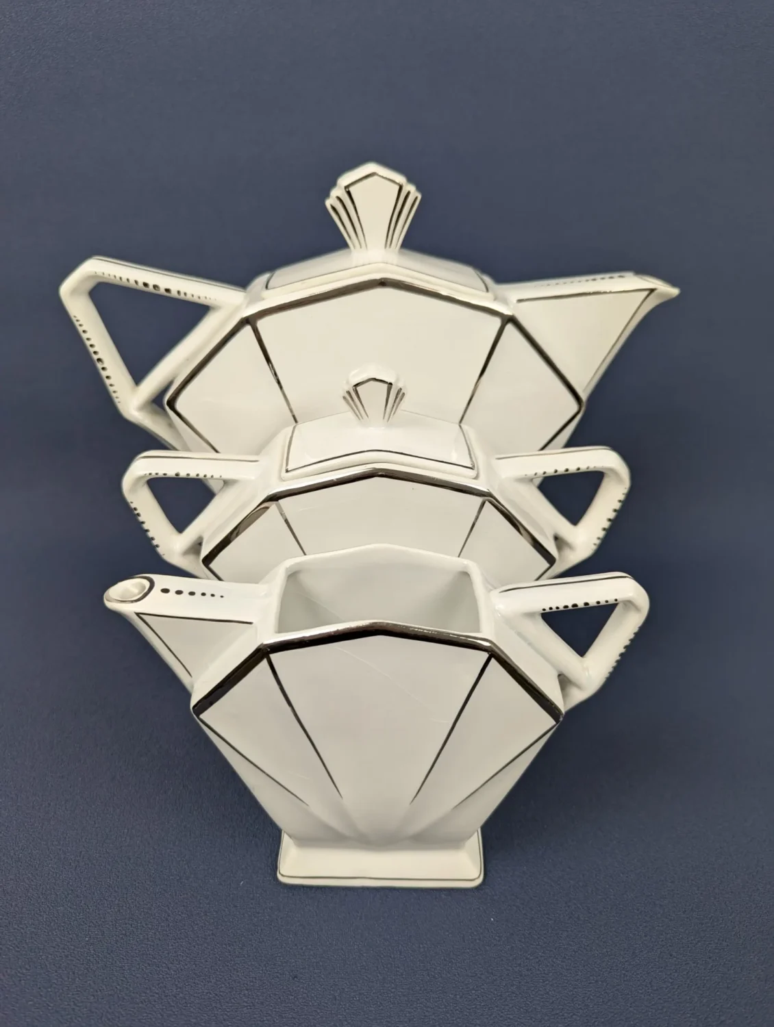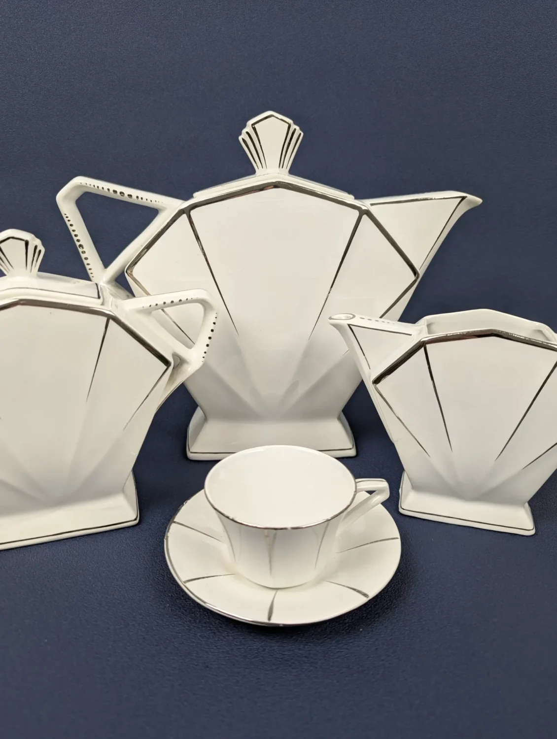 Magnifique service à café en porcelaine des années 30 Art déco, composé de la cafetière, du sucrier, du pot à lait ainsi que de 12 tasses et 12 soucoupes.
