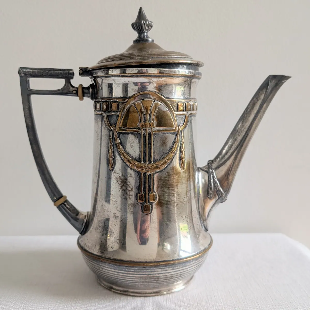 L’état général est bel et bien ancien. Quelques traces d’usage et désargentures sont visibles sur le métal, renforçant l’aspect authentique de ce service à café Art déco ancien. Ces marques du temps, loin d’être des défauts, sont les cicatrices poétiques d’un objet vintage sélectionnée avec soin par Villa Brieg pour son supplément d’âme.