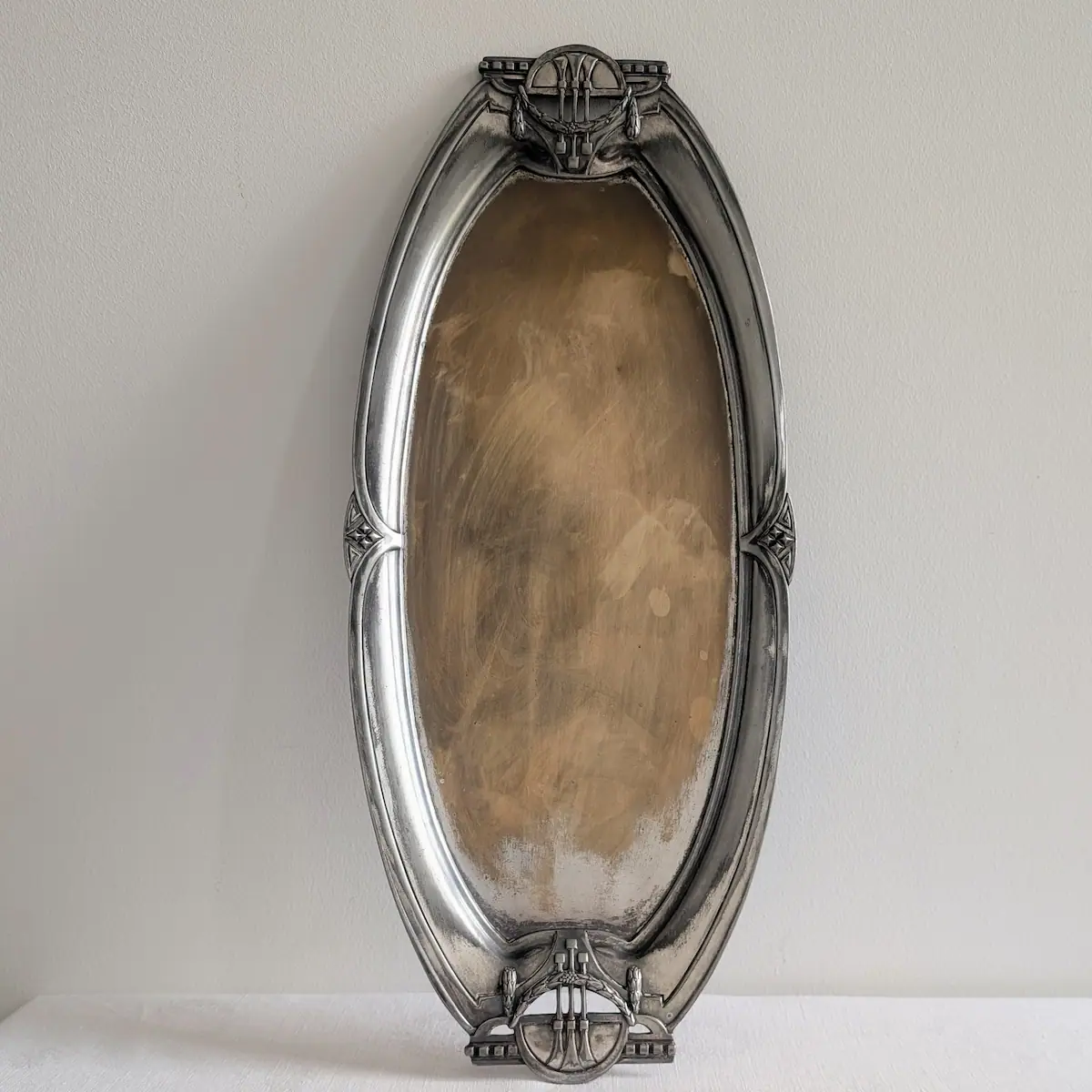 L’observation montre des zones où l’argenture s’est affinée avec le temps, laissant apparaître le métal de base. Ce n’est pas un défaut, mais la preuve qu’il s’agit d’un objet authentique du début du siècle. Cette patine mate apporte une vibration de couleur très recherchée pour une décoration ancienne de caractère, montrant l’usure naturelle aux endroits de manipulation fréquente.