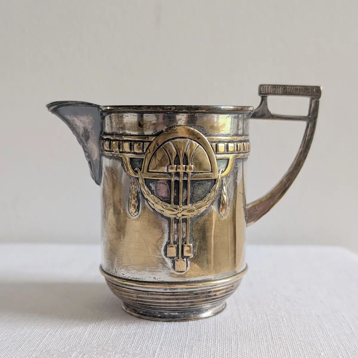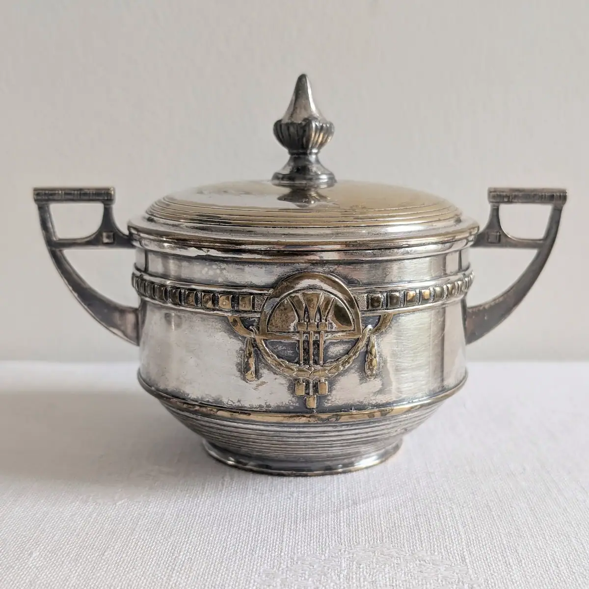 Le discernement s’appuie sur trois critères : le poids (2.3 kg), la précision des motifs géométriques en relief et la signature CRE. Les reproductions modernes sont souvent beaucoup plus légères et présentent un éclat « froid » et uniforme. Ici, la chaleur du métal argenté et la qualité des soudures des anses témoignent d’un savoir-faire artisanal du début du siècle dernier.