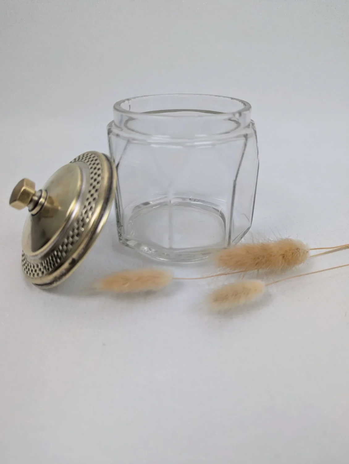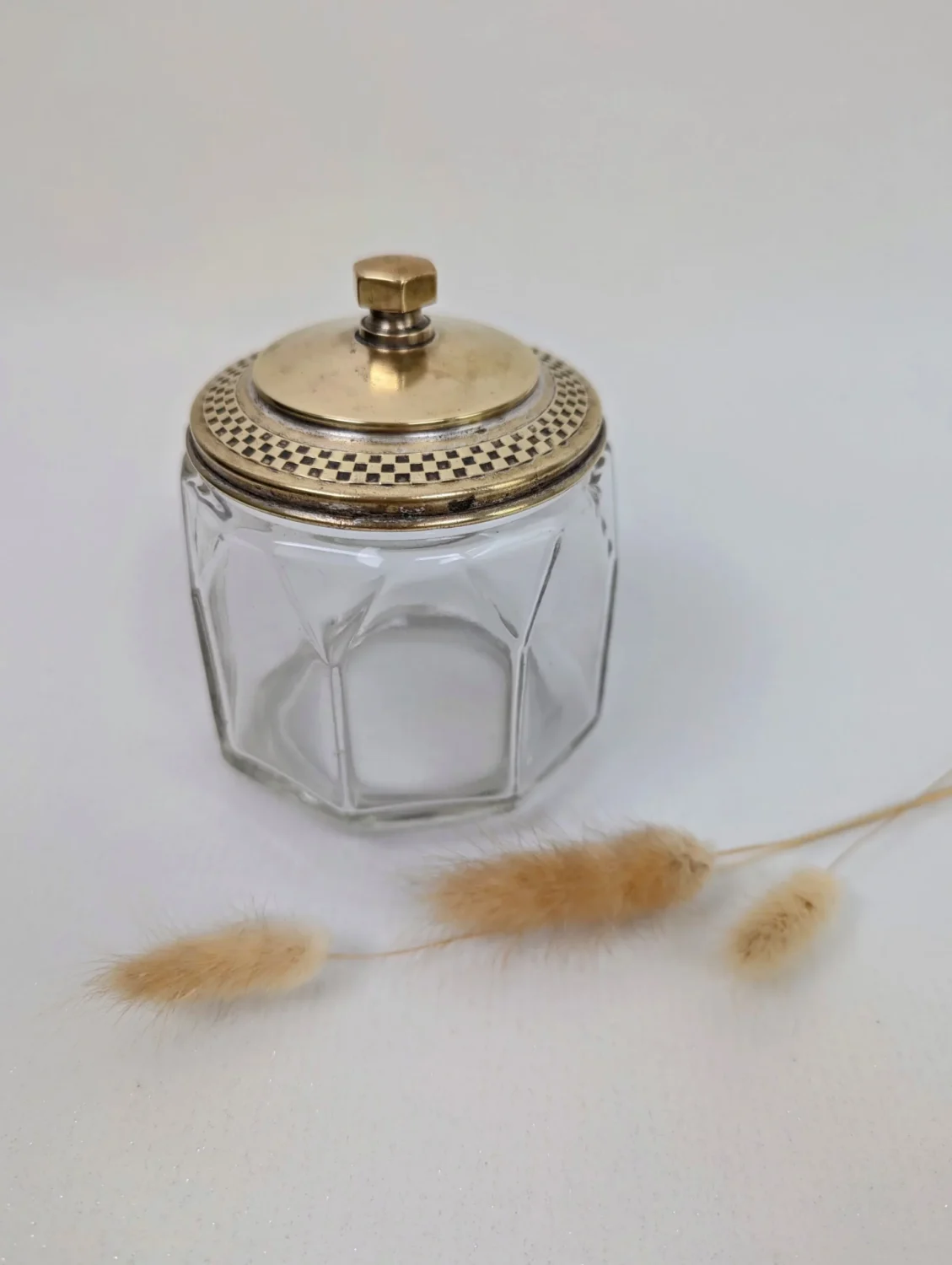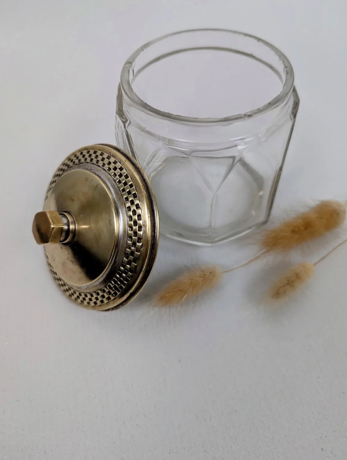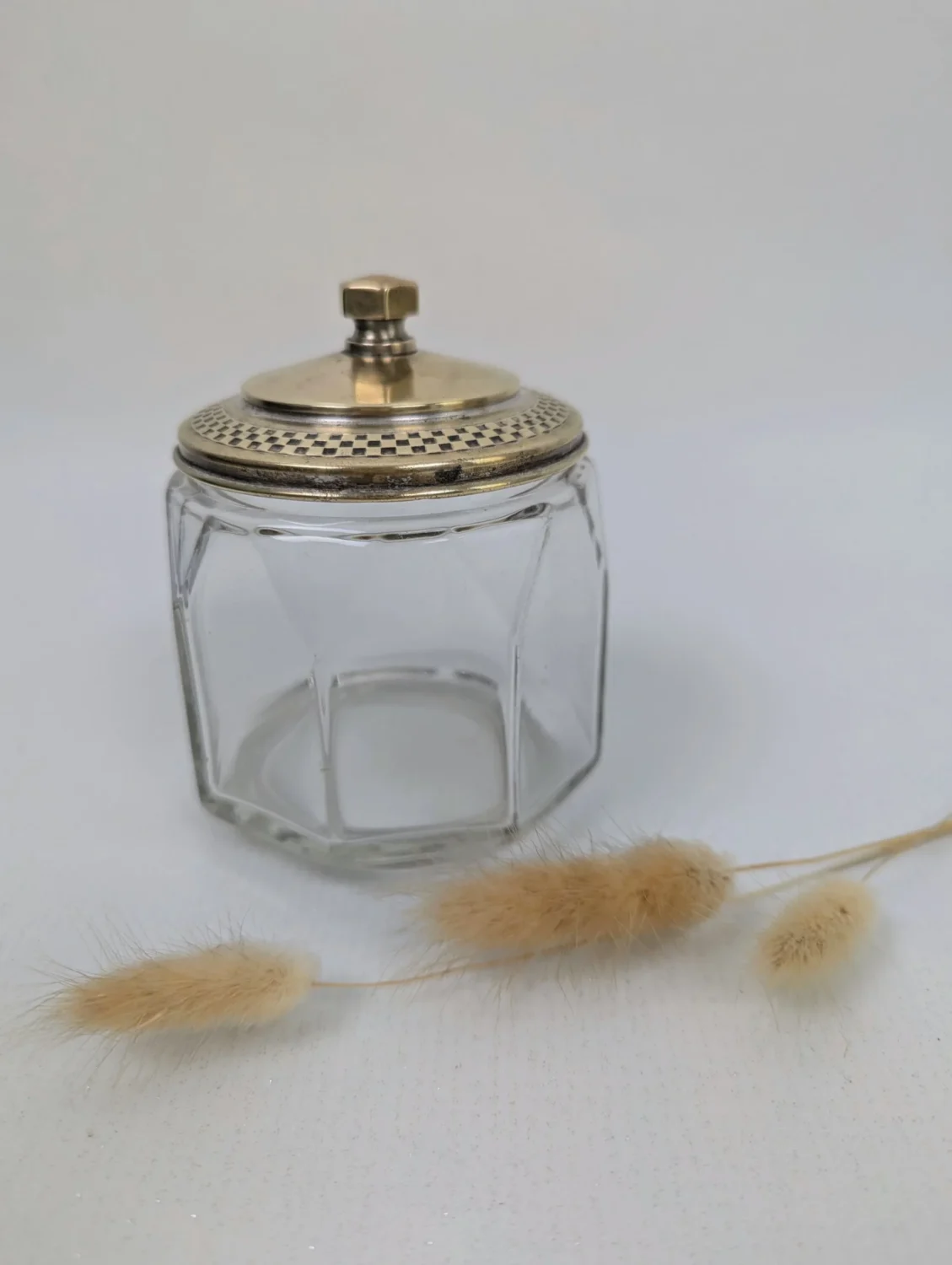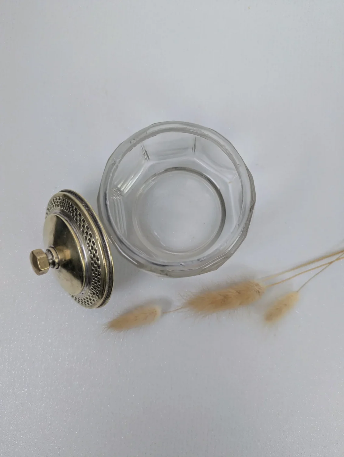 Charmant sucrier ou bonbonnière en verre à facettes et couvercle en métal doré.