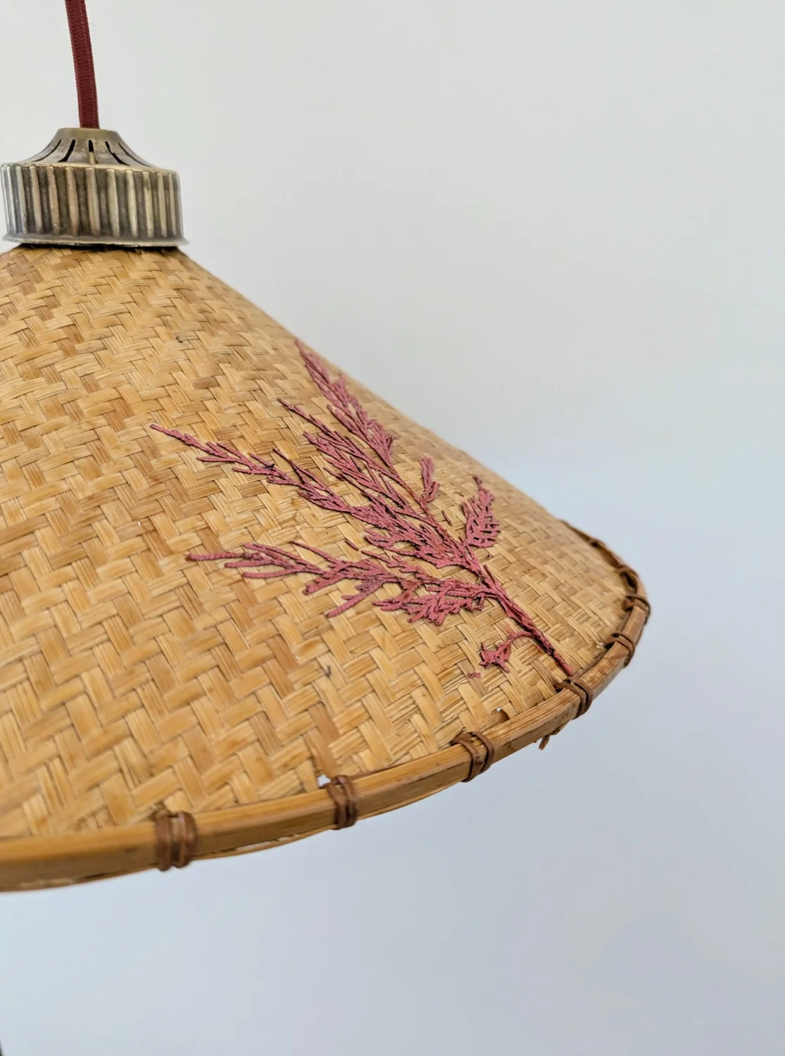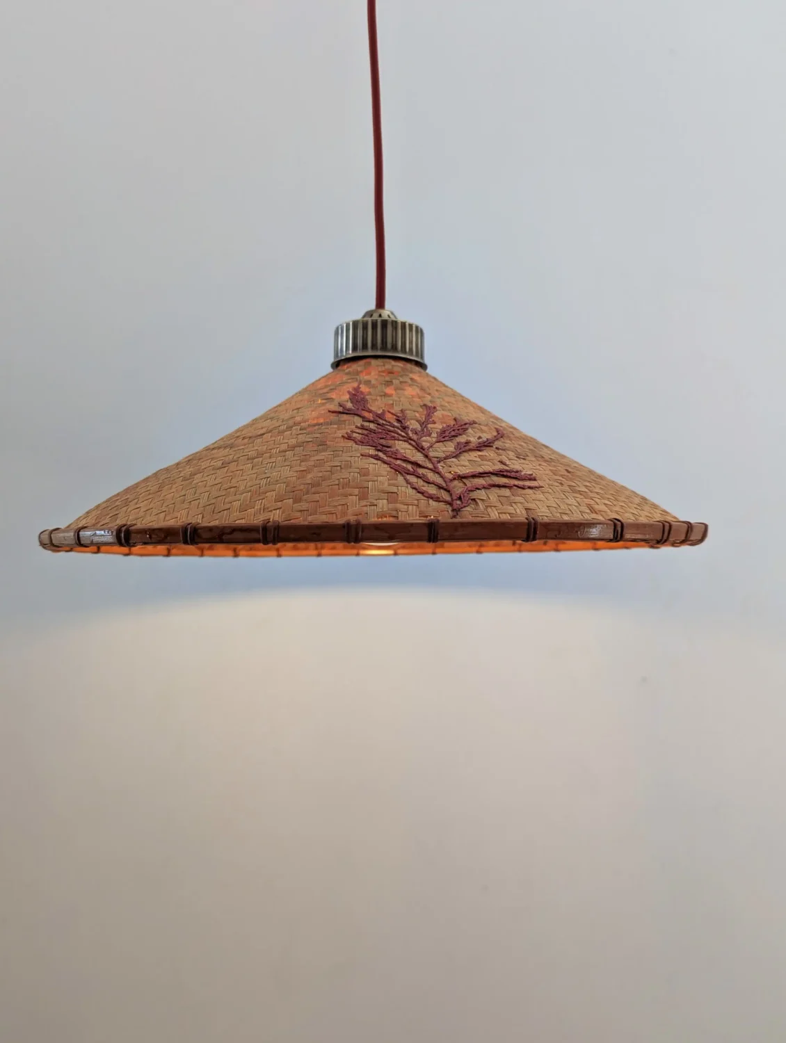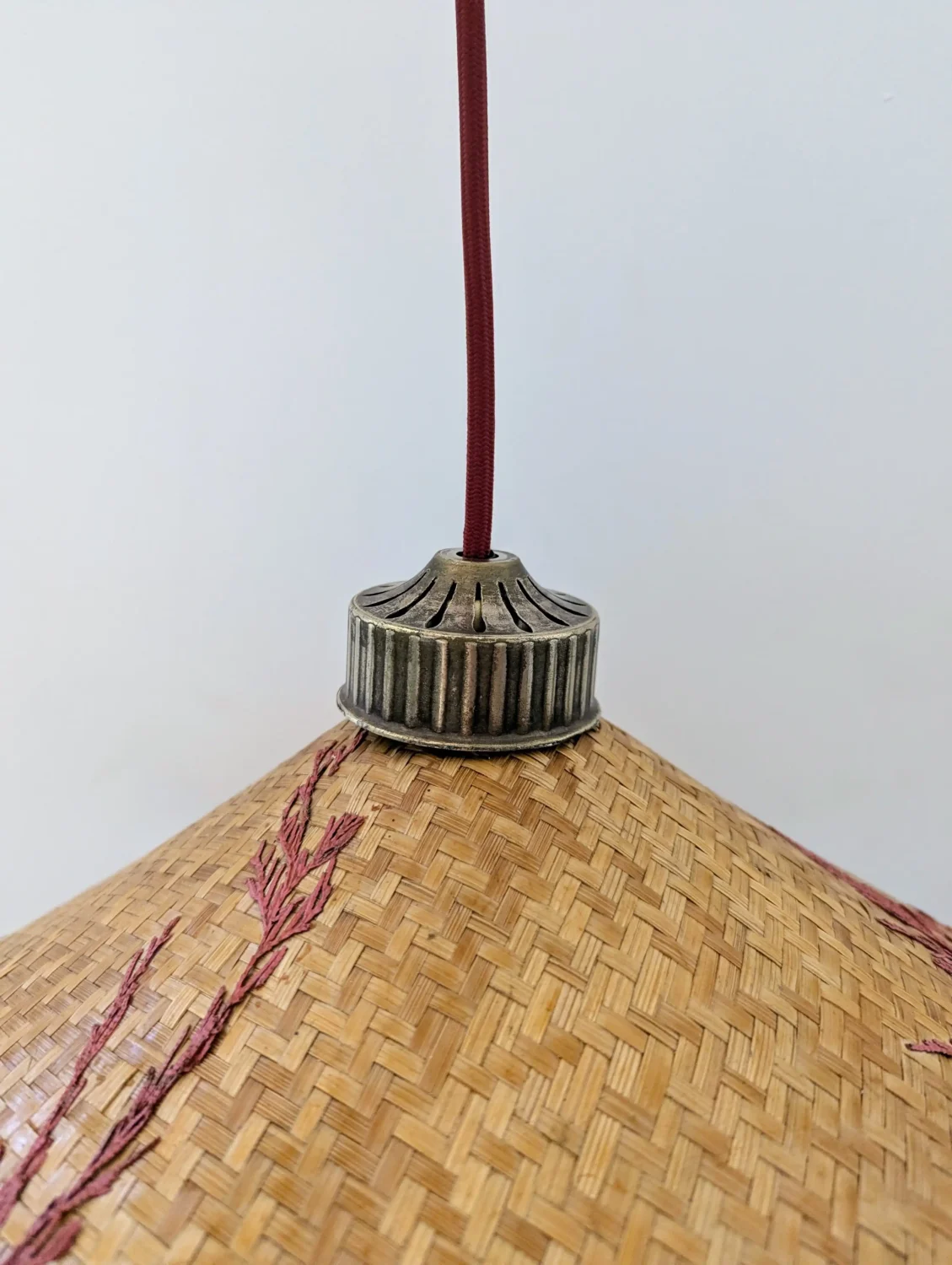 Cette suspension vintage en rotin allie élégance simple et poésie des objets du passé, car nous l’avons entièrement restaurée. Ensuite, sa forme conique fine s’inspire des chapeaux asiatiques traditionnels et se distingue par une broderie délicate représentant une branche végétale. De plus, cette broderie cousue à la main en teintes lie-de-vin rend la pièce à la fois sobre et résolument artistique.