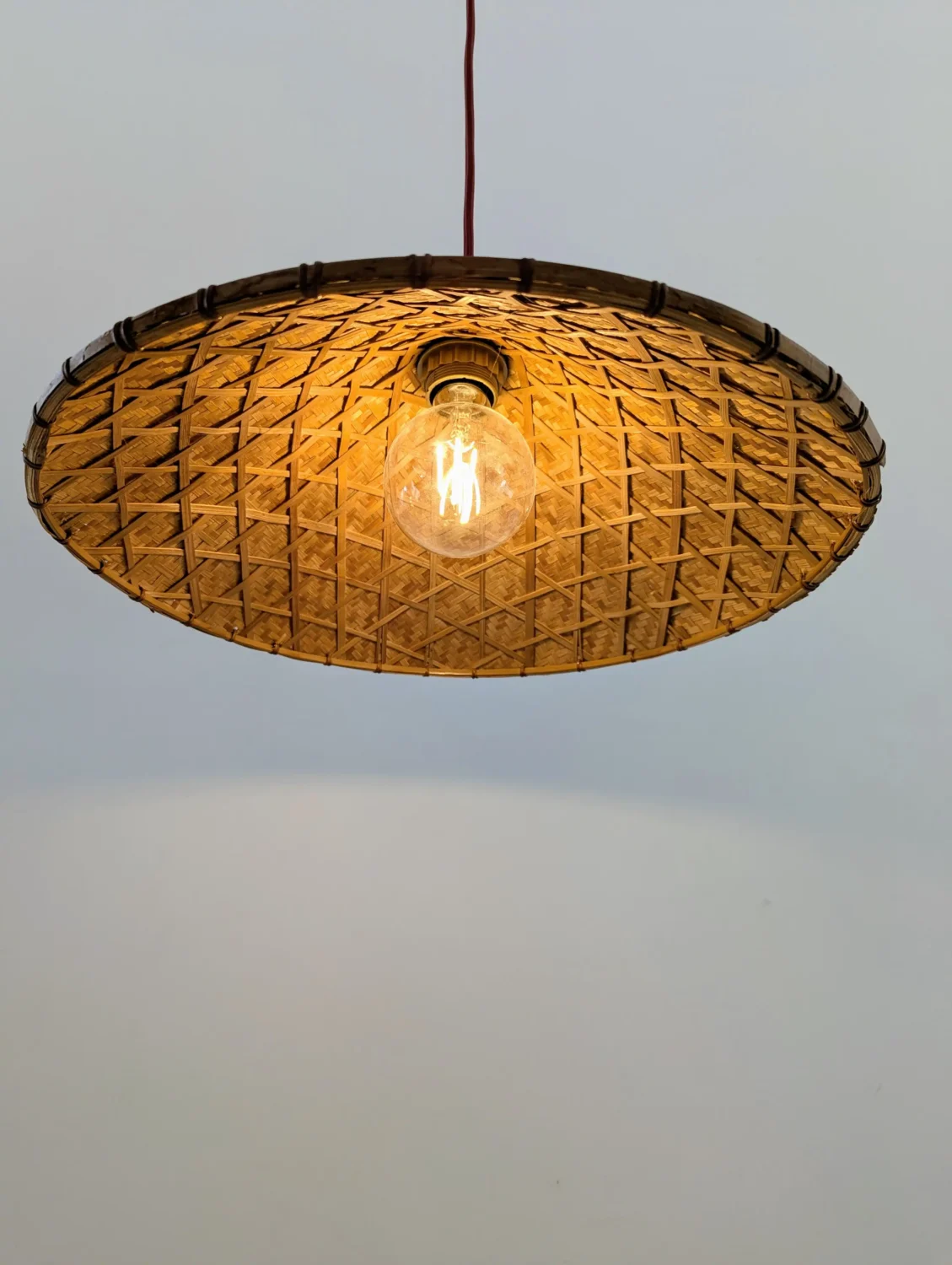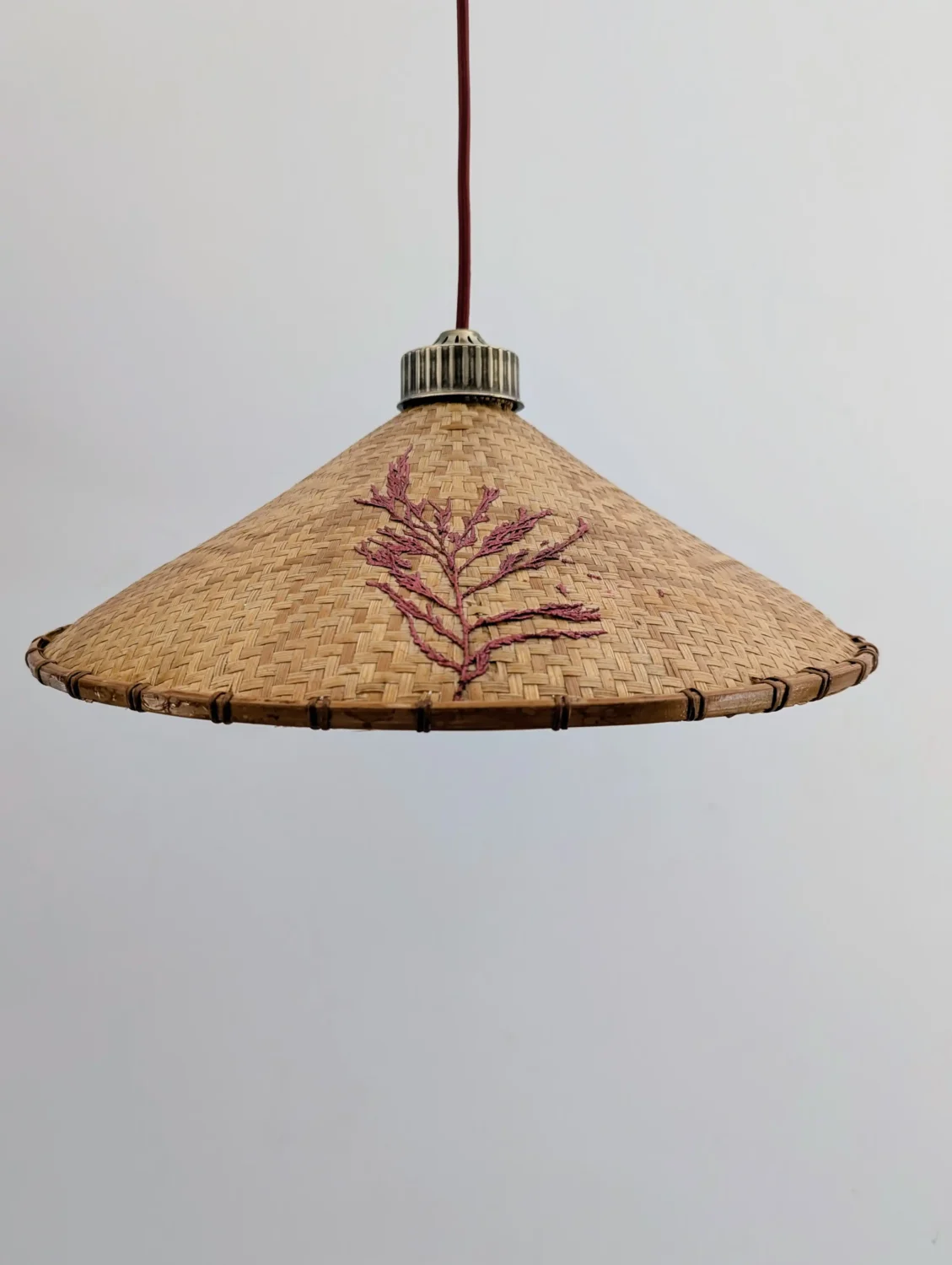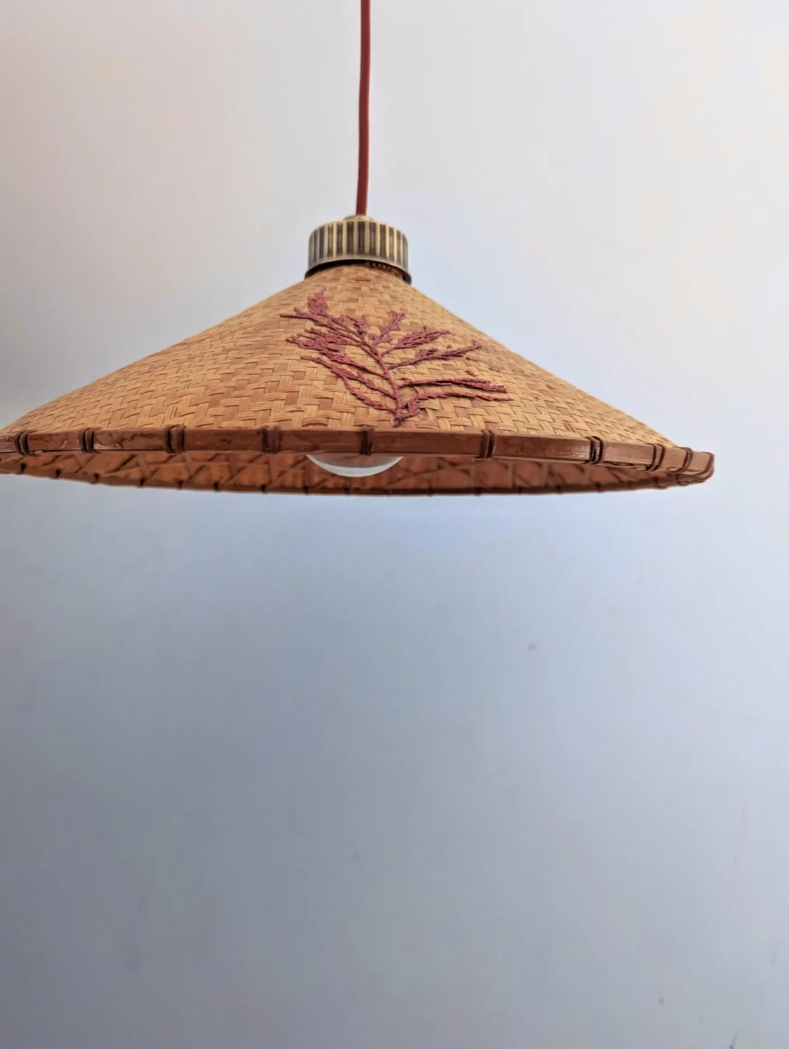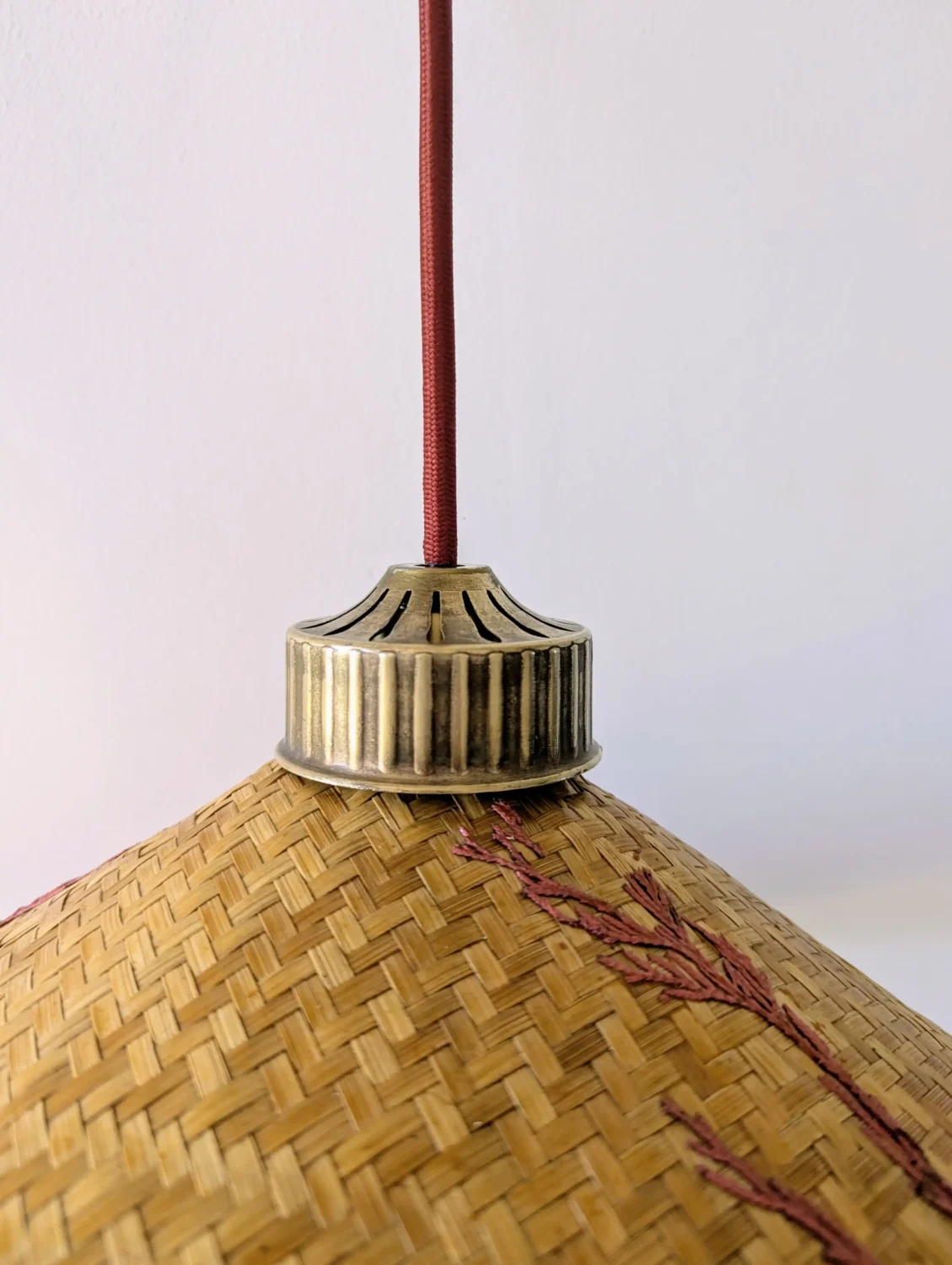 Cette suspension vintage en rotin allie élégance simple et poésie des objets du passé, car nous l’avons entièrement restaurée. Ensuite, sa forme conique fine s’inspire des chapeaux asiatiques traditionnels et se distingue par une broderie délicate représentant une branche végétale. De plus, cette broderie cousue à la main en teintes lie-de-vin rend la pièce à la fois sobre et résolument artistique.