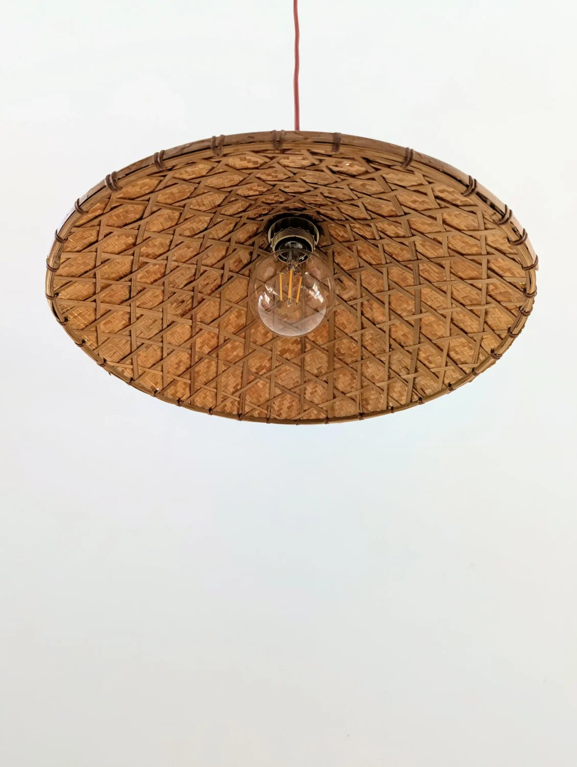 Suspension vintage conique en rotin brodé : un objet rare, restauré avec soin