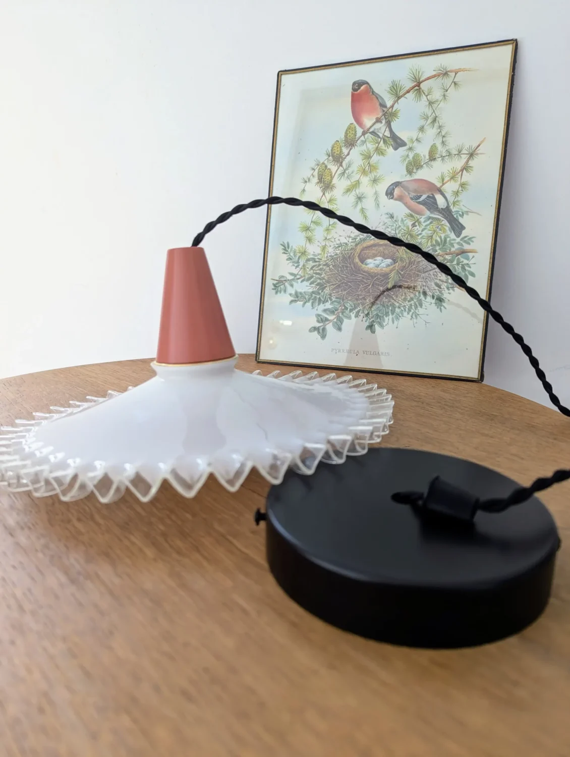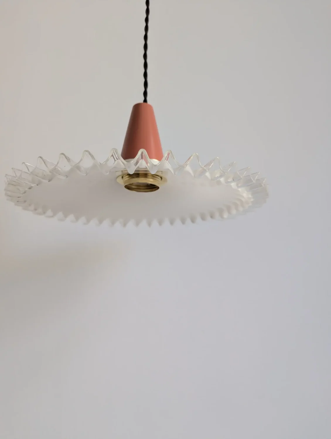 Illuminez votre intérieur avec cette suspension en verre opaline vintage dentelée, au charme rétro et au design unique.