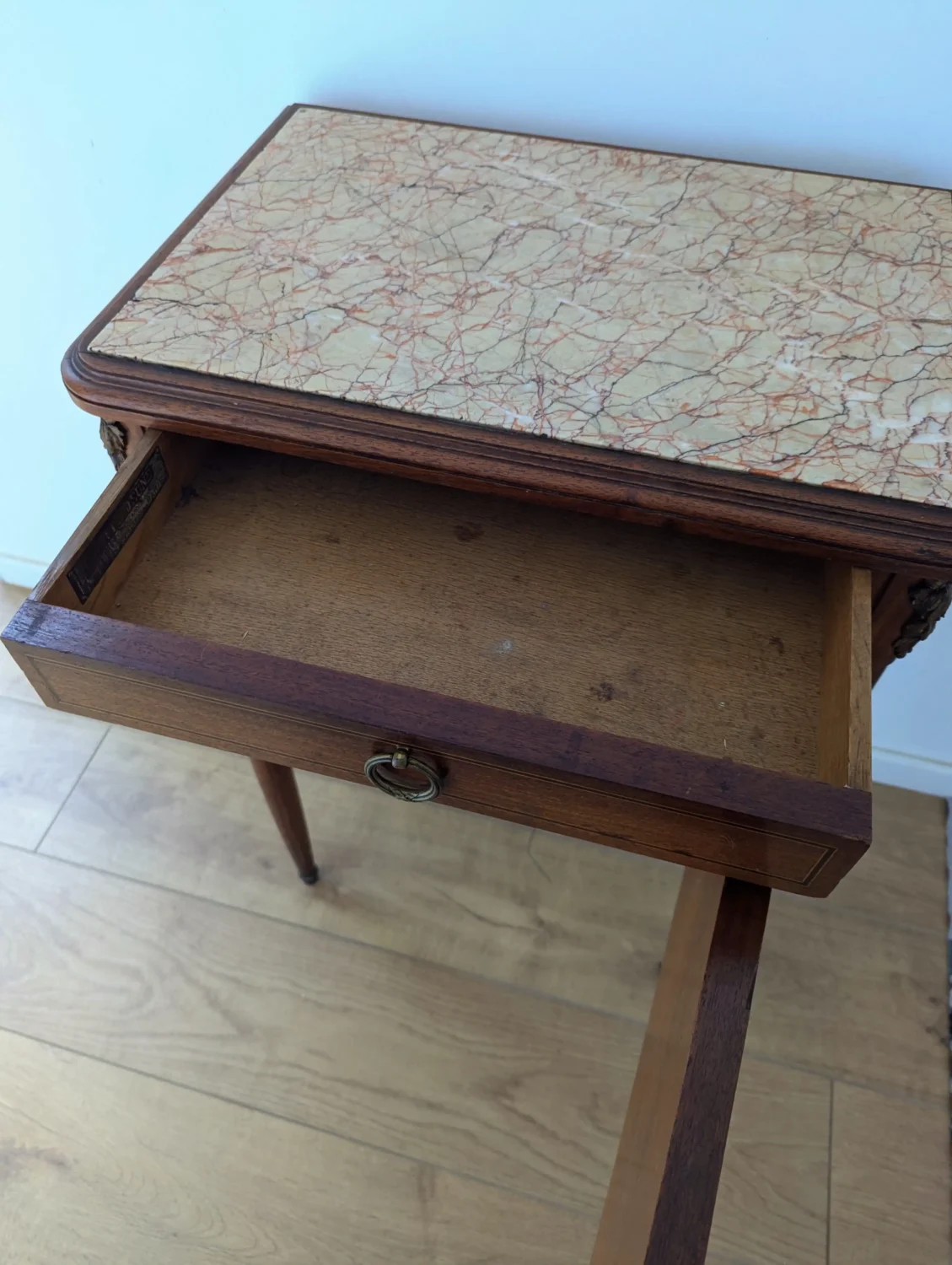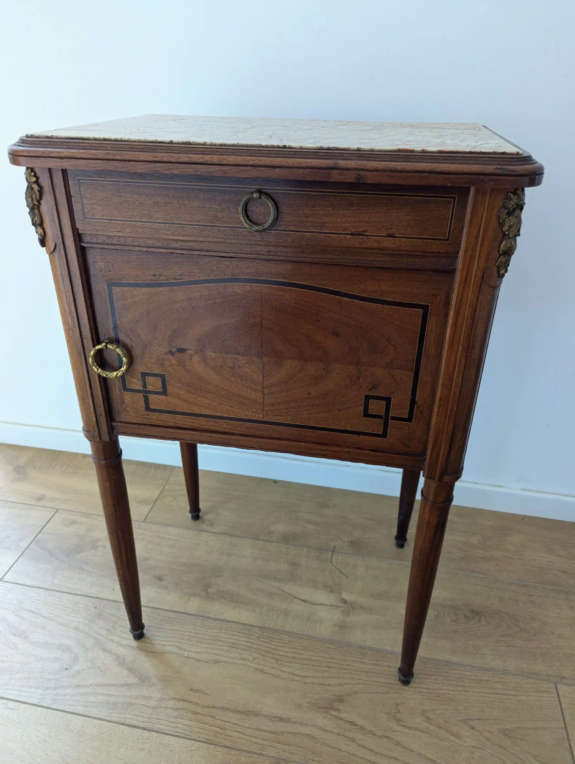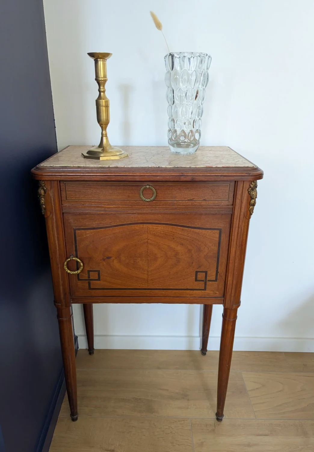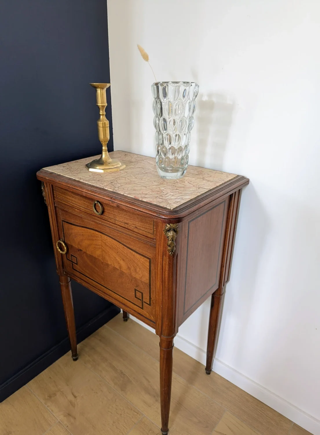 Table de chevet ancienne en bois marqueté et marbre rose style Louis XVI : une pièce d’exception