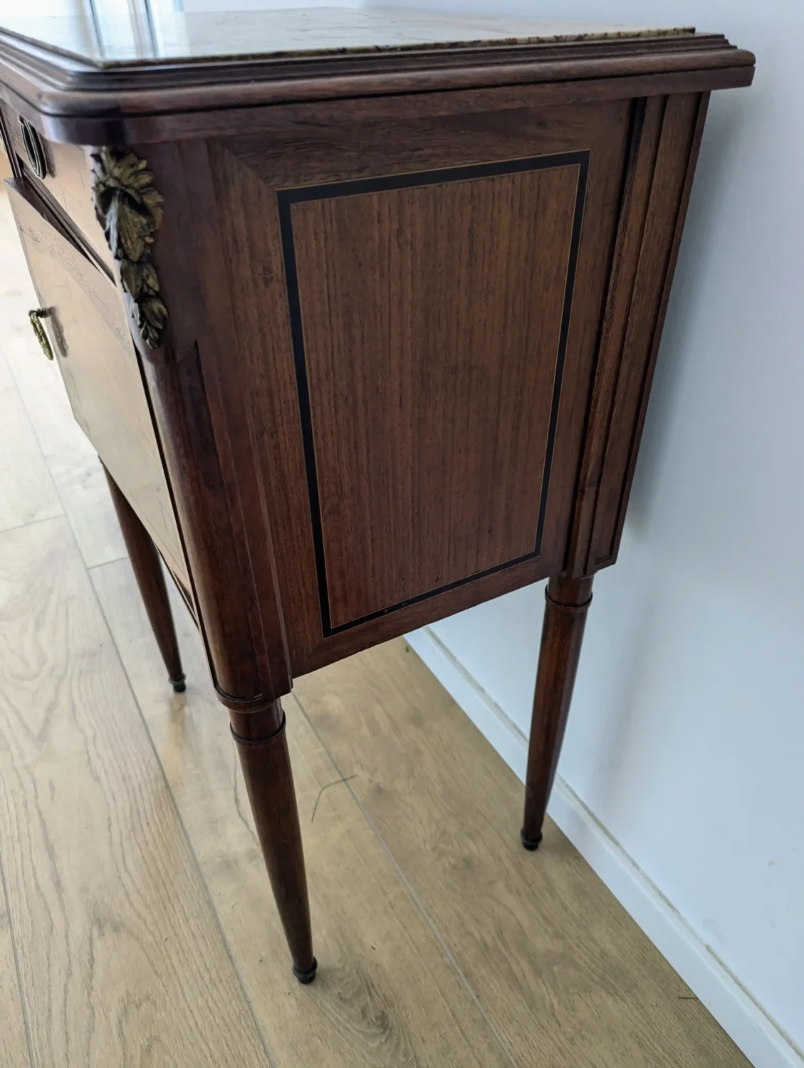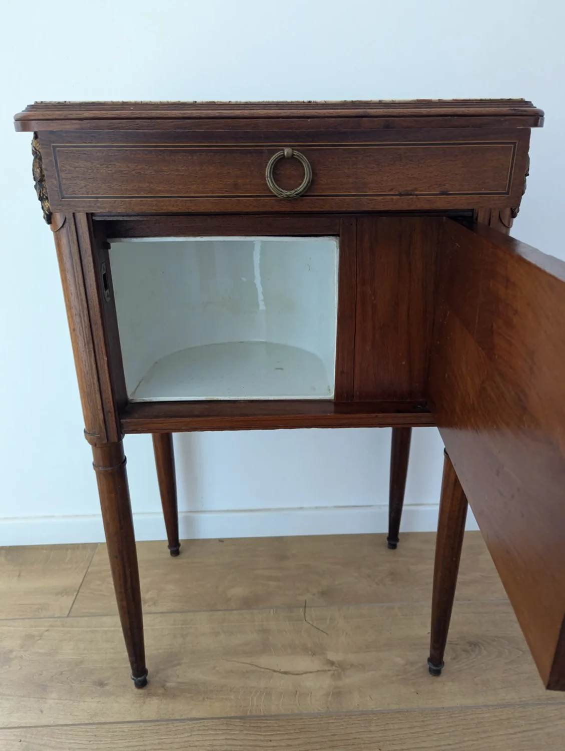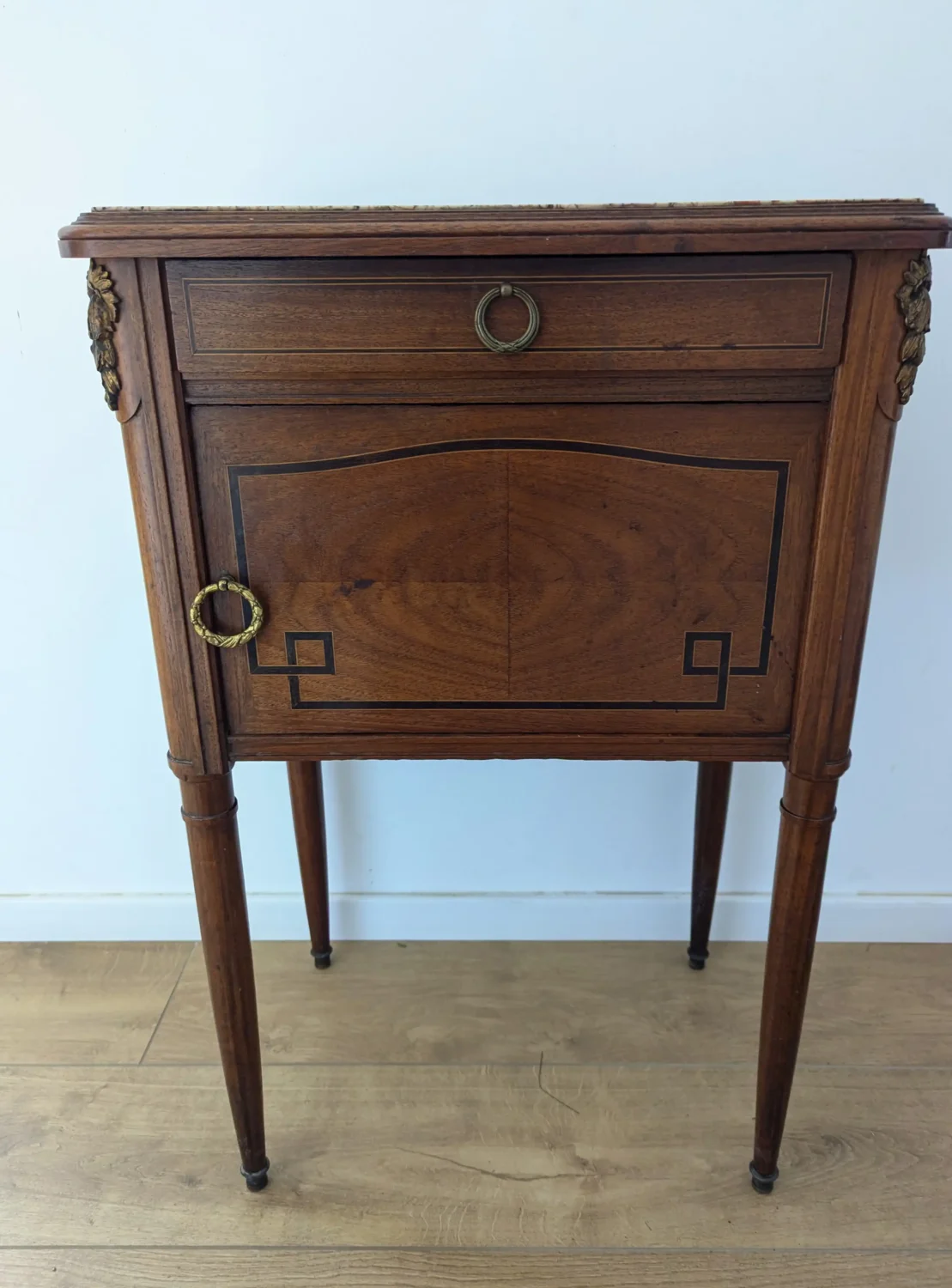Table de chevet ancienne en bois marqueté et marbre rose style Louis XVI : une pièce d’exception