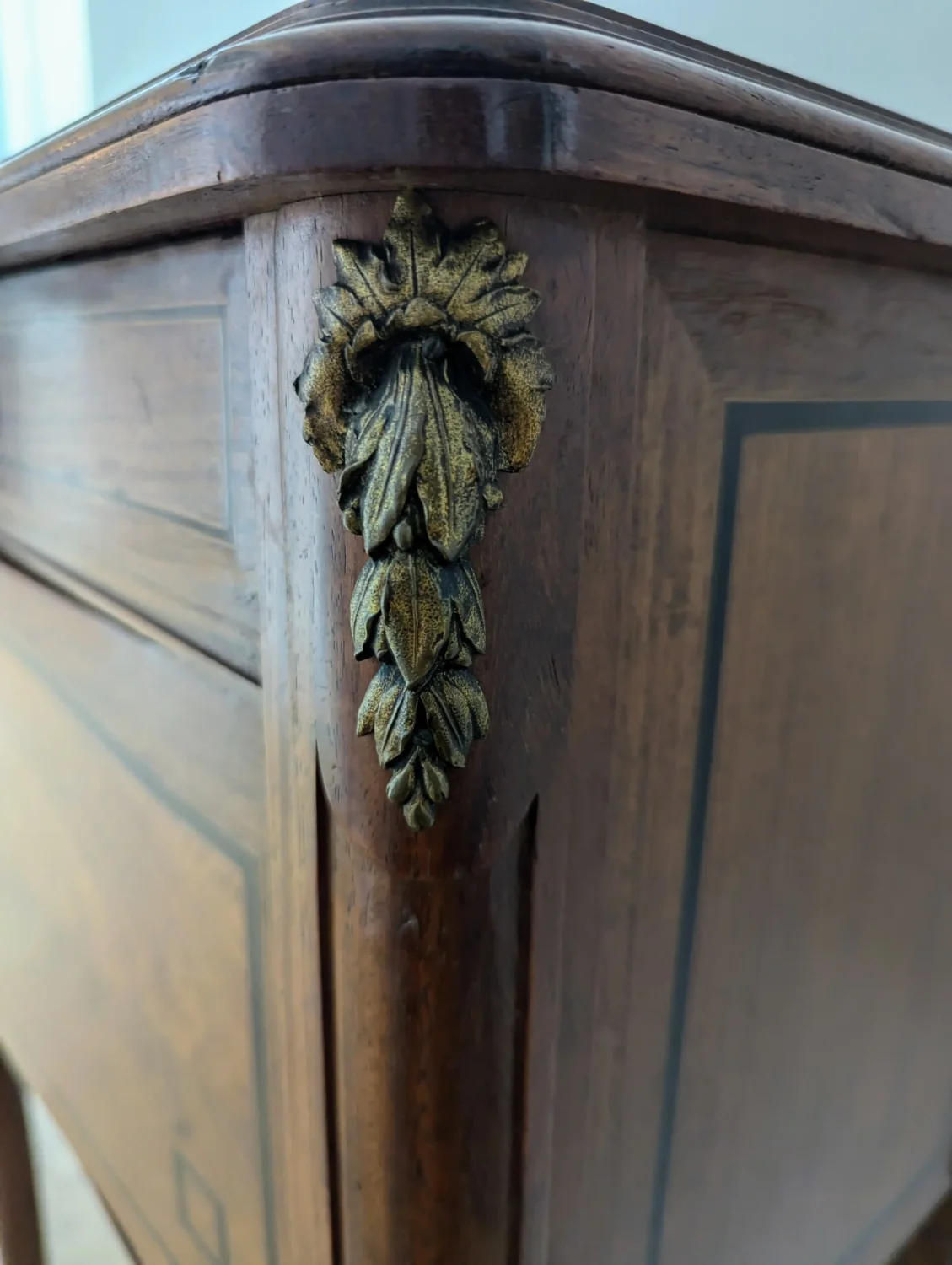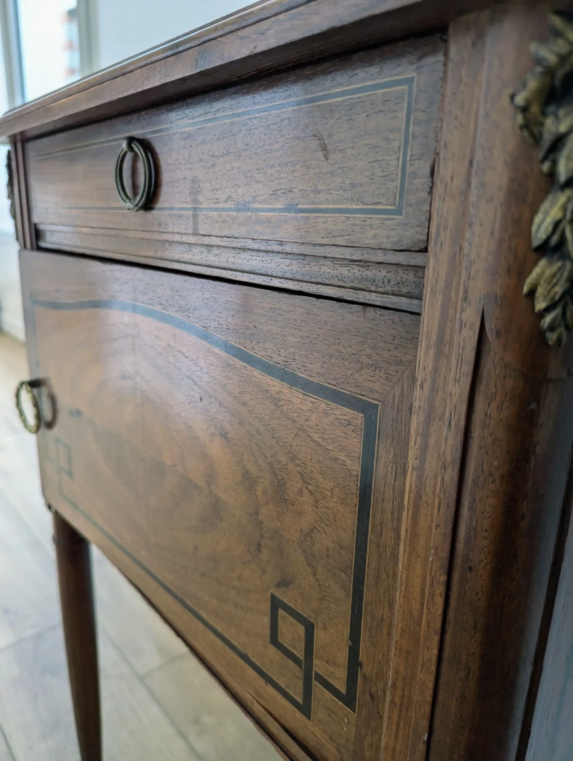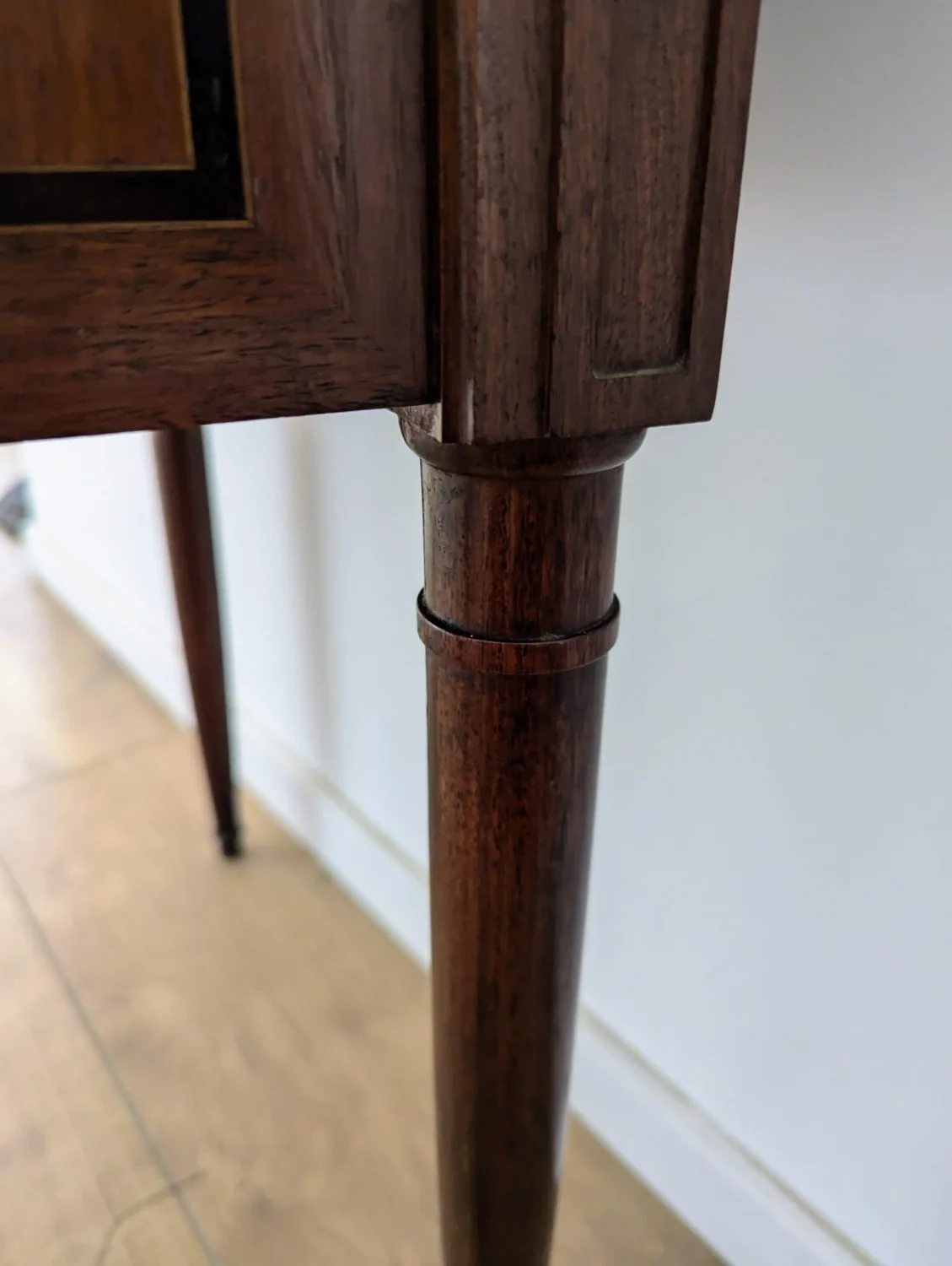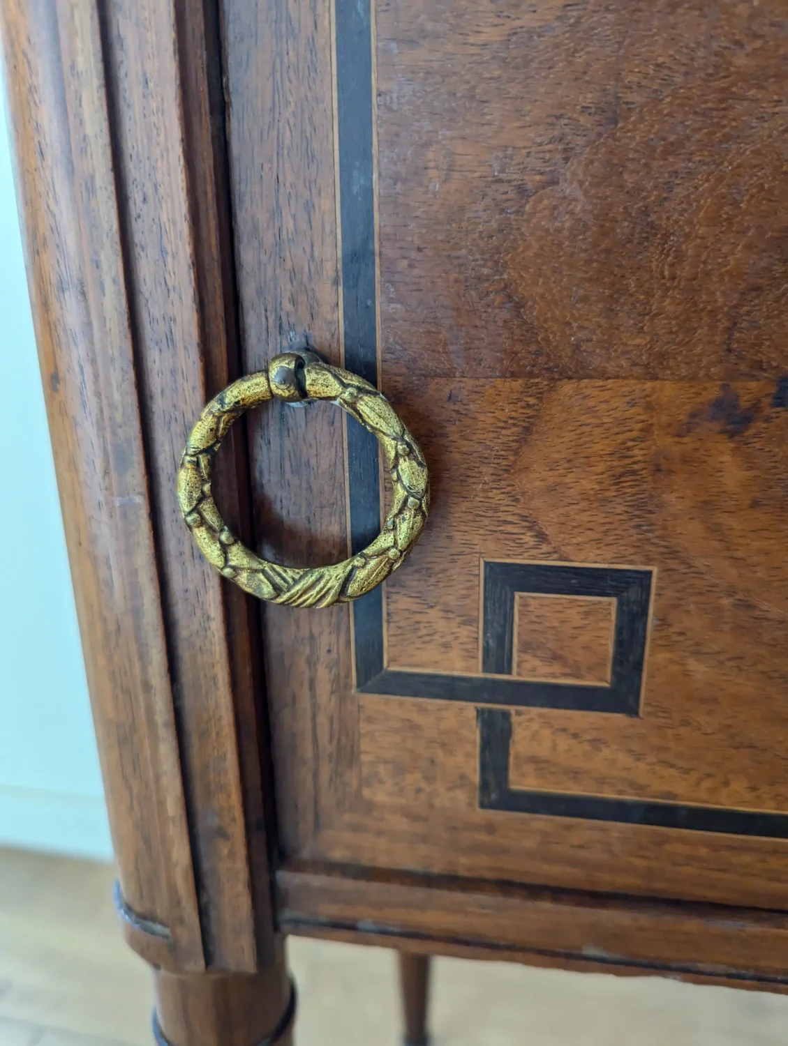 Table de chevet ancienne en bois marqueté et marbre rose style Louis XVI : une pièce d’exception
