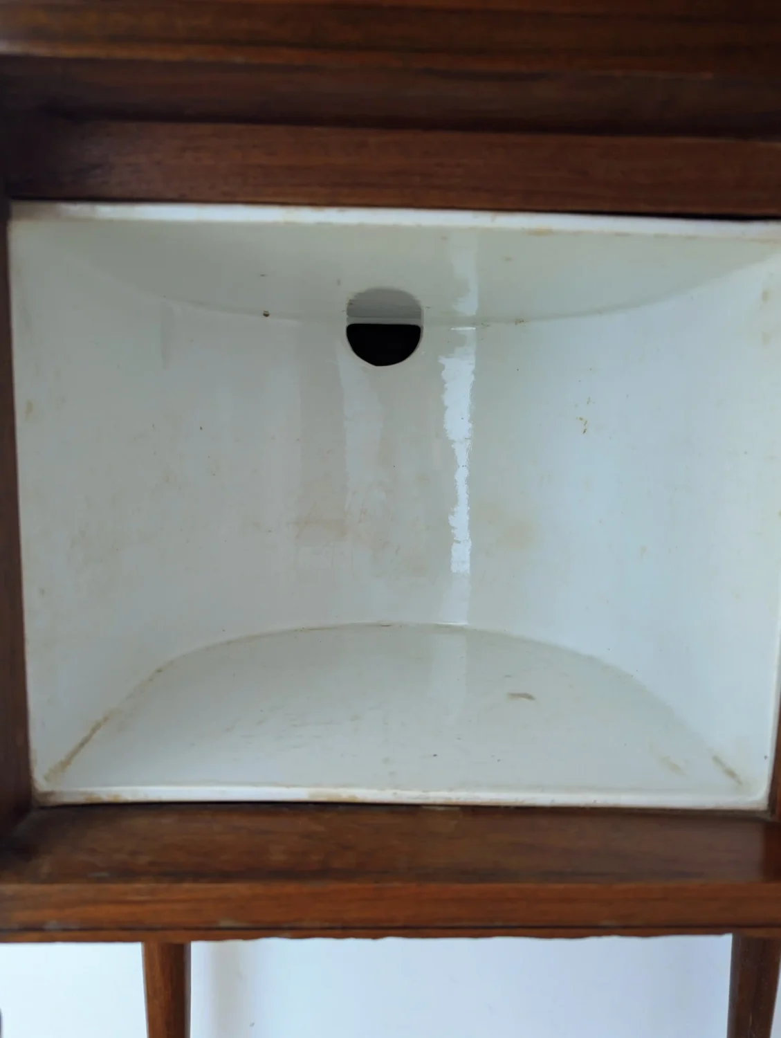 Le meuble comporte un tiroir supérieur, un rangement bas fermé. Il est équipé d’un petit cabinet en céramique blanche. Les éléments coulissent parfaitement. Les poignées en laiton doré, aux formes harmonieuses, ajoutent une touche lumineuse à l’ensemble.
