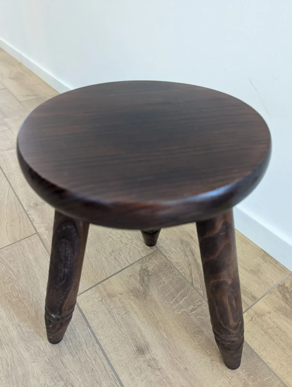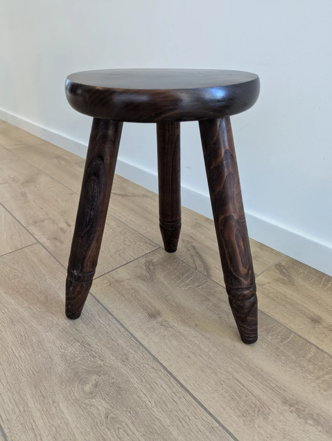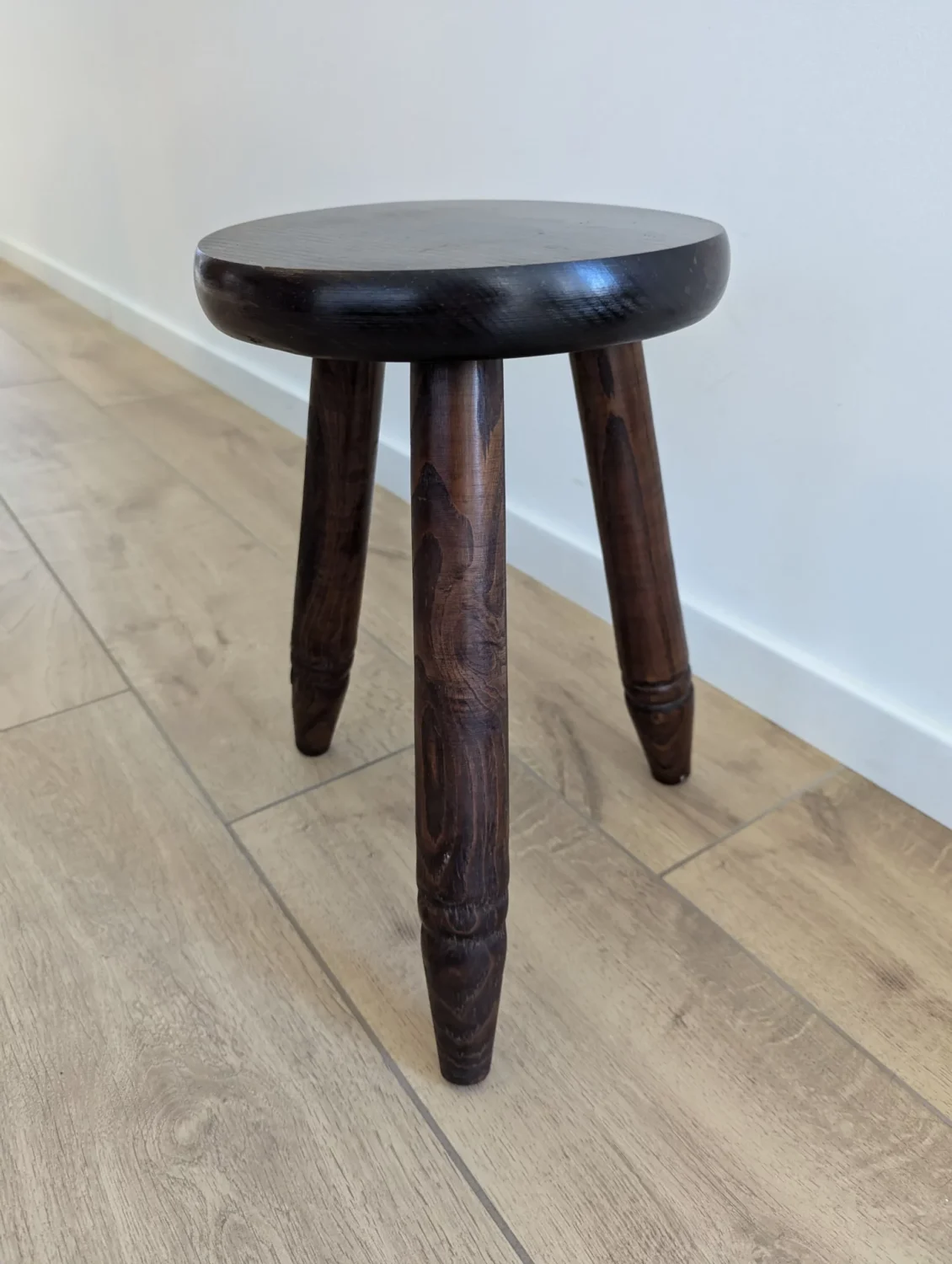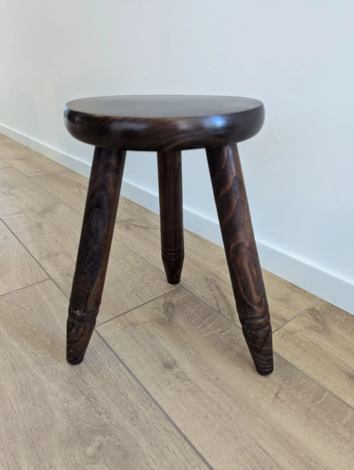 Tabouret vintage bois foncé à trois pieds : authenticité et sobriété