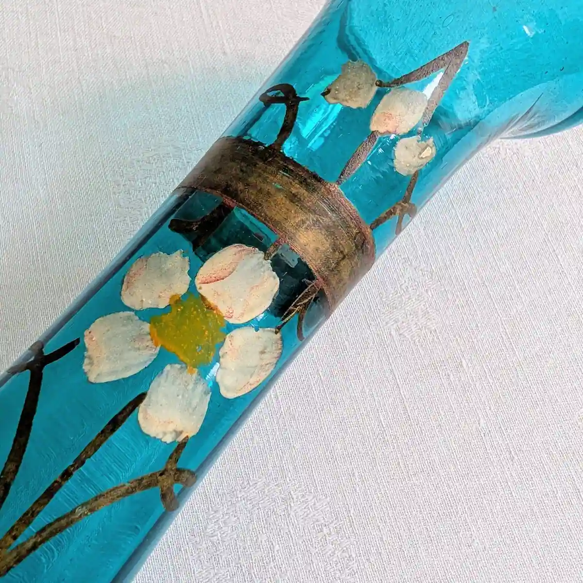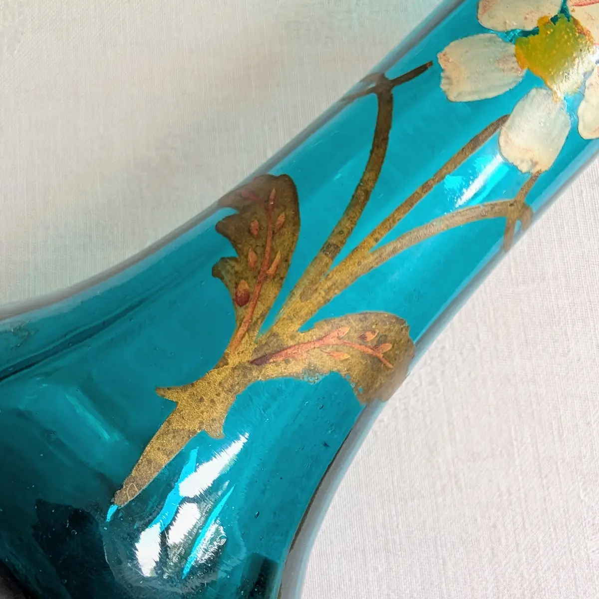 Plusieurs indices d’expertise confirment son époque : la présence de petites bulles d’air emprisonnées dans la masse du verre (typiques du soufflage d’époque), la technique d’émaillage à la main dont on perçoit les reliefs, et l’absence de marque de moule industrielle moderne. C’est un objet vintage authentique du début du siècle.