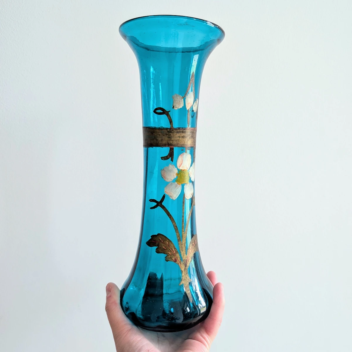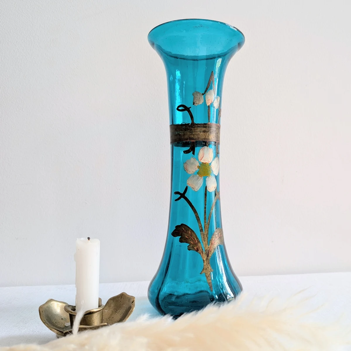 Ce vase ancien en verre bleu émaillé s’inscrit dans la production verrière européenne du début du XXe siècle, vraisemblablement entre 1900 et 1920. À cette époque, la maîtrise du verre soufflé et moulé permettait de créer des formes élancées d’une grande régularité tout en conservant les caractéristiques de l’artisanat. Le verre teinté dans la masse offre ici une profondeur que seul le travail à chaud permet d’obtenir. Le décor floral, quant à lui, utilise la technique de l’émail peint à la main. Contrairement à une impression mécanique, chaque trait de pinceau est ici perceptible, rendant cet objet authentique et irremplaçable. La frise dorée, appliquée avec précision, souligne le col évasé et assoit la silhouette de l’objet.
