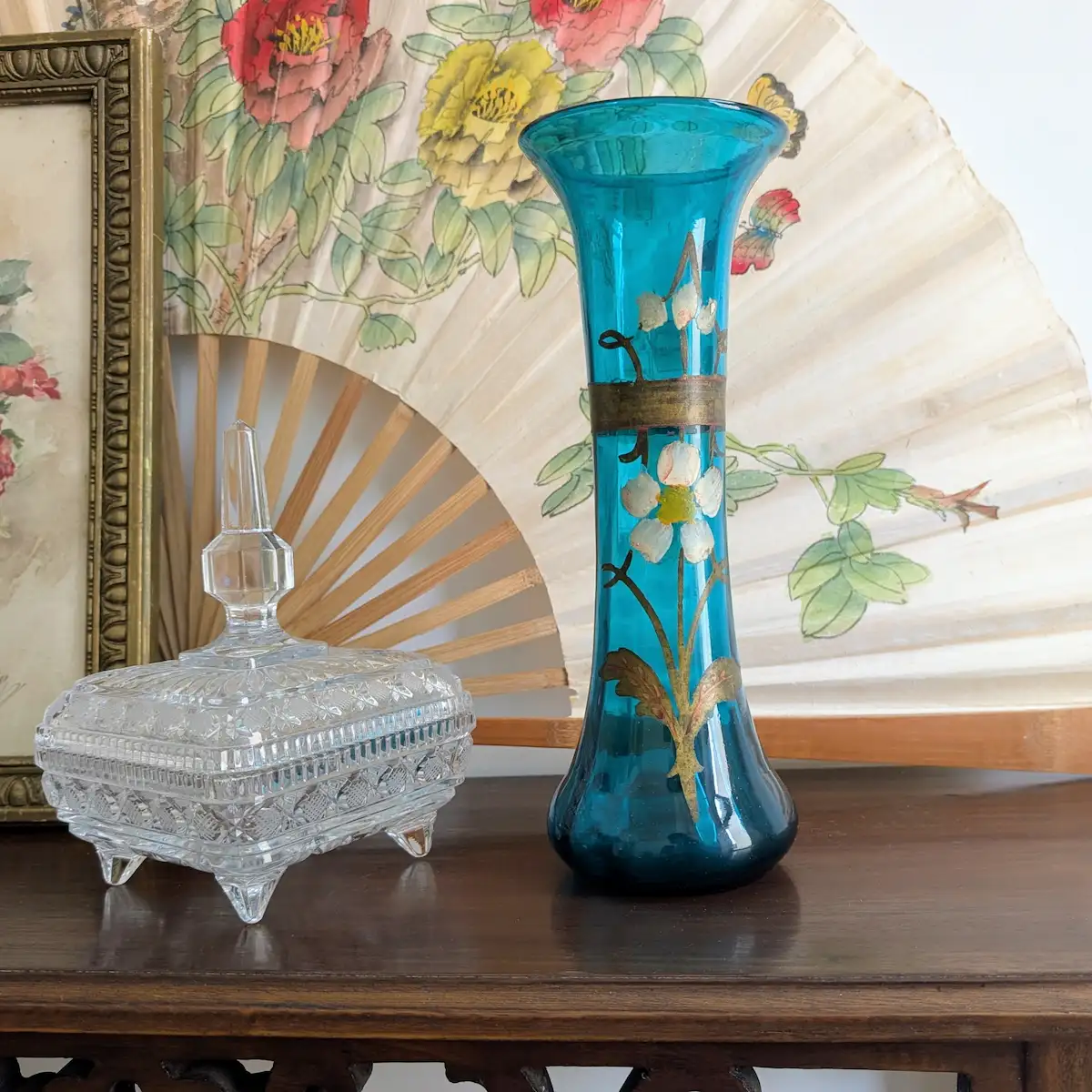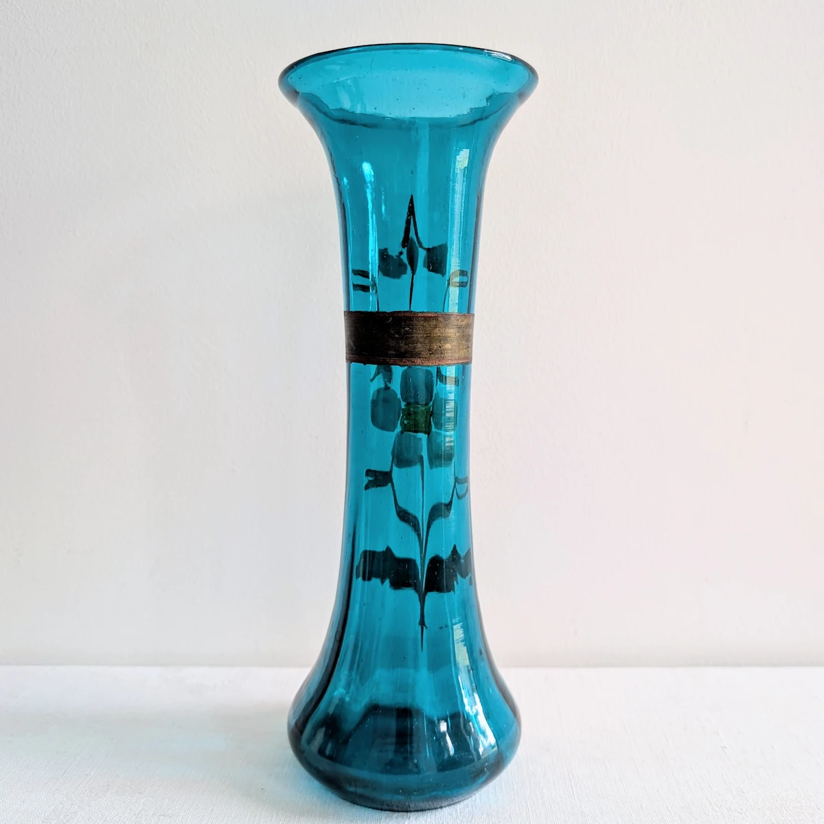Placé sur un buffet ou à proximité de sculptures anciennes, ce vase crée un jeu de reflets fascinant. Sa teinte bleue, si particulière, se marie avec élégance aux patines du temps, qu’il s’agisse de bois brut ou de métaux dorés. Sa valeur décorative réside dans cet équilibre fragile entre la robustesse du verre soufflé et la préciosité de son décor doré, aujourd’hui légèrement estompé par les décennies, ce qui lui confère son identité de véritable objet ancien.