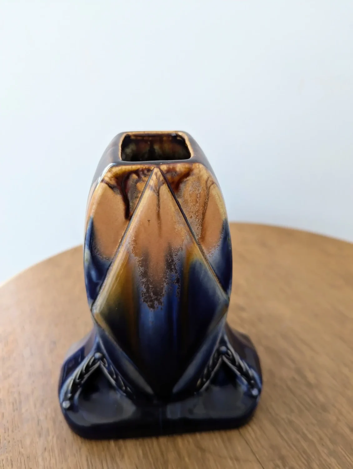 Ce vase Art Déco vintage en faïence est une très belle illustration du style Art Déco belge des années 30 à 40. Avec ses formes angulaires caractéristiques, sa silhouette symétrique et ses couleurs profondes, il attire immédiatement le regard.
