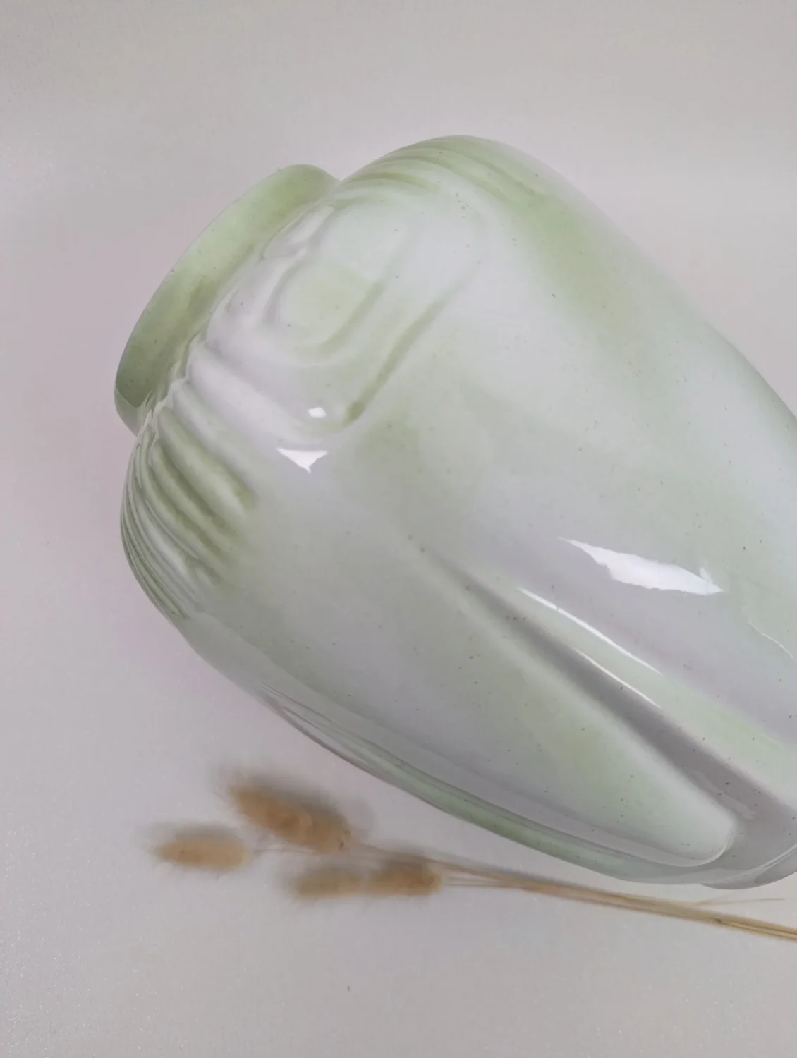 Ce vase en barbotine vert tendre mesure 27 cm de hauteur et incarne le style Art Nouveau, caractérisé par ses motifs inspirés de la nature. La finesse des reliefs, associée à une palette de teintes subtiles, confère à cette pièce une élégance intemporelle qui traverse les époques.