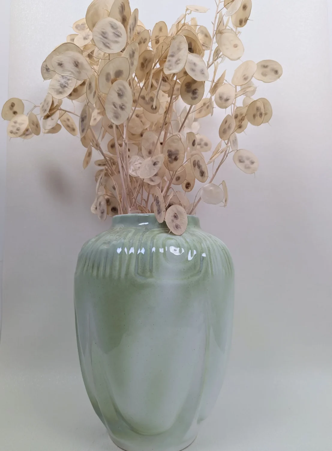 La barbotine, connue pour sa texture douce et son rendu mat, sublime les courbes du vase en apportant une profondeur visuelle et tactile. Grâce à ses nuances vert tendre, il s’intègre harmonieusement à des décors naturels, vintage ou bohèmes, favorisant une atmosphère paisible et poétique.