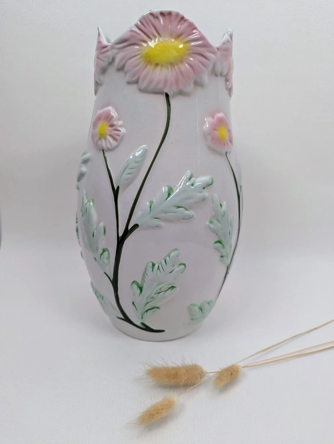 Ce grand vase en barbotine blanc, avec motifs de feuillage vert clair, de fleurs roses et jaunes, incarne parfaitement l’esthétique rétro chic. Son style floral s’inspire du travail de la faïence ancienne, où chaque détail contribue à créer un objet de caractère.